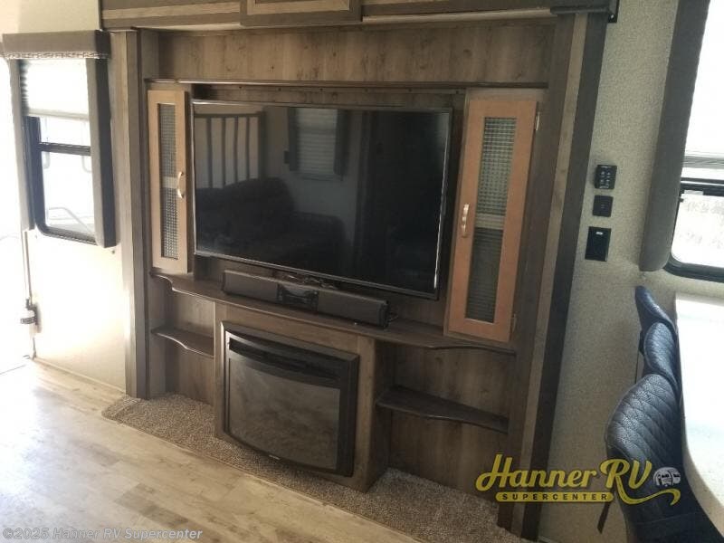 Looking to extend your travels on your next camping trip? This fifth wheel offers a unique rear kitchen with an L-shaped curved counter including three stools, and two refrigerators for all of your cooking and dining needs. There is a 55" HDTV and a fireplace centrally located for everyone in the kitchen and living area to enjoy. You will find four slide outs throughout providing additional floor space for all to move about comfortably. There is also a residential shower with a seat, and the front bedroom includes a closet that has been prepped for a washer and dryer if you choose to add those convenient appliances. Outside, you can cook using the premium outdoor convenience center, and watch TV if you brought yours along. Take a look!