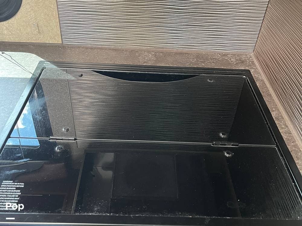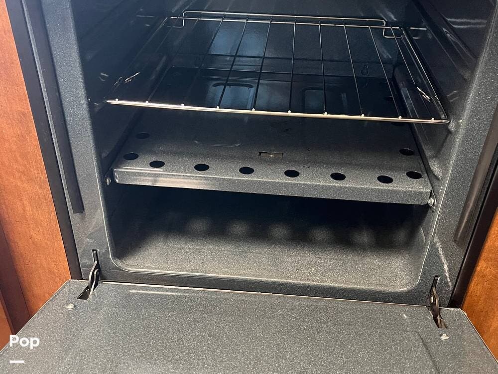 The kitchen is equipped with countertops, stainless steel appliances, a three-burner range, oven, and a large refrigerator, making meal prep on the road a breeze.