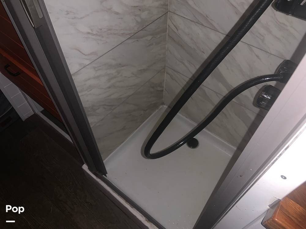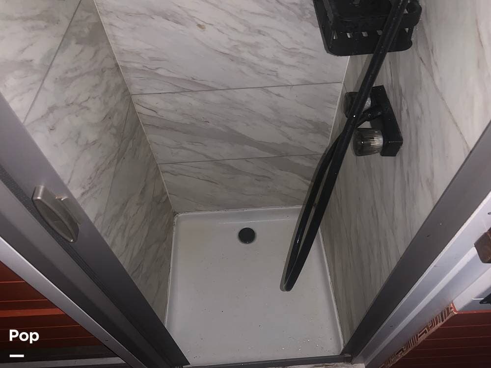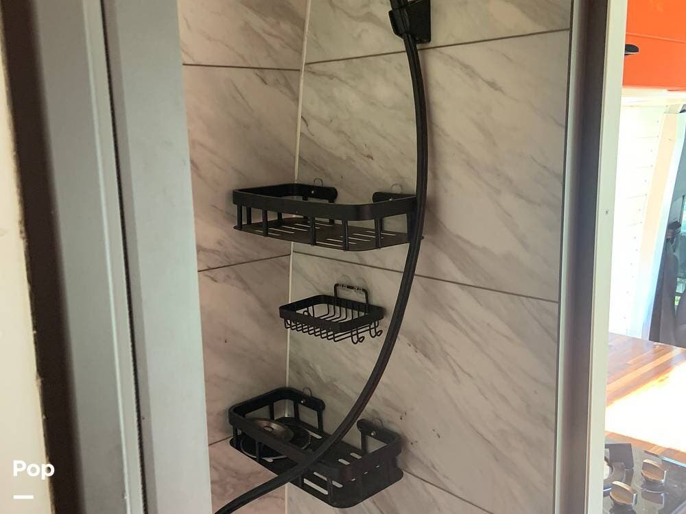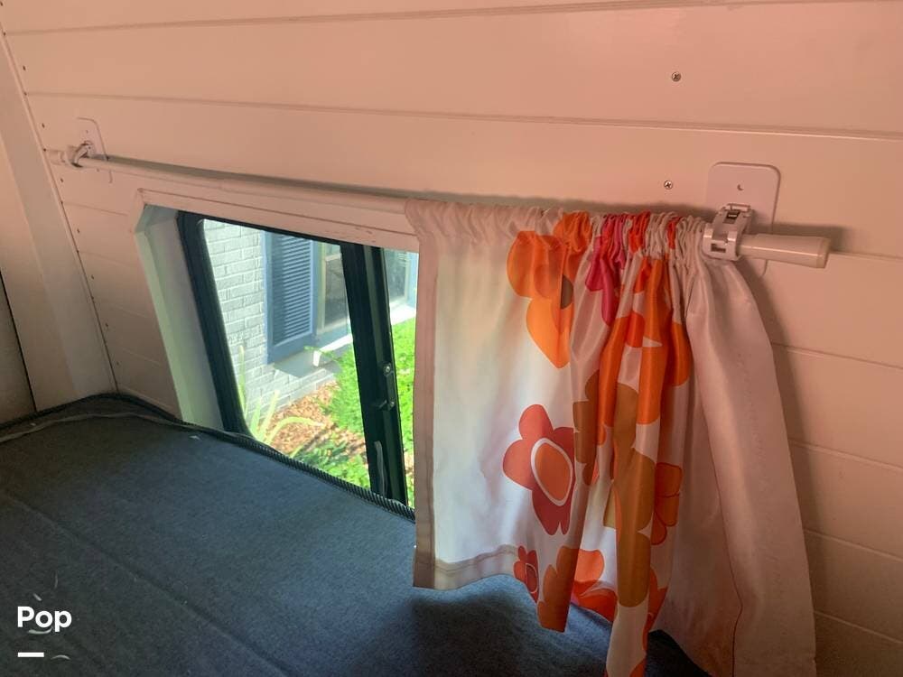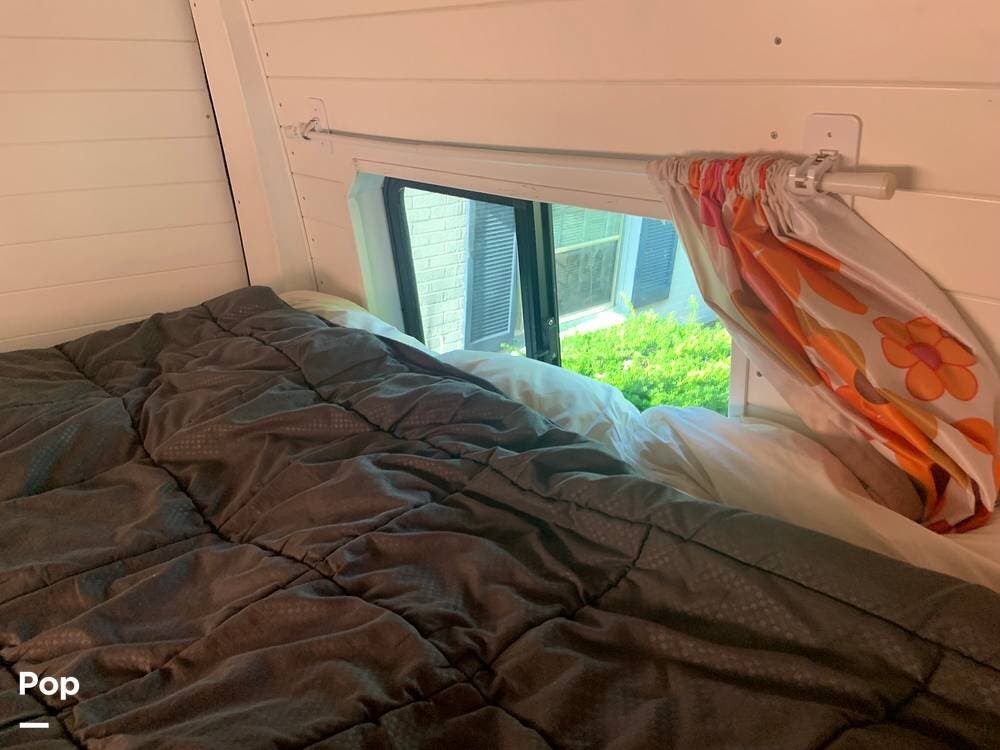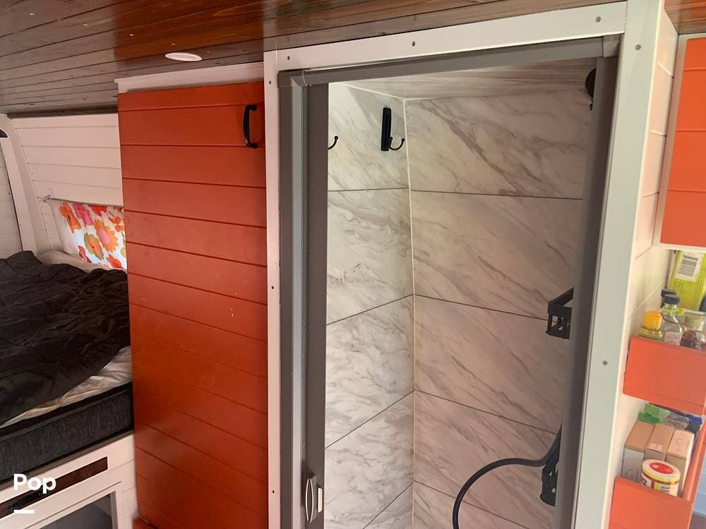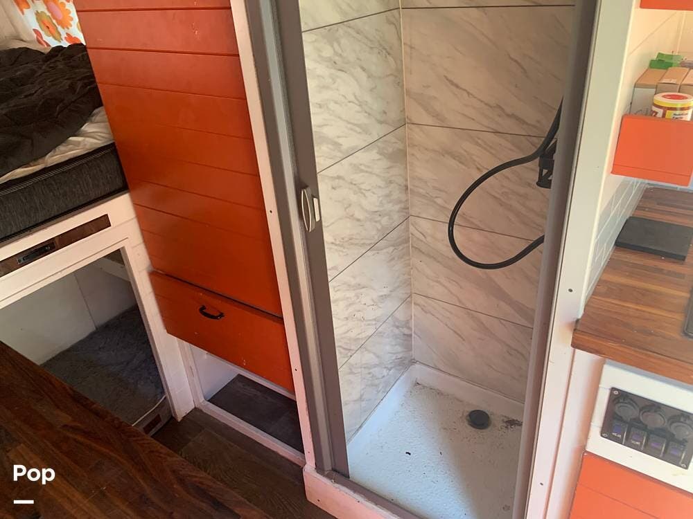 The bathroom features a stand-up shower, but the composting toilet (which would fit under the bed) has been removed and will remain with the seller for his next one.