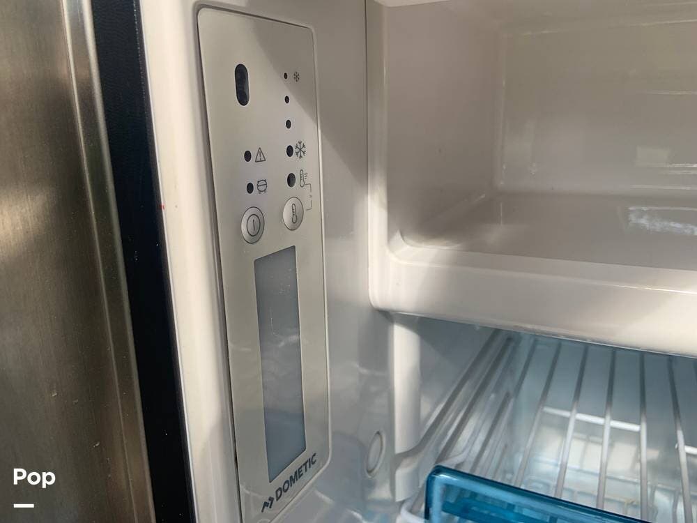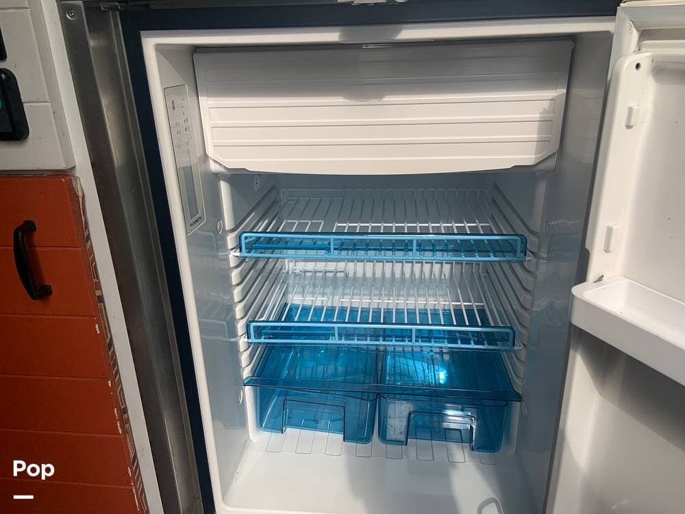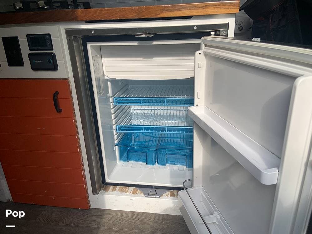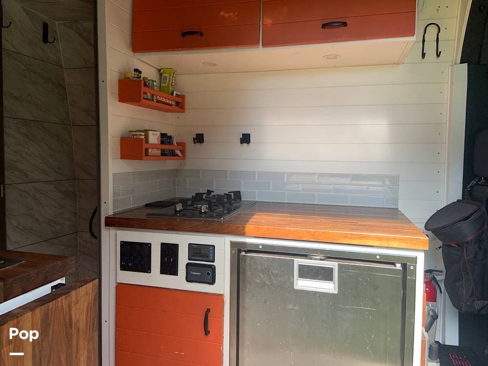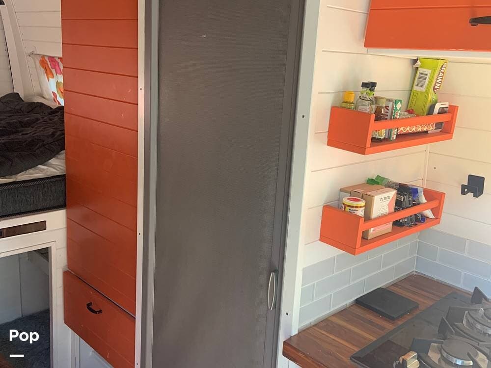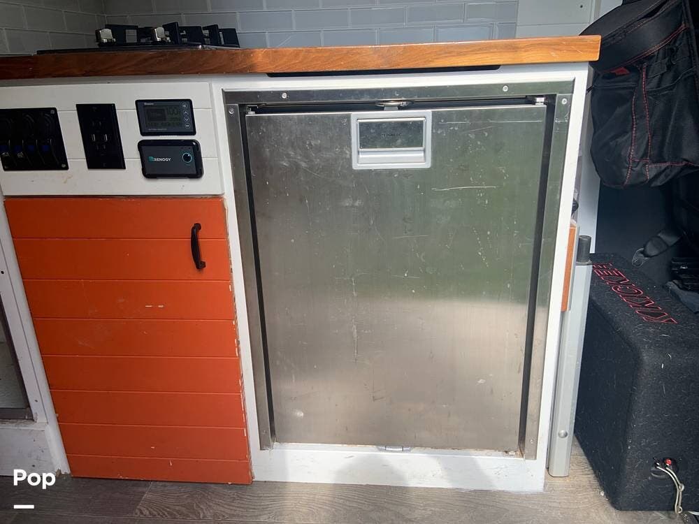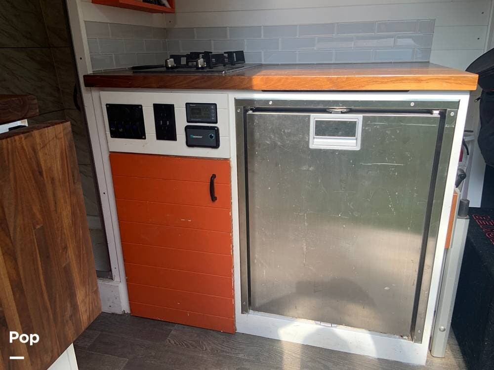 The refrigerator runs off of battery or shore power, and the van is also equipped with a propane stove and an electric water heater.