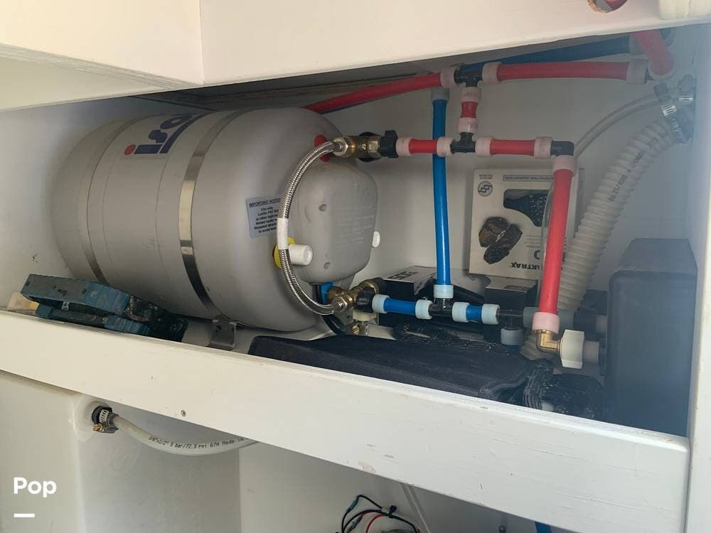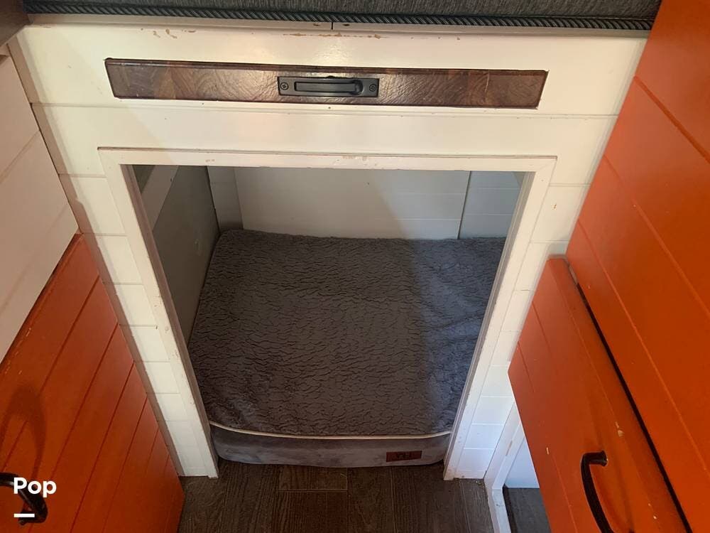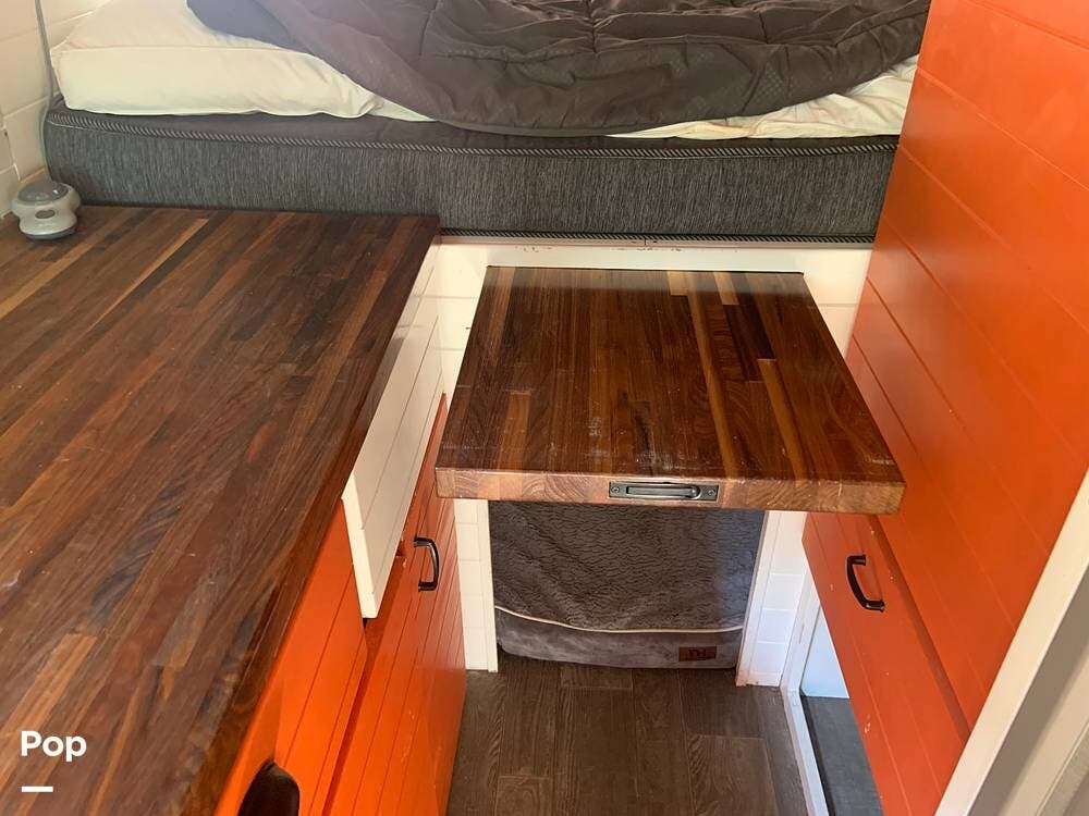 The bed is in the rear and comfortably sleeps two adults. There are cabinets throughout for plenty of storage for clothes and shoes, as well as utensils and food in the pantry/galley areas.