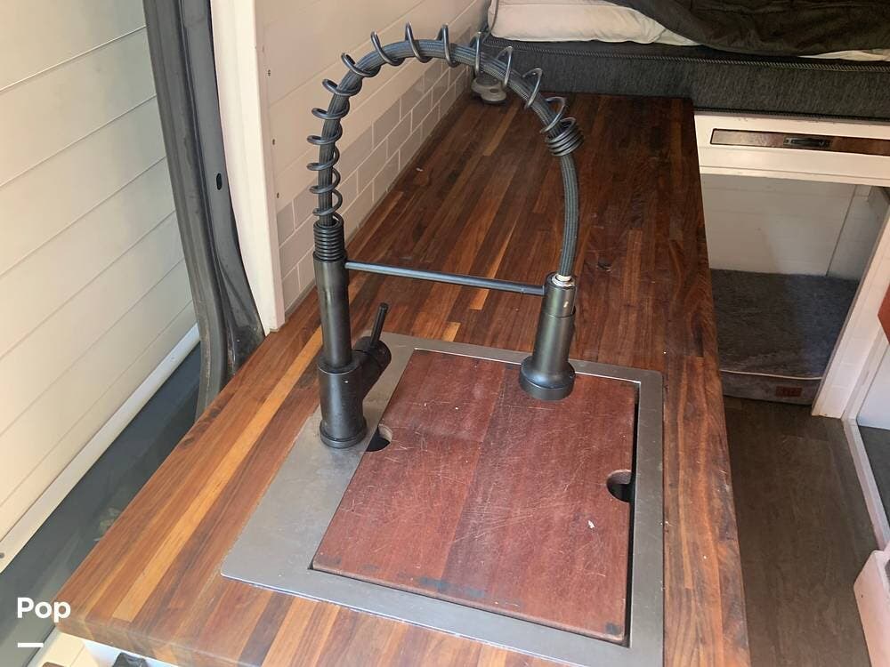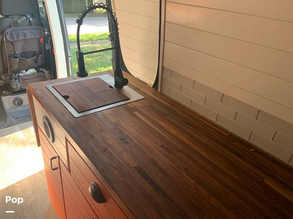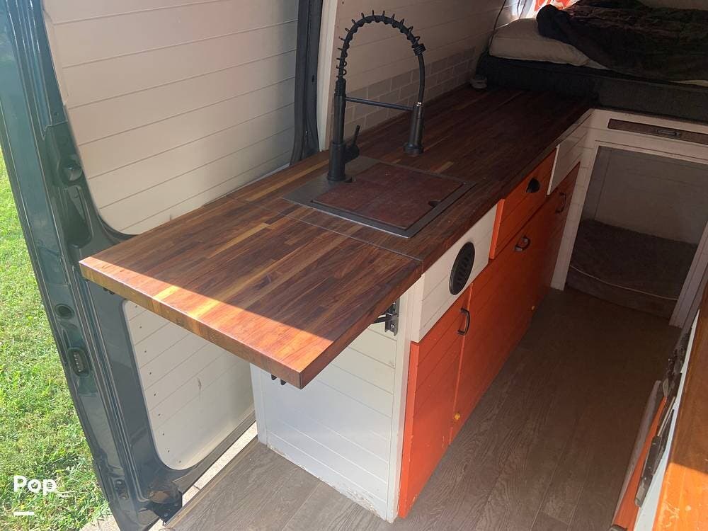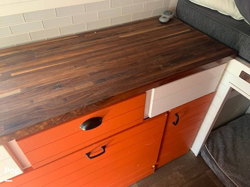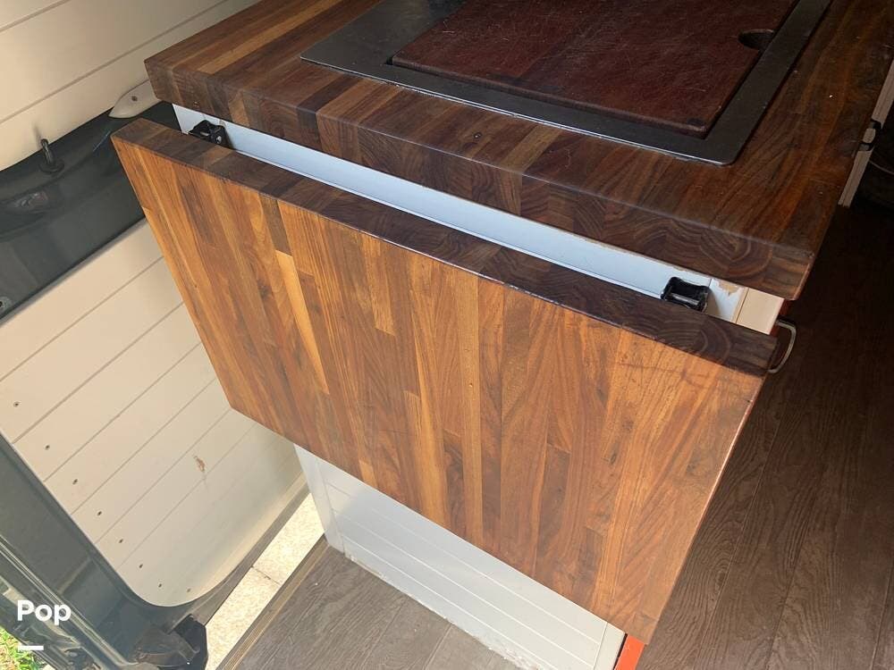 The custom butcher block countertops provide lots of workspace in the galley, and there is a portable worktop that disassembles and is stored behind the driver's seat if you need to get some work done while on the road.