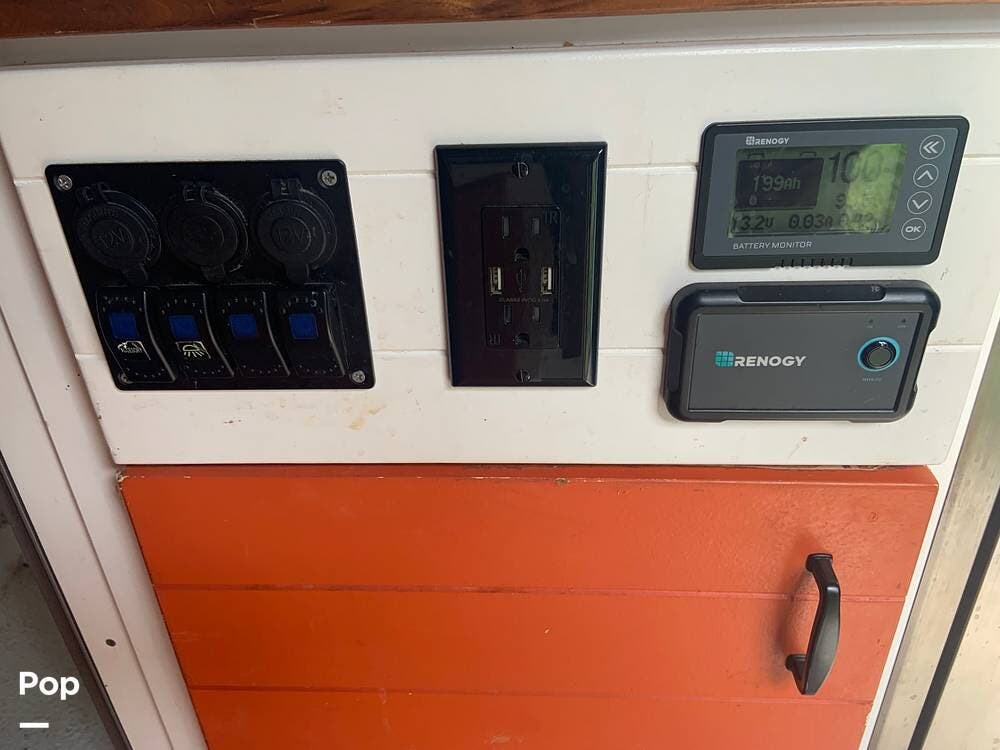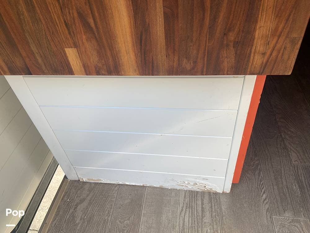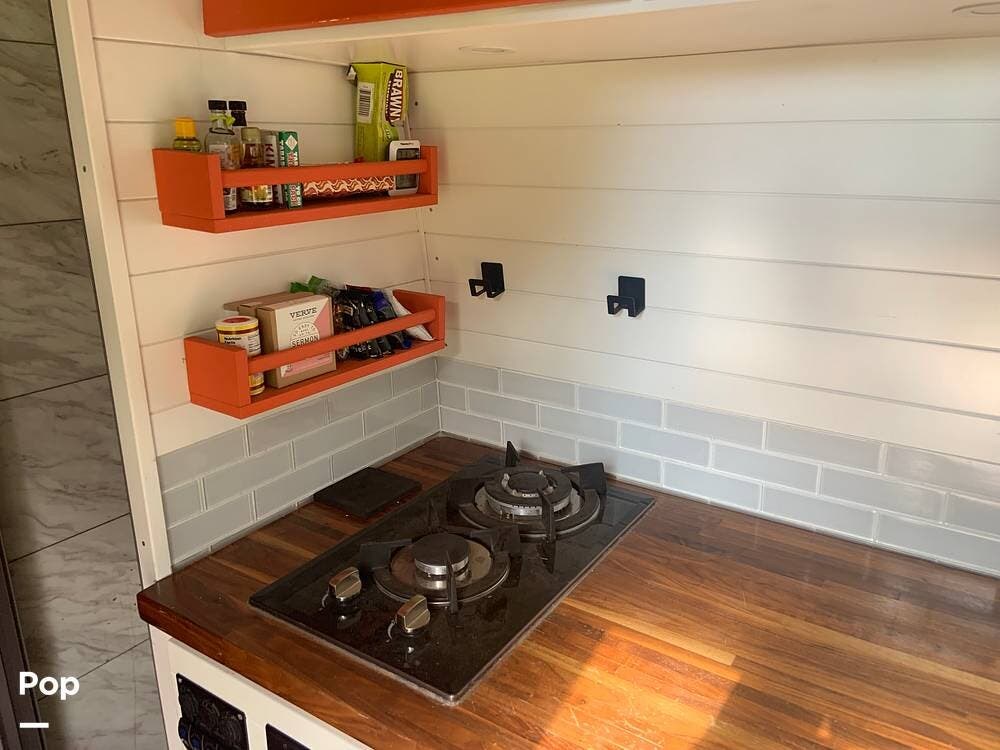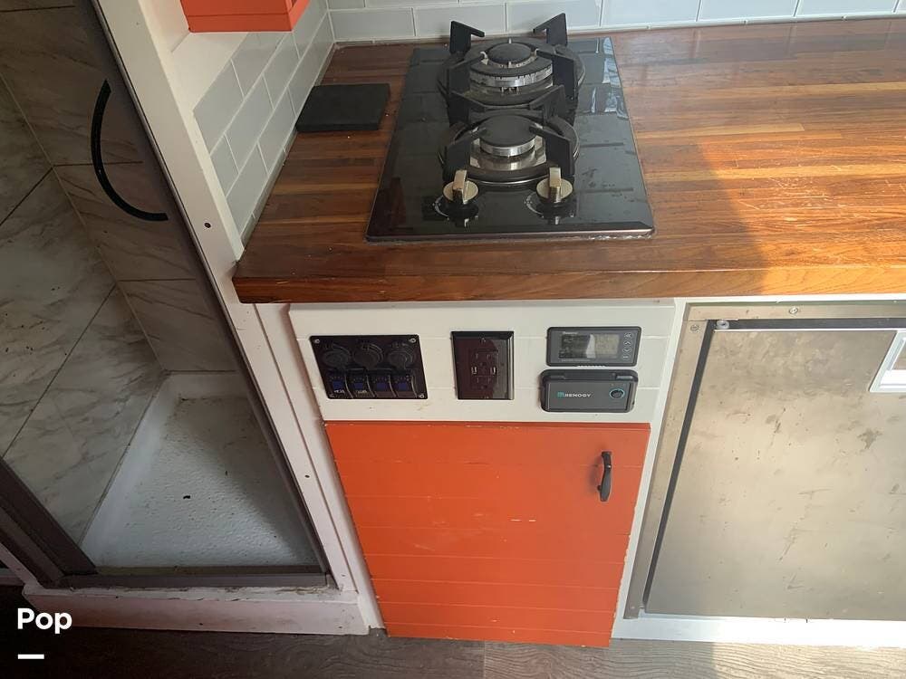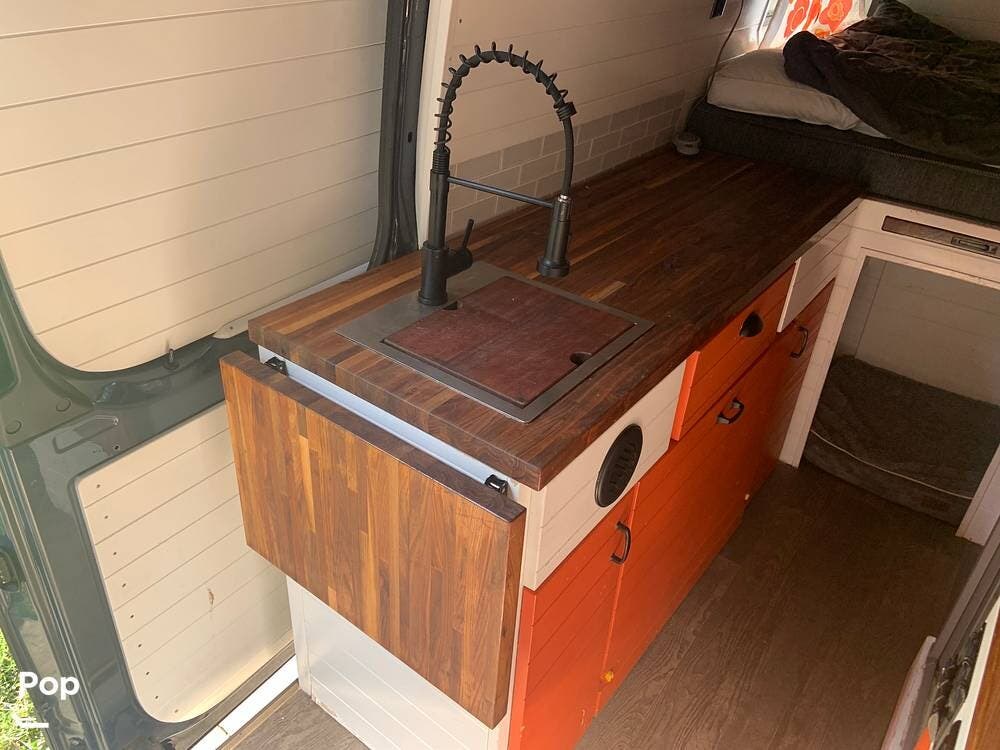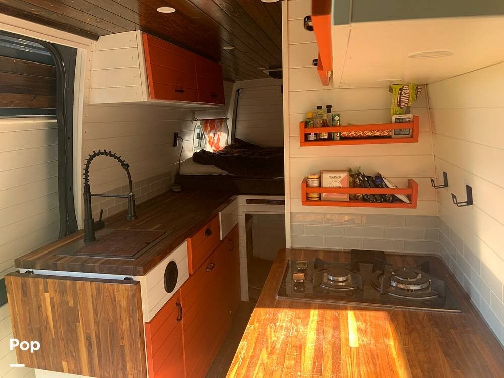 The custom butcher block countertops provide lots of workspace in the galley, and there is a portable worktop that disassembles and is stored behind the driver's seat if you need to get some work done while on the road.