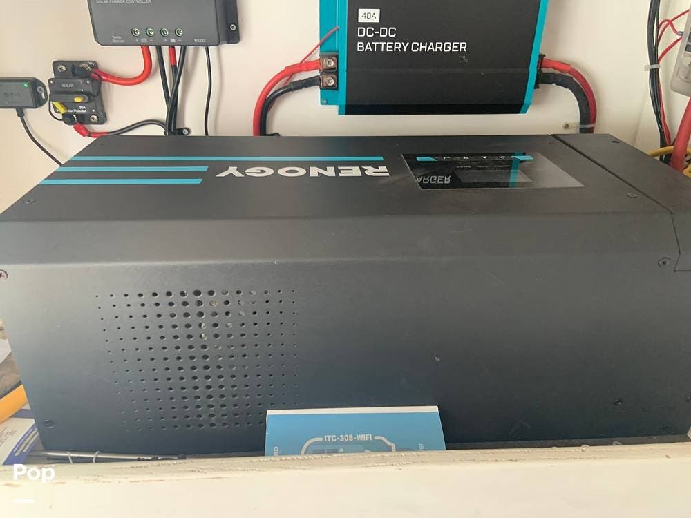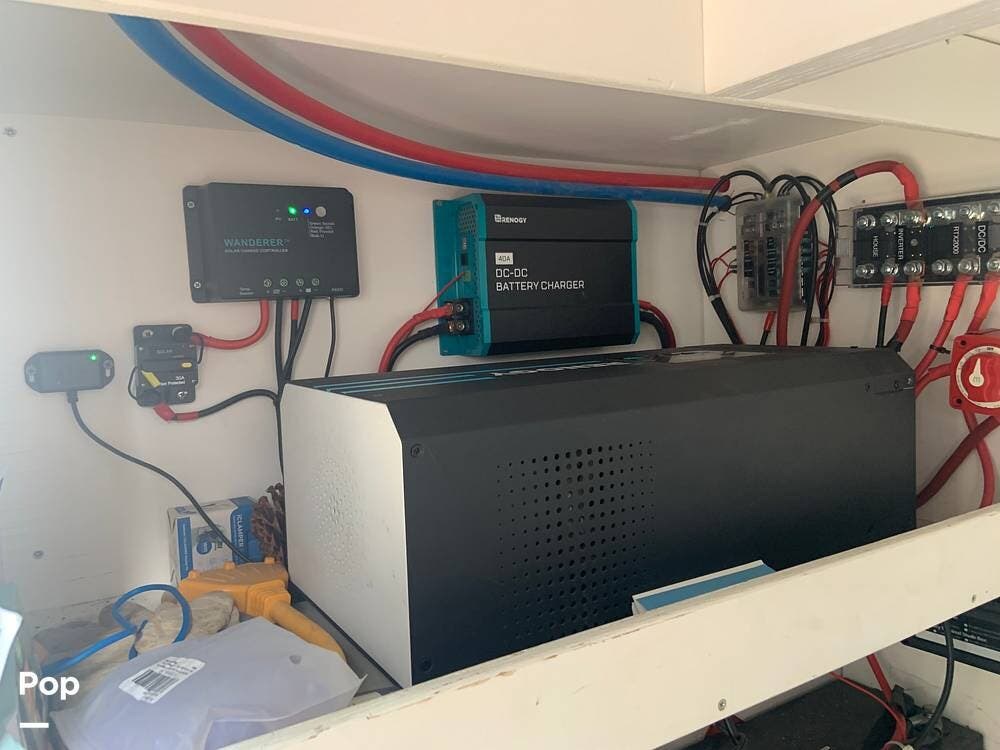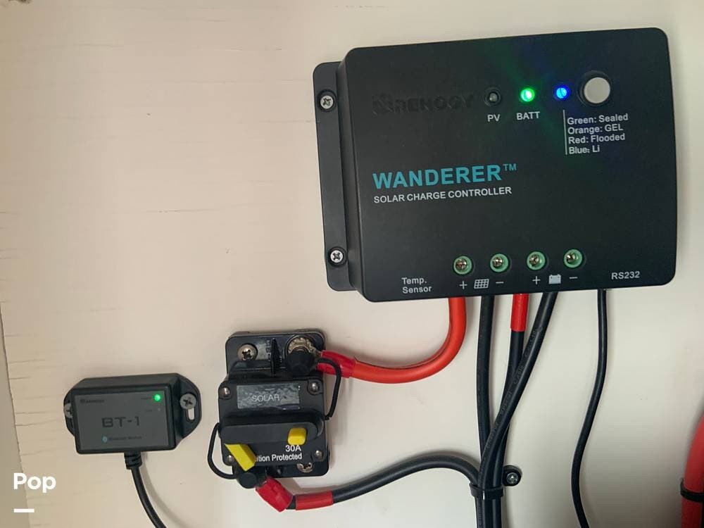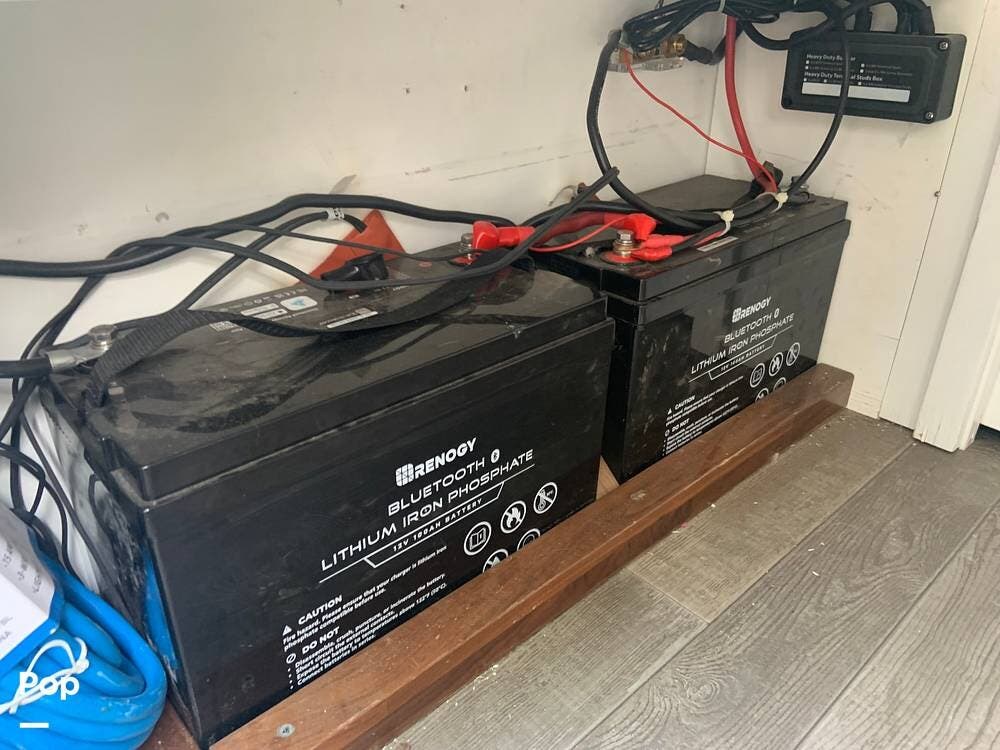 The van is primarily powered by two Renogy Lithium Iron Phosphate 12V 100AH batteries, which are kept charged by the alternator as you drive down the road, when plugged into shore power, or by the two solar panels on the roof, which feed into the Wanderer Solar Controller and Renogy Charger system.