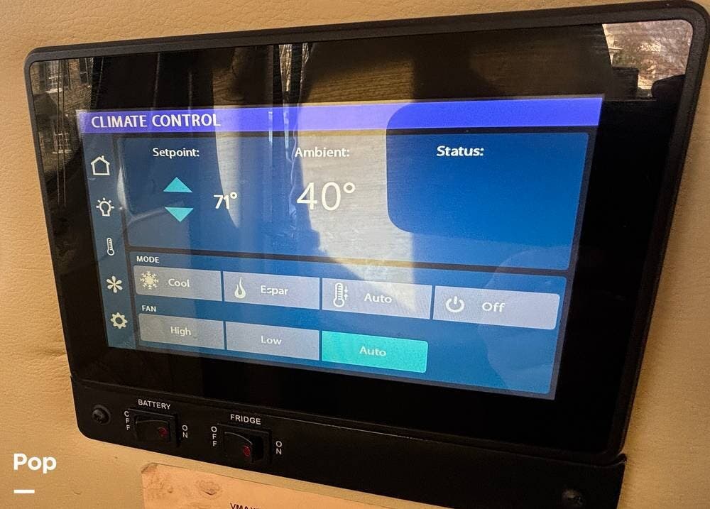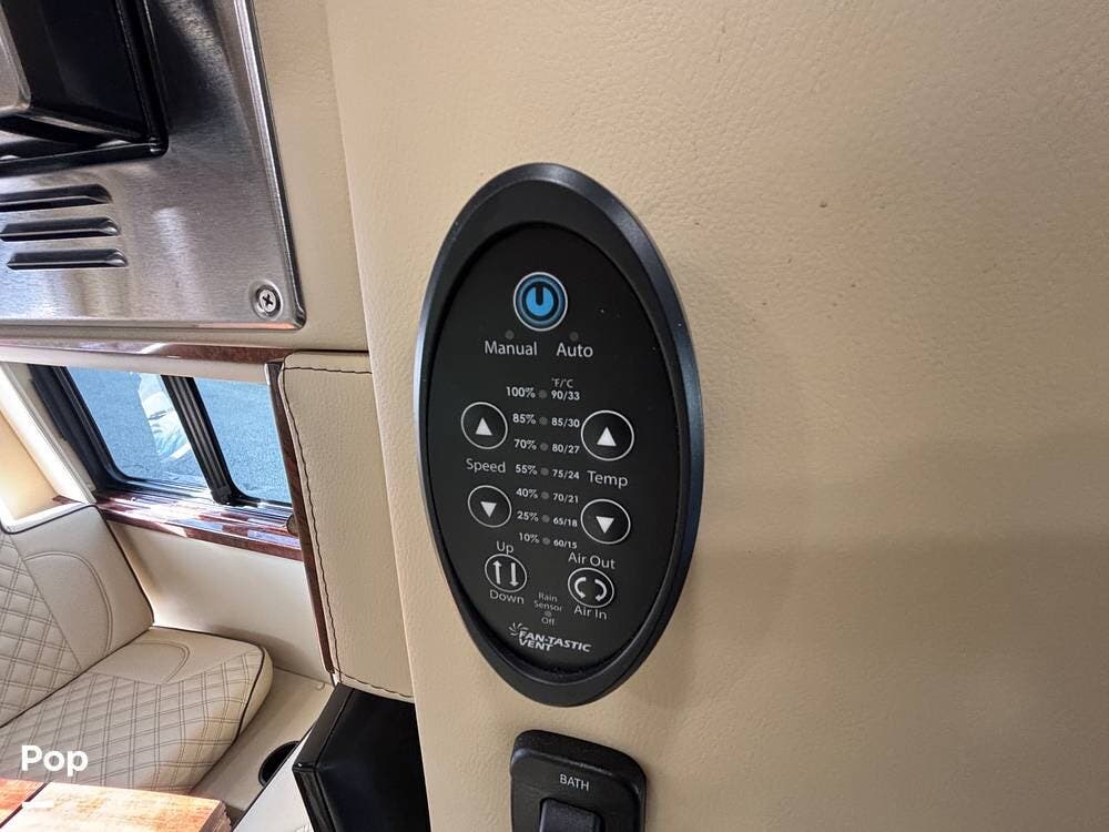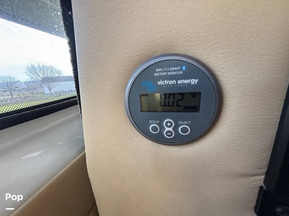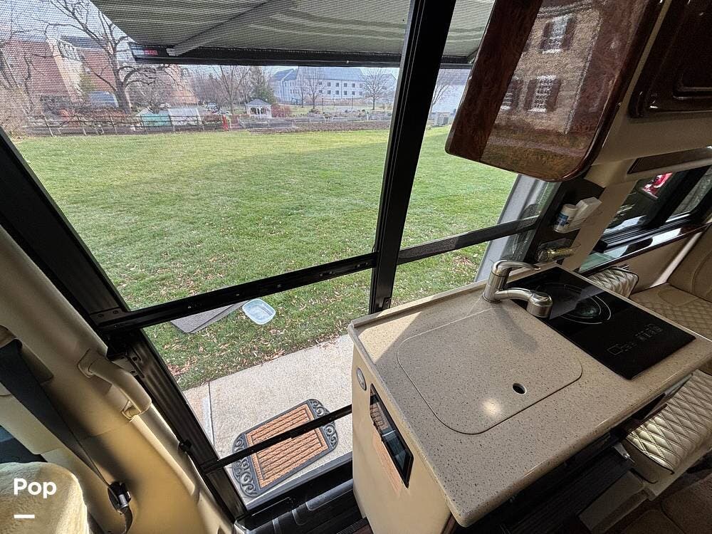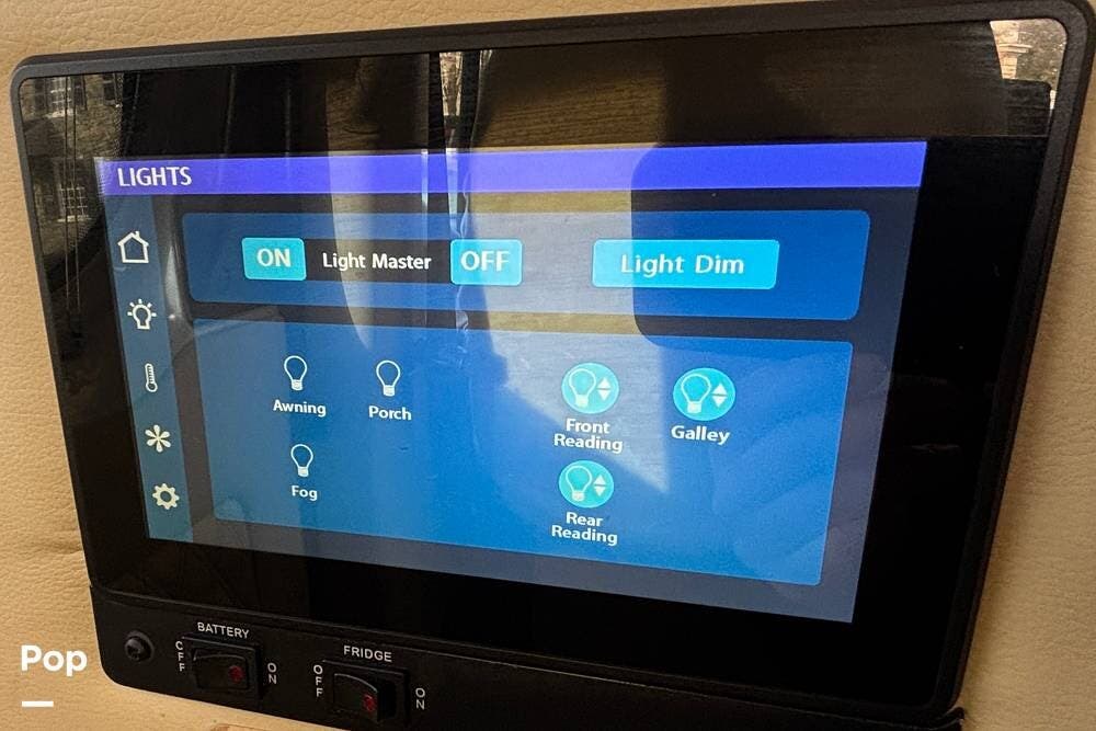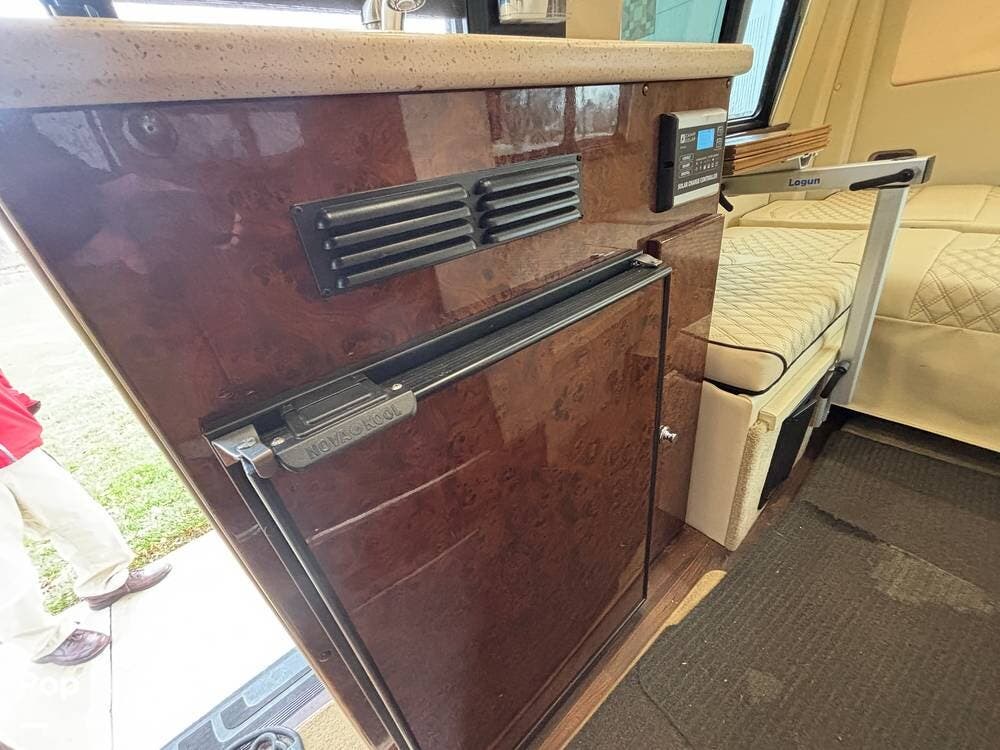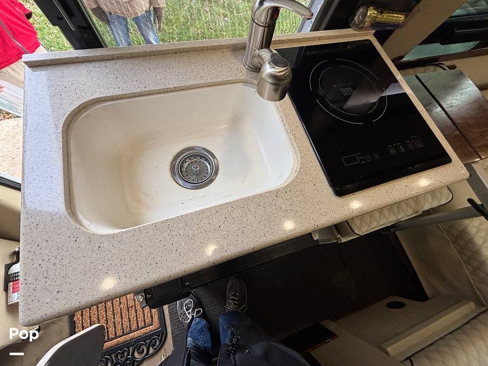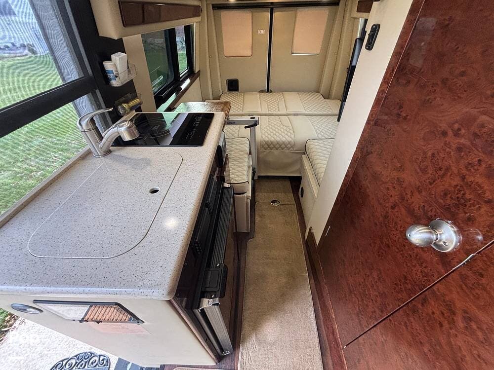 Opposite, the curbside galley is equipped with a sink, induction cooktop, refrigerator, and ample drawer storage. A convection microwave sits just behind the bathroom on the streetside, with a TV mounted directly across and a DVD player/FM radio below for easy entertainment.
