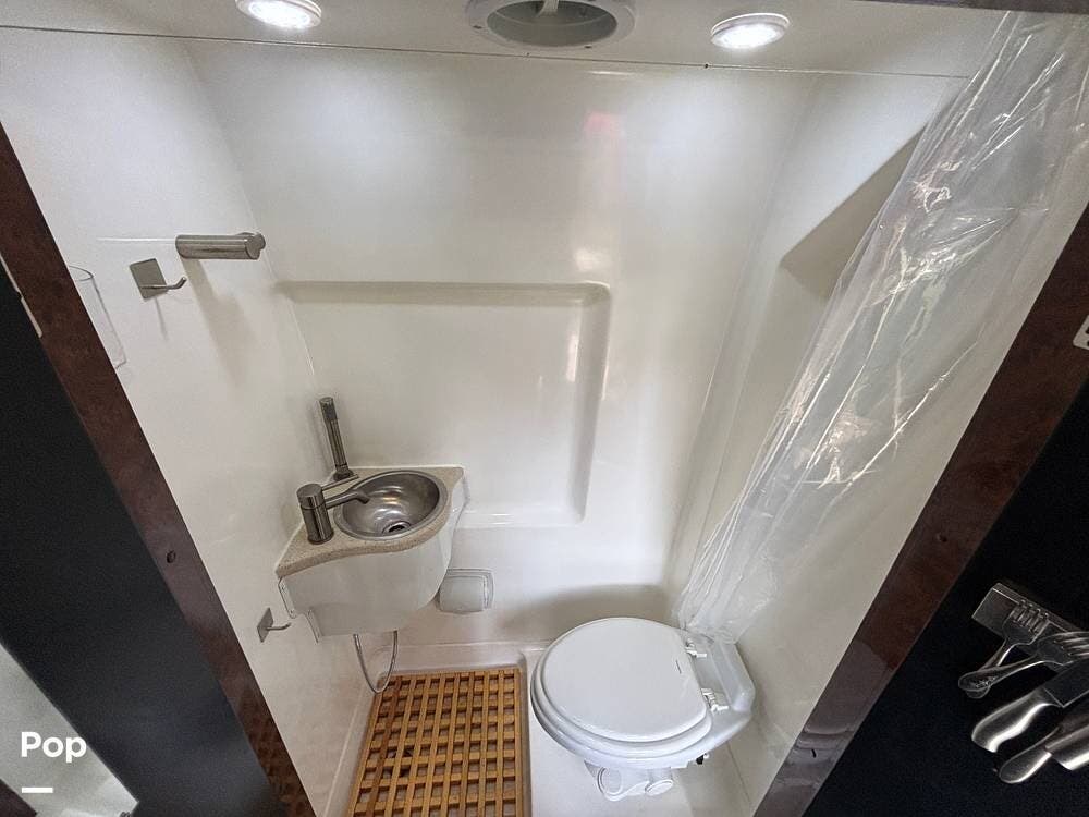 Mid-coach, the streetside wet bath includes a shower, toilet, and sink for on-the-road comfort.
