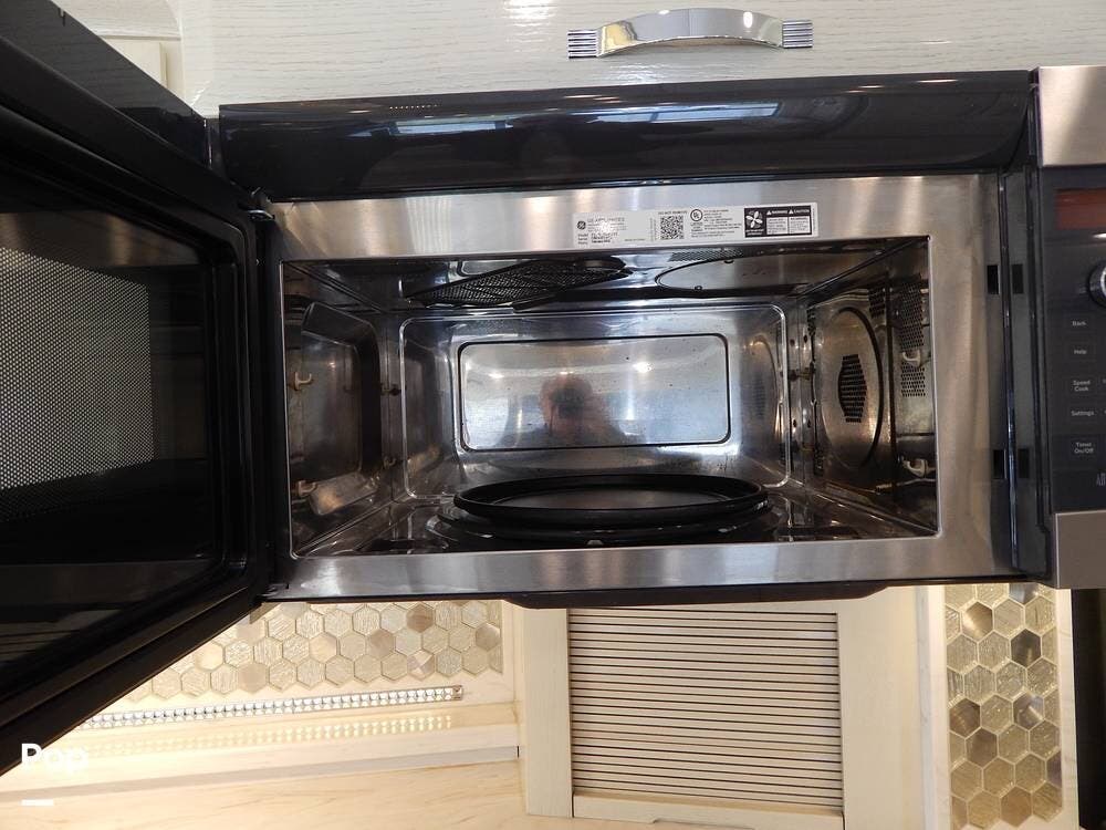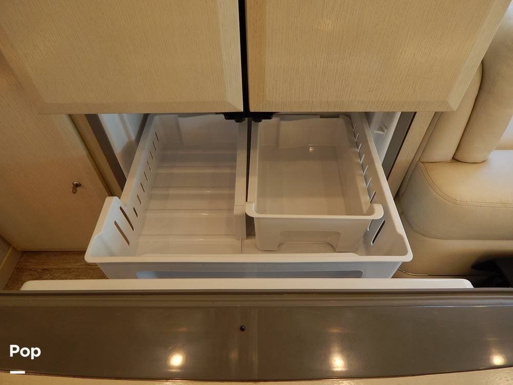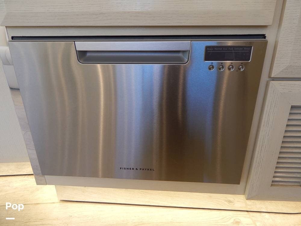 The all-electric galley is appointed with a Wolf induction cooktop, a Whirlpool French-door refrigerator, a Fisher & Paykel dishwasher, and a GE Advantium convection microwave, a curated lineup designed for effortless entertaining and everyday comfort.