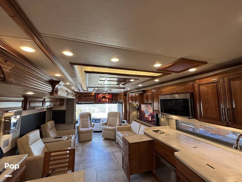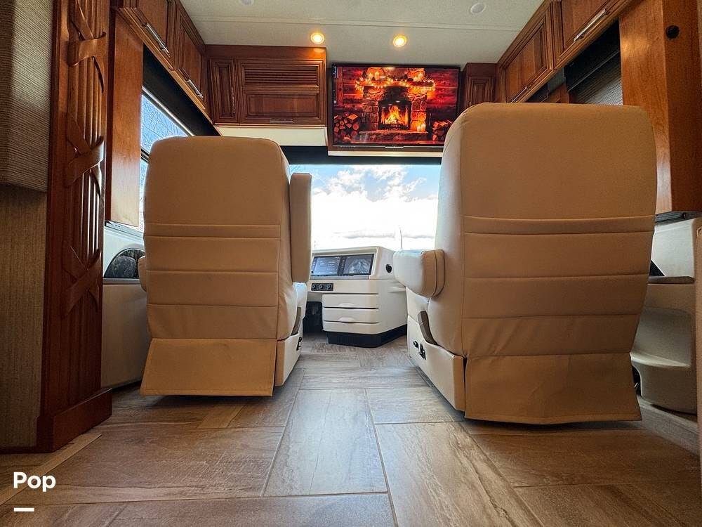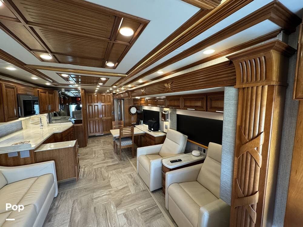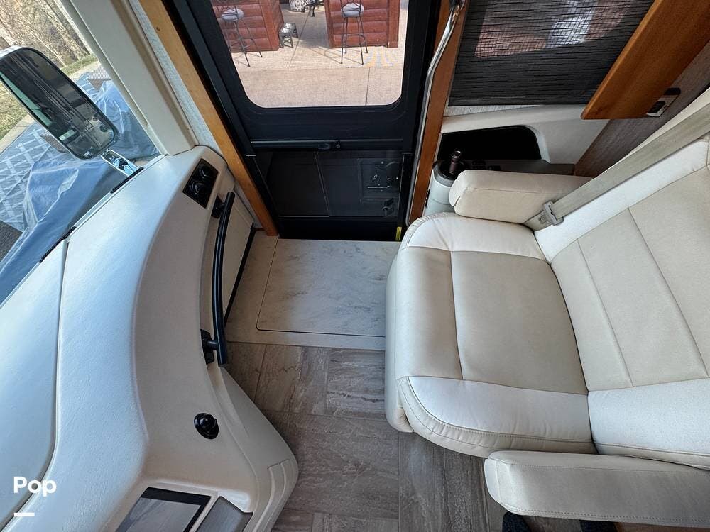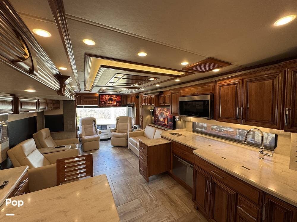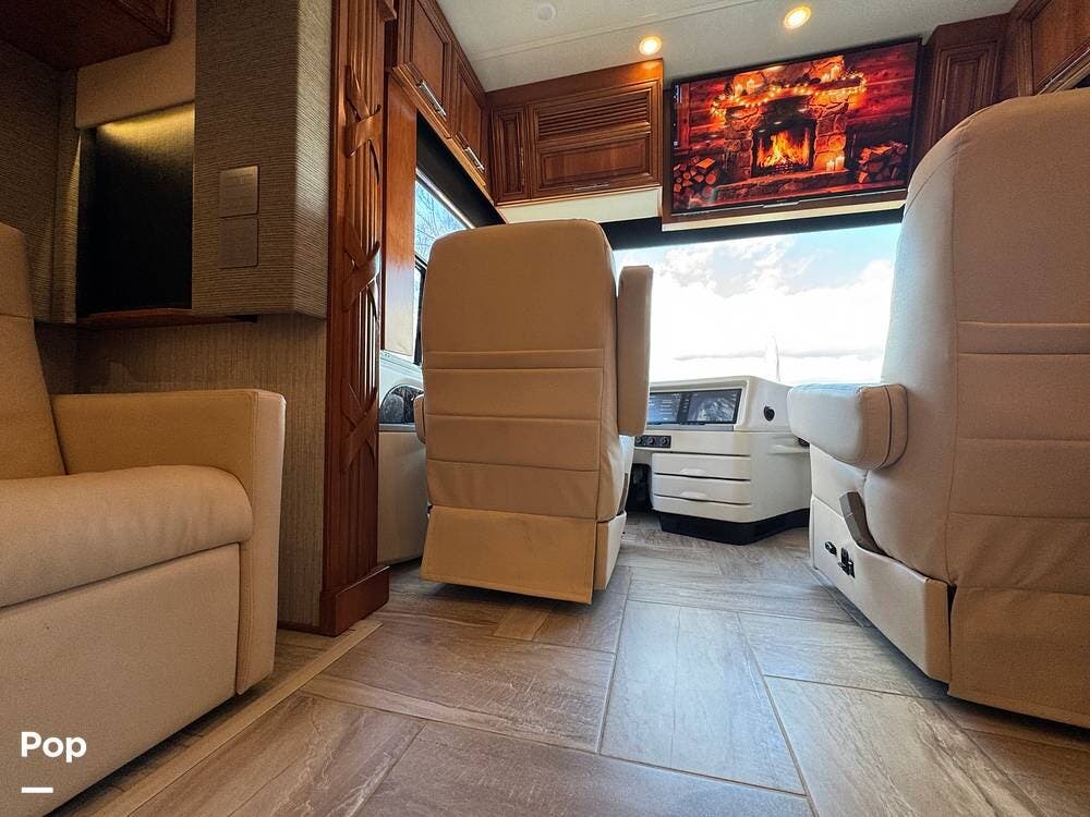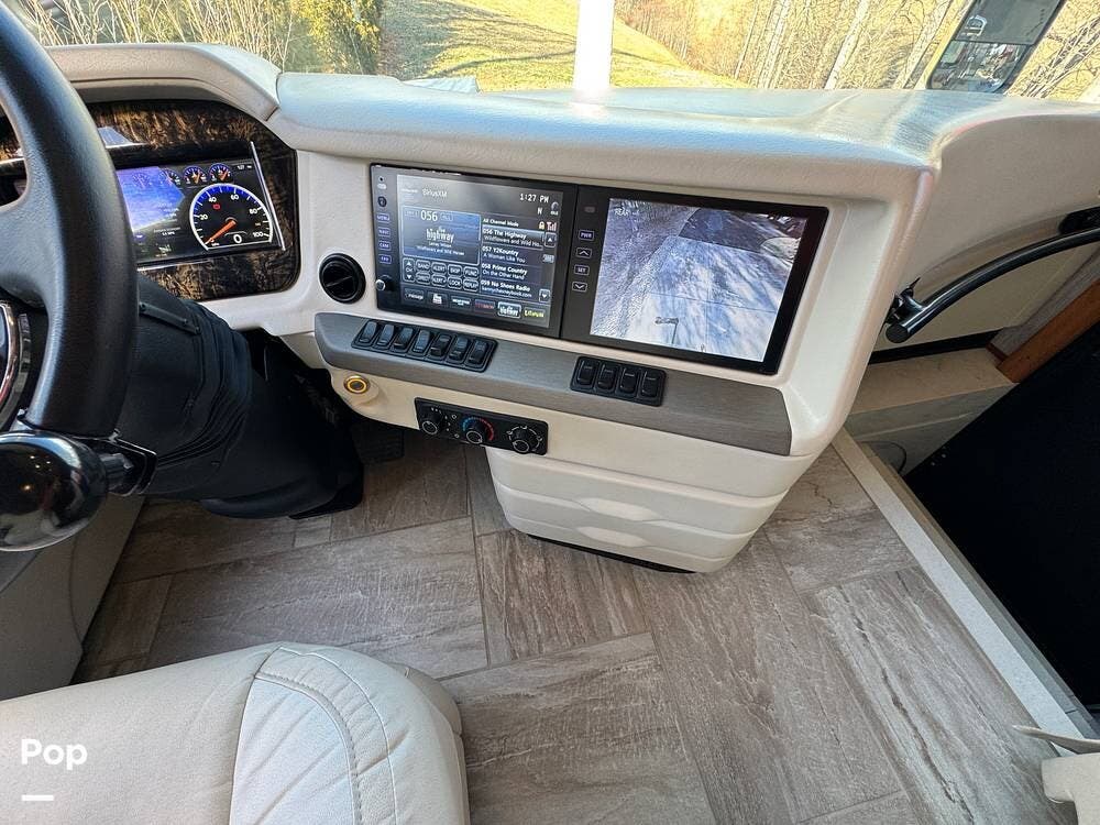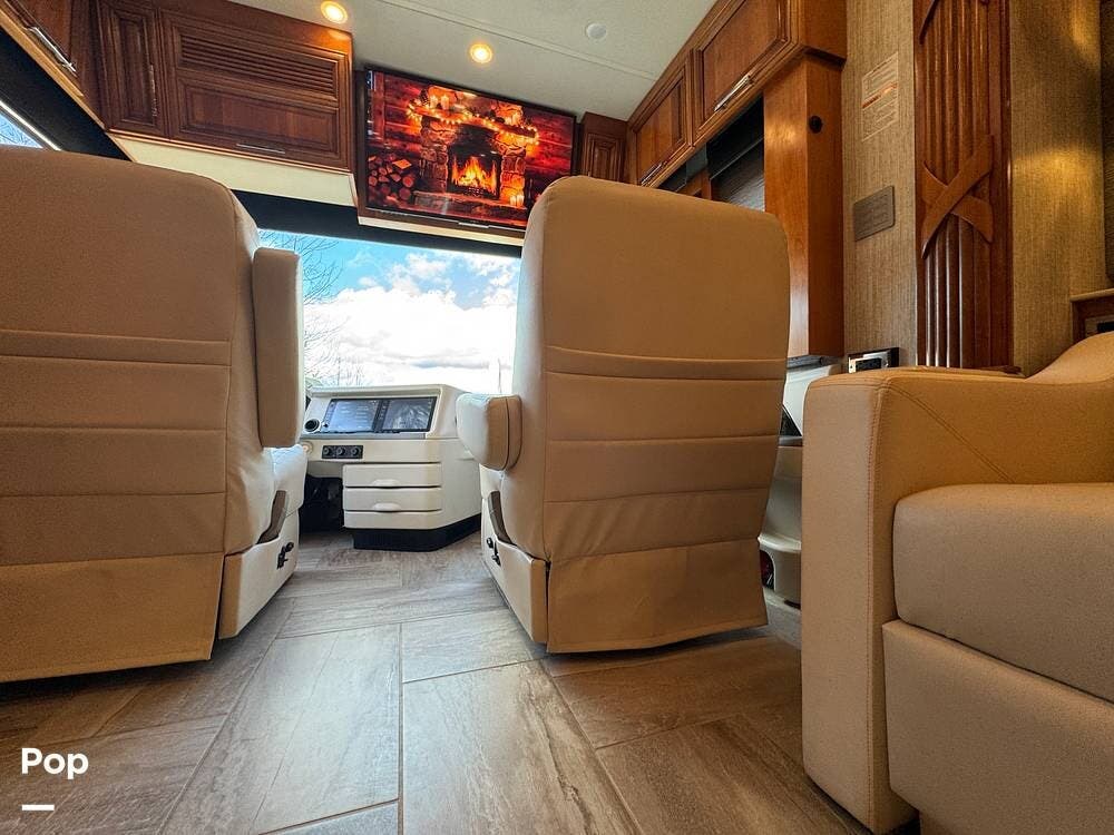 The cockpit is equipped with a fully digital dash, navigation, satellite radio, and a comprehensive 360-degree camera system providing full surround visibility. Side cameras automatically activate with turn signals, and split-screen views allow continuous monitoring of a towed vehicle. Both driver and passenger seats are power-adjustable, heated, and equipped with lumbar support and leg extensions, and they rotate to integrate into the living area when parked.