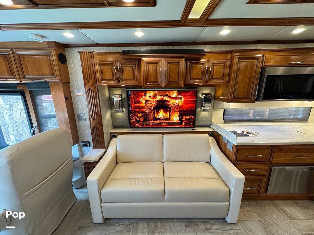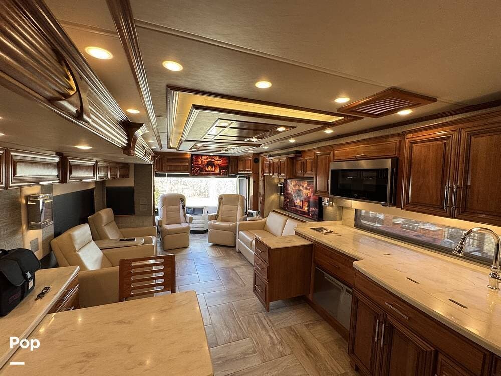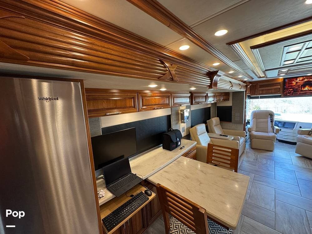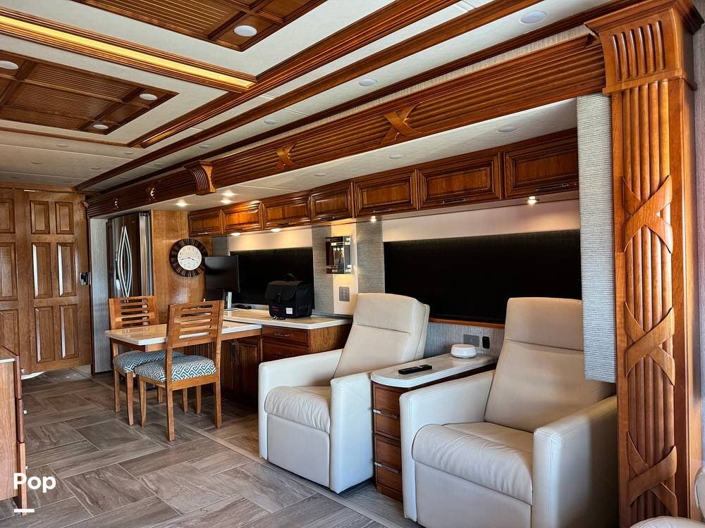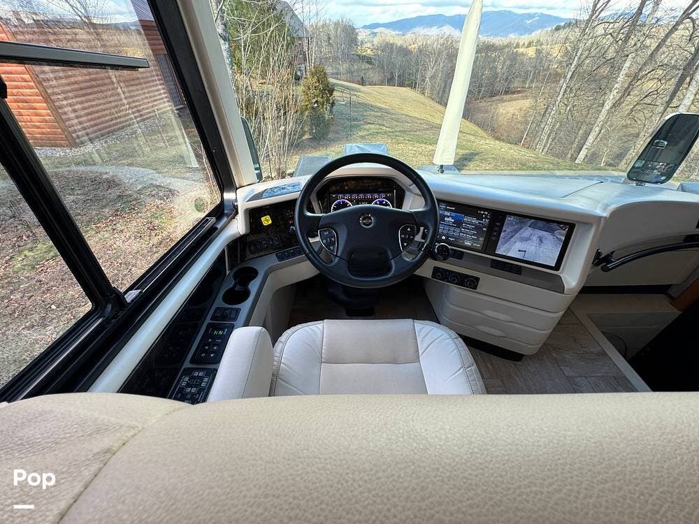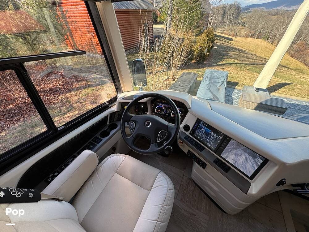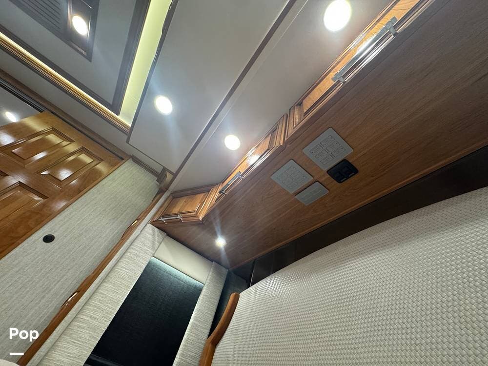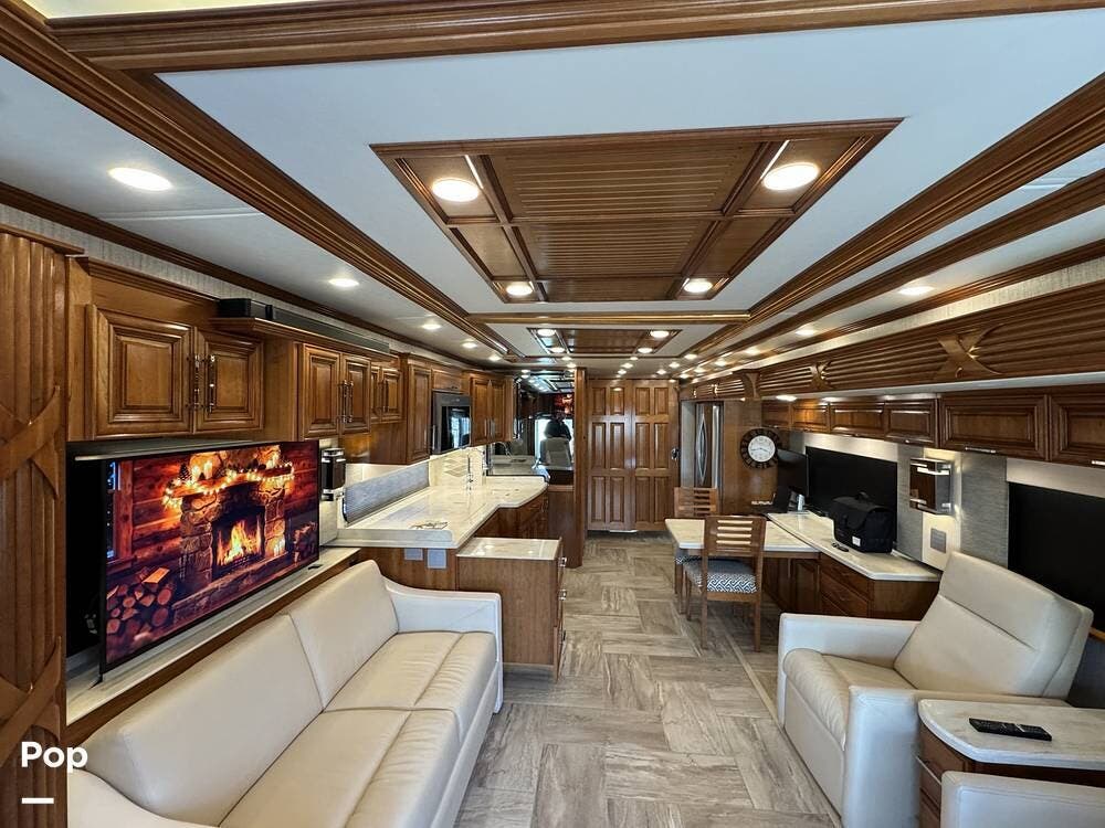 The cockpit is equipped with a fully digital dash, navigation, satellite radio, and a comprehensive 360-degree camera system providing full surround visibility. Side cameras automatically activate with turn signals, and split-screen views allow continuous monitoring of a towed vehicle. Both driver and passenger seats are power-adjustable, heated, and equipped with lumbar support and leg extensions, and they rotate to integrate into the living area when parked.