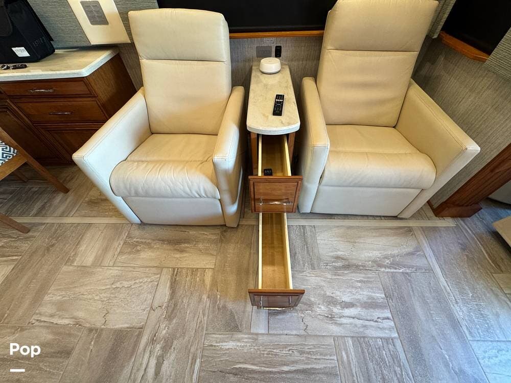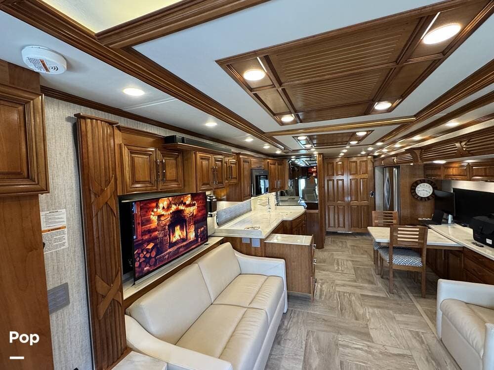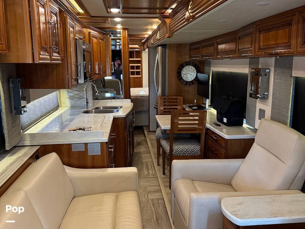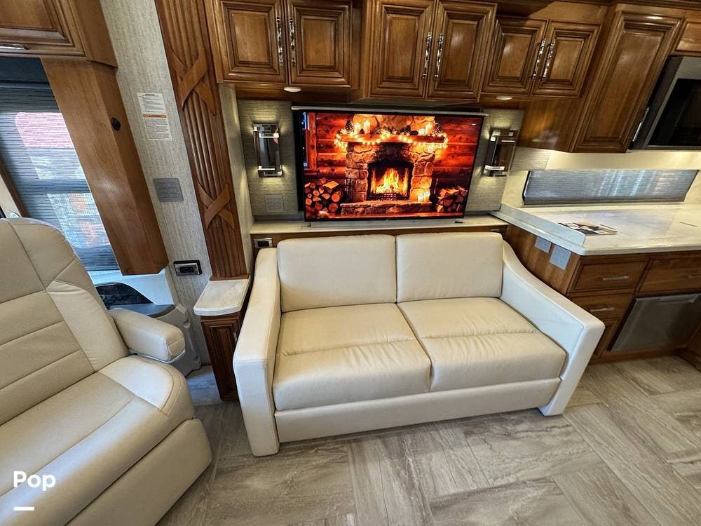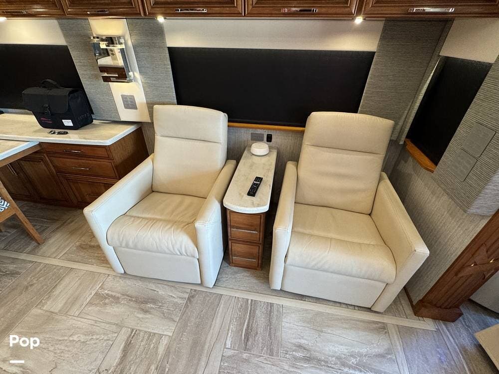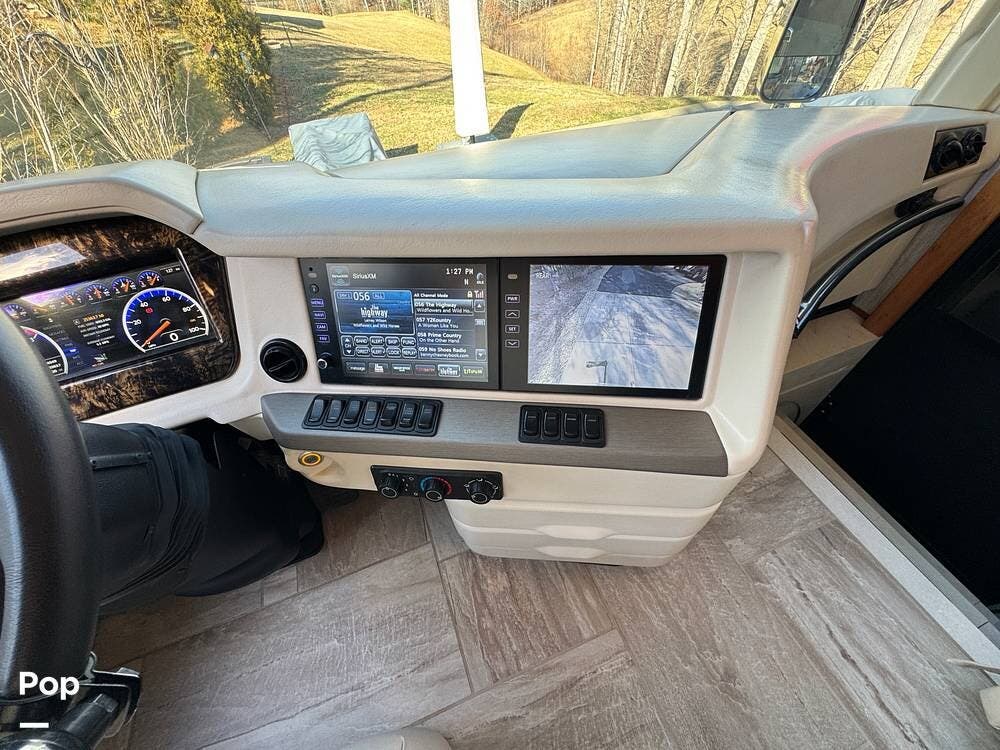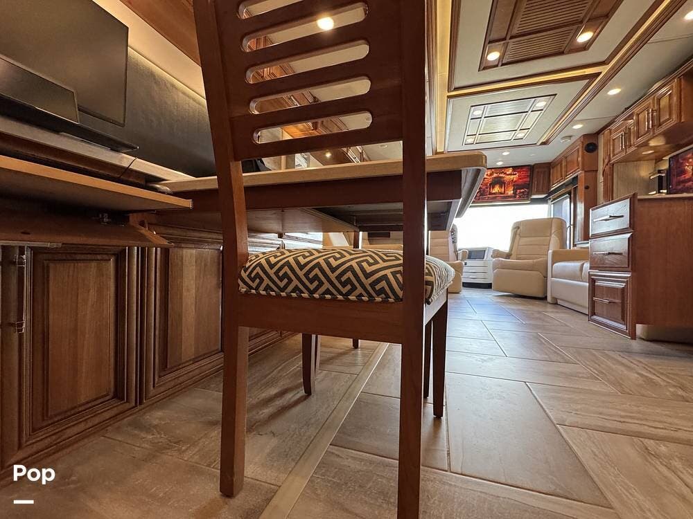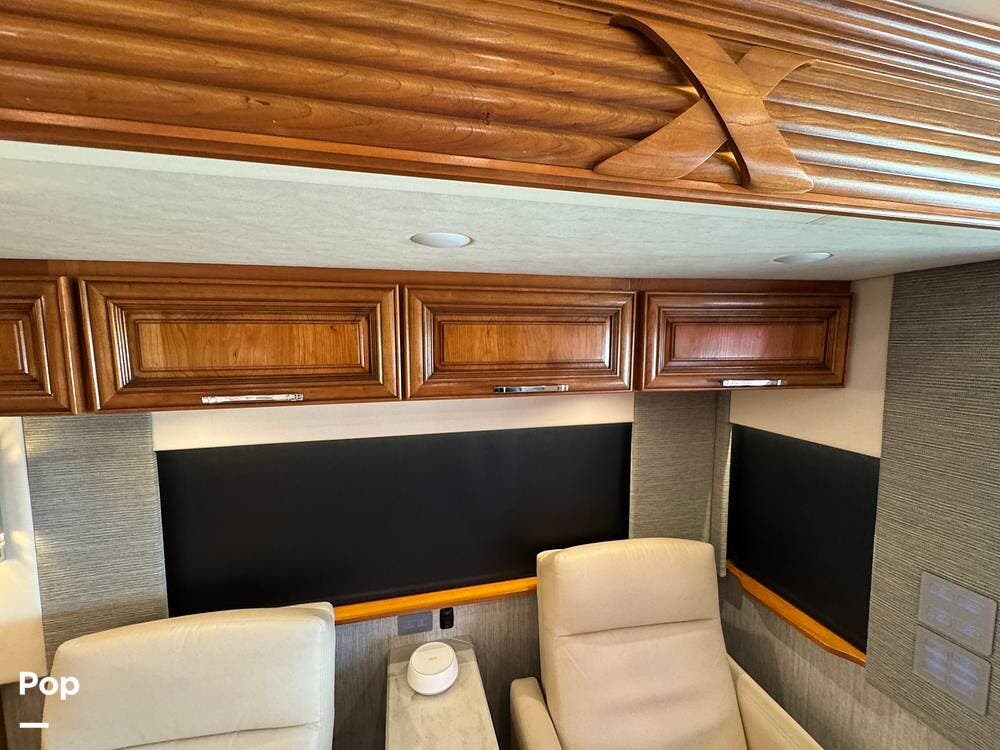 The cockpit is equipped with a fully digital dash, navigation, satellite radio, and a comprehensive 360-degree camera system providing full surround visibility. Side cameras automatically activate with turn signals, and split-screen views allow continuous monitoring of a towed vehicle. Both driver and passenger seats are power-adjustable, heated, and equipped with lumbar support and leg extensions, and they rotate to integrate into the living area when parked.