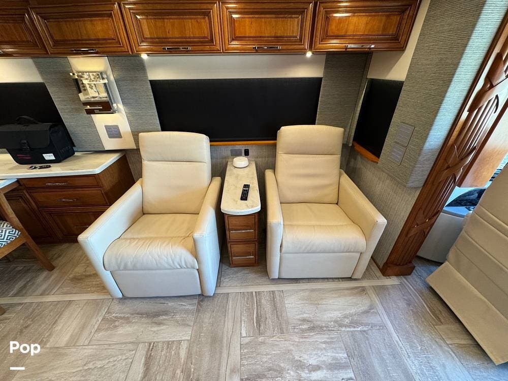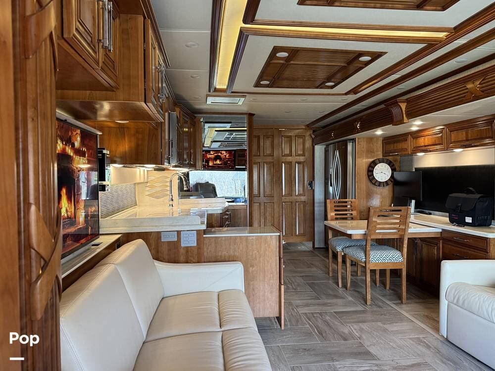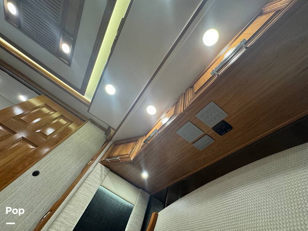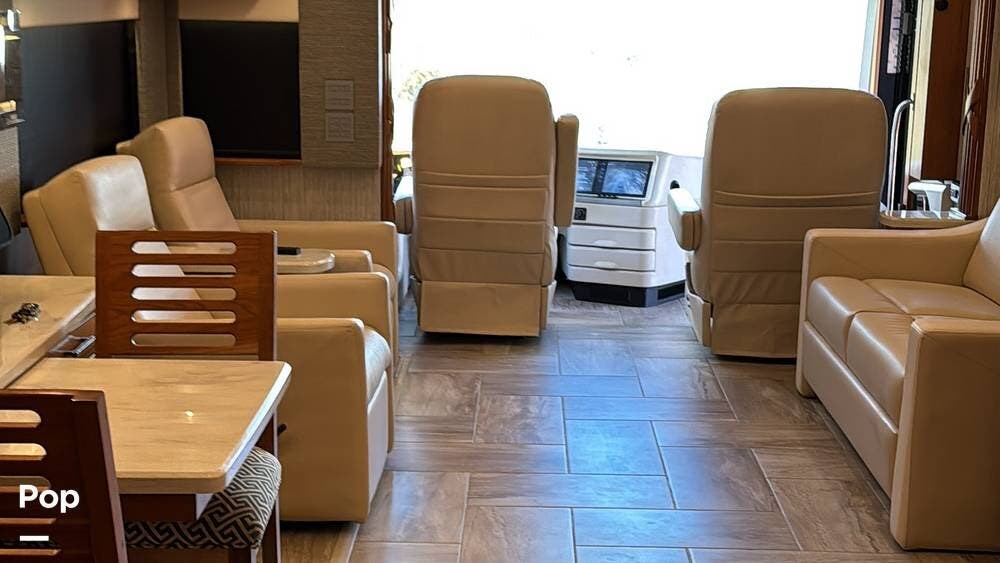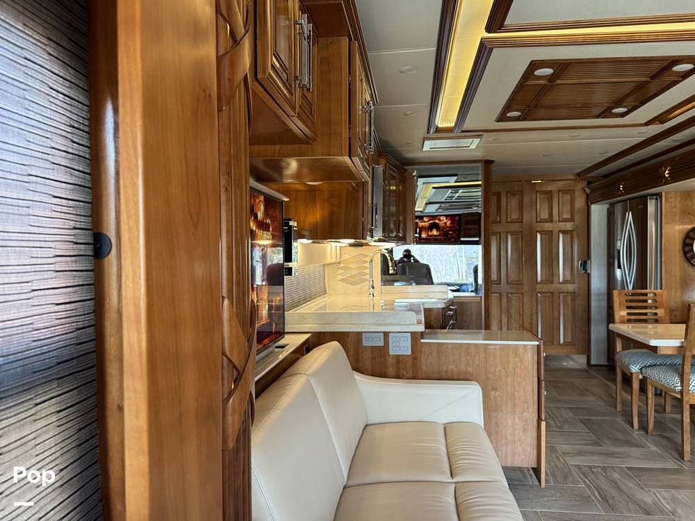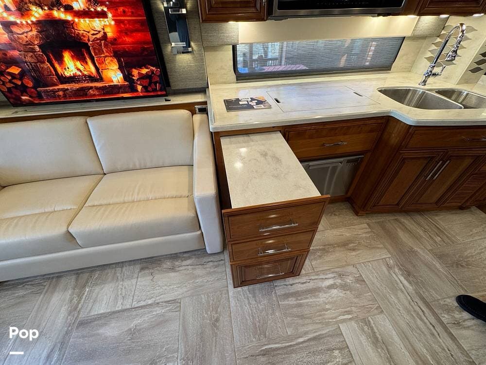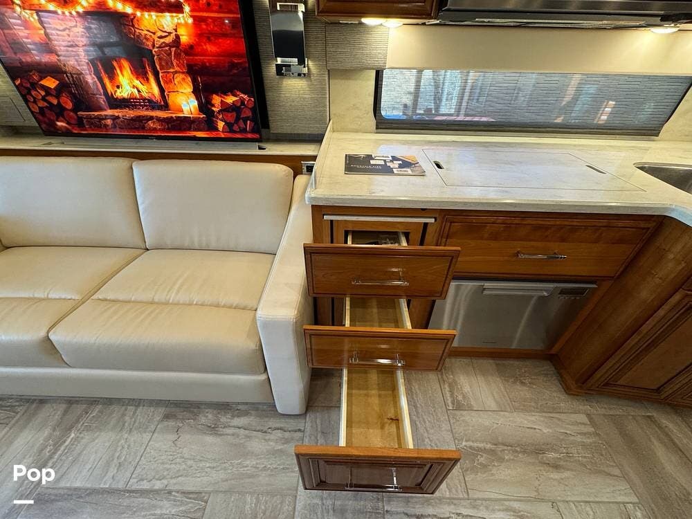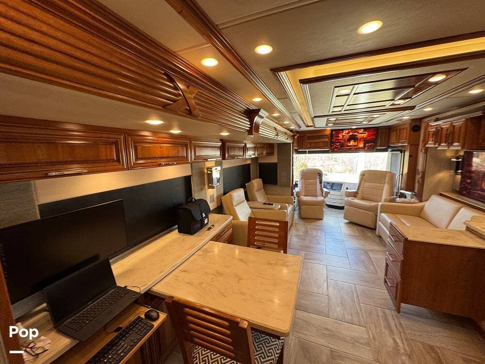The cockpit is equipped with a fully digital dash, navigation, satellite radio, and a comprehensive 360-degree camera system providing full surround visibility. Side cameras automatically activate with turn signals, and split-screen views allow continuous monitoring of a towed vehicle. Both driver and passenger seats are power-adjustable, heated, and equipped with lumbar support and leg extensions, and they rotate to integrate into the living area when parked.