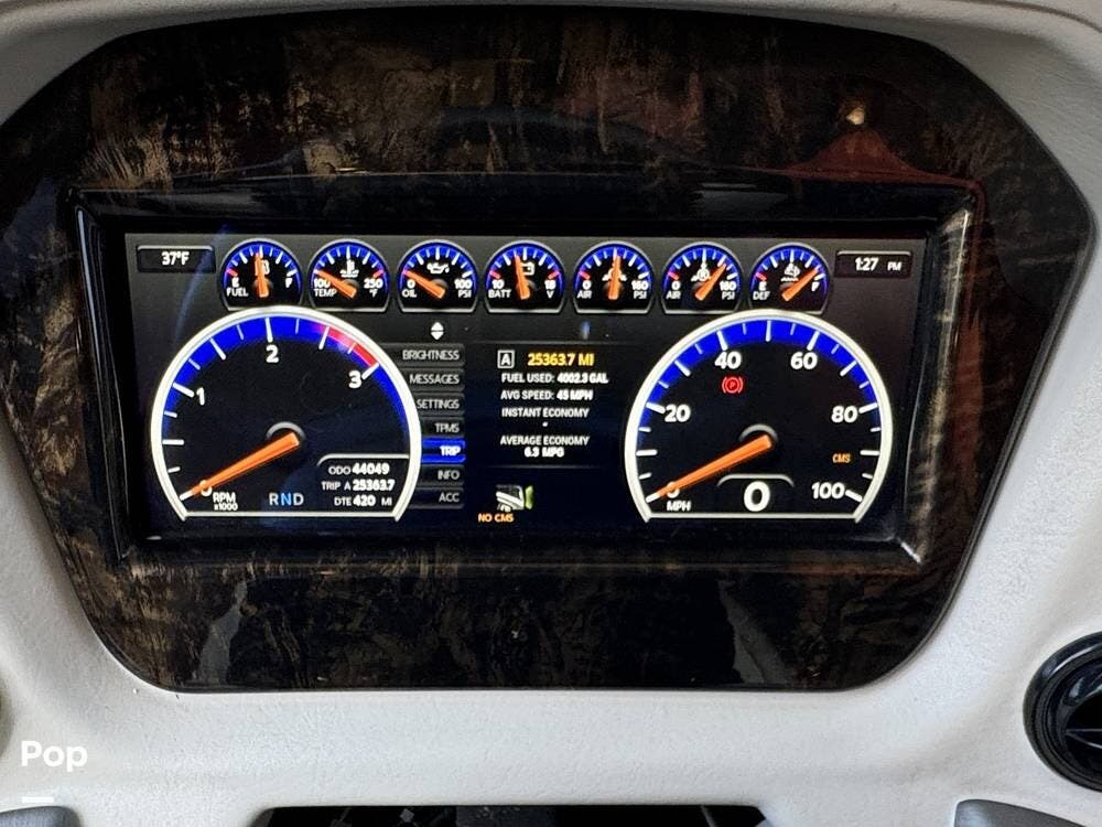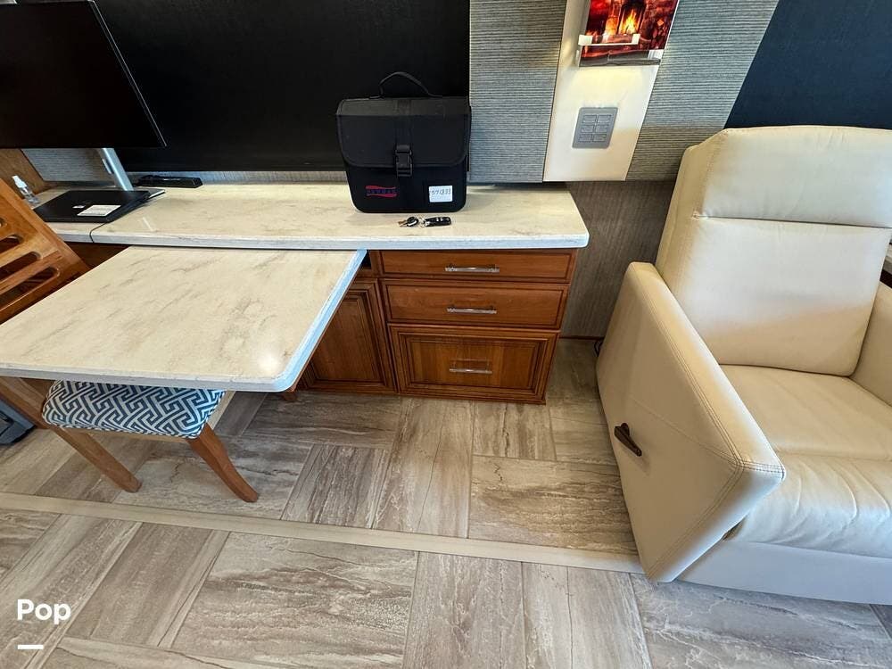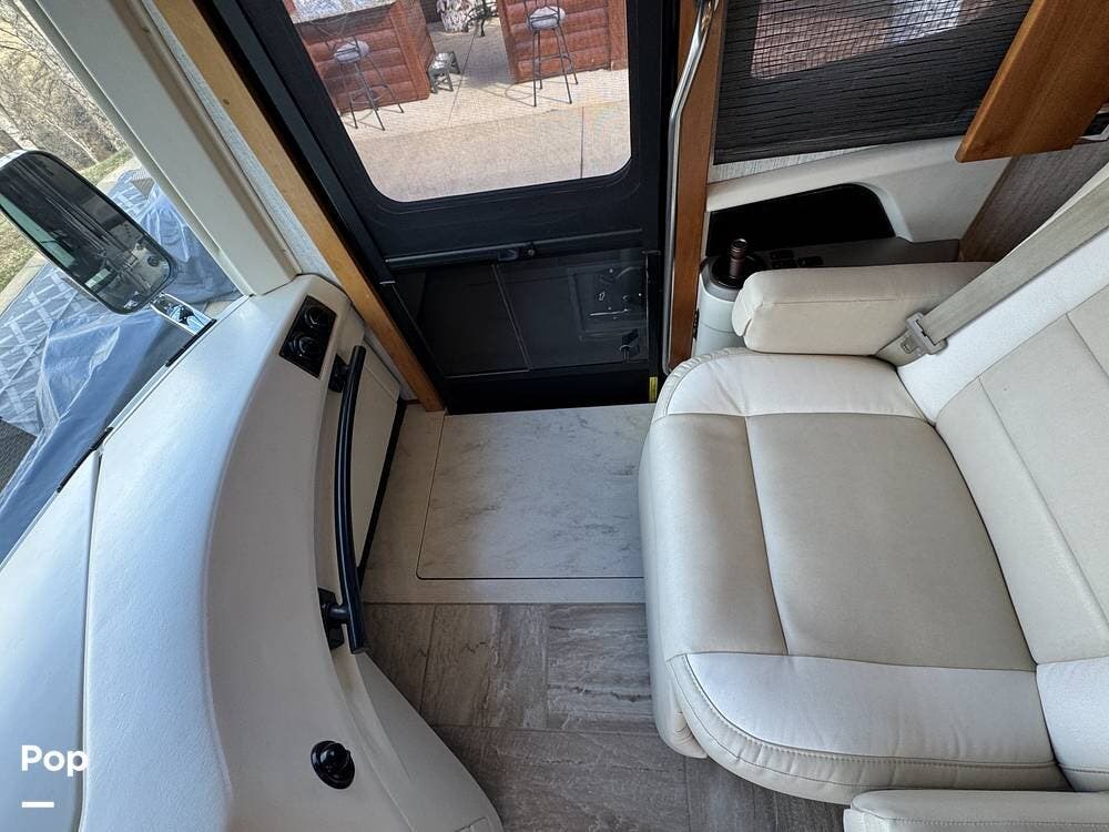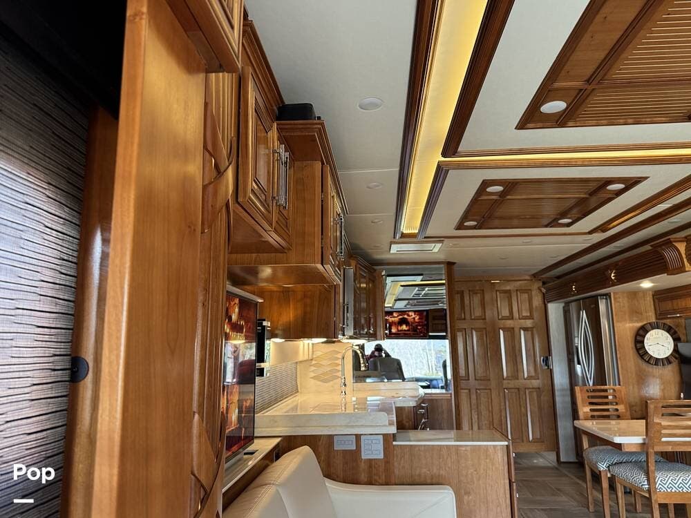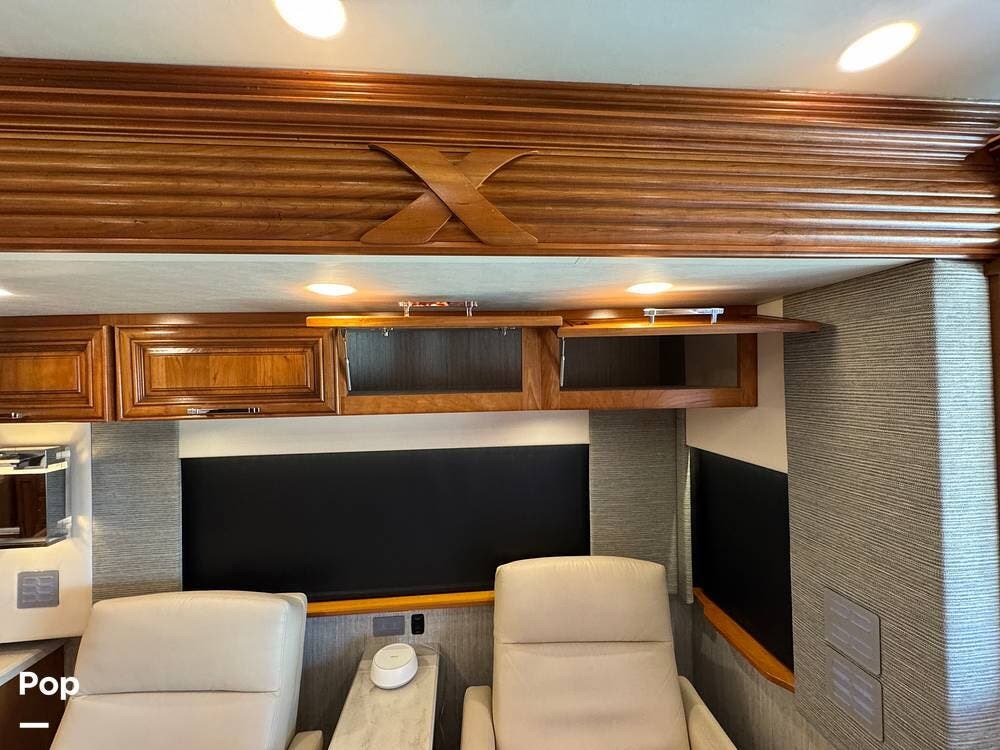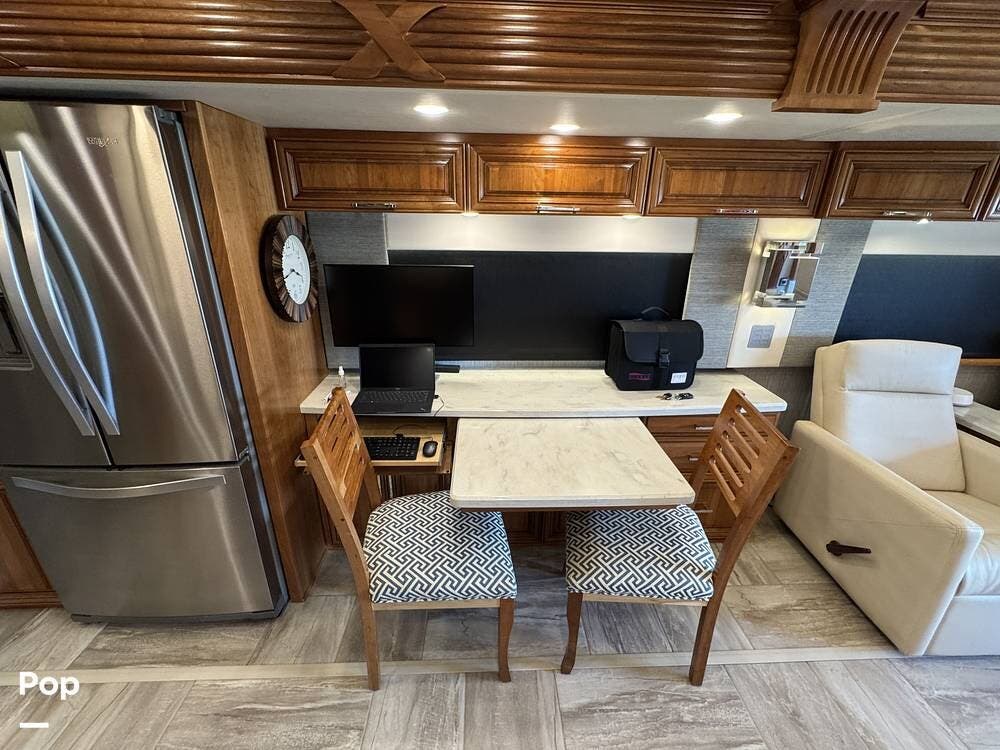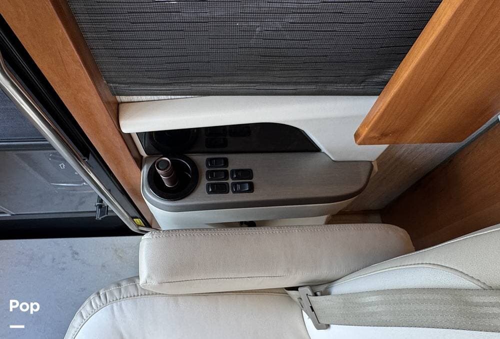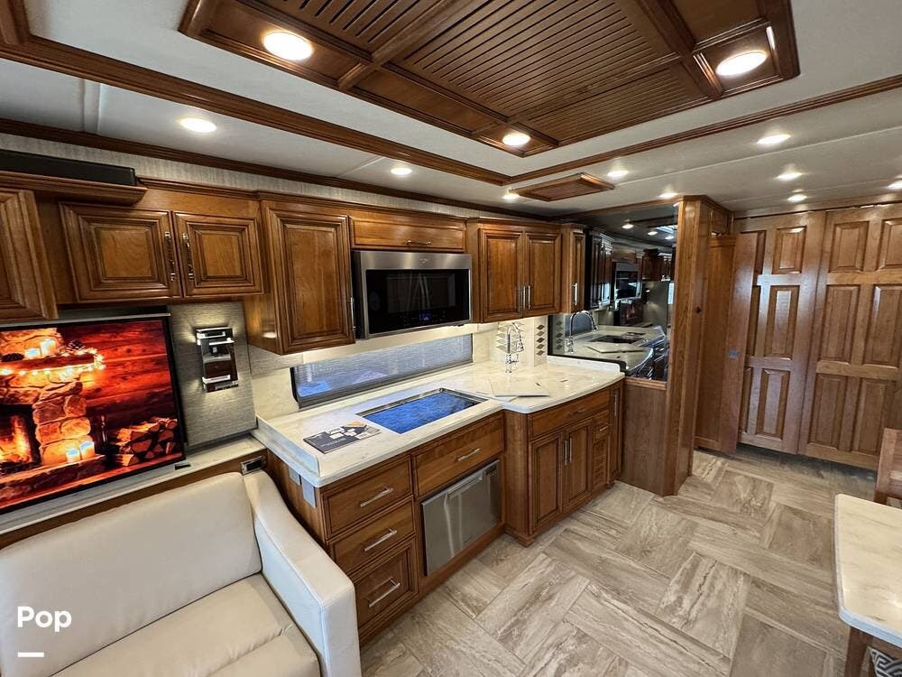 The cockpit is equipped with a fully digital dash, navigation, satellite radio, and a comprehensive 360-degree camera system providing full surround visibility. Side cameras automatically activate with turn signals, and split-screen views allow continuous monitoring of a towed vehicle. Both driver and passenger seats are power-adjustable, heated, and equipped with lumbar support and leg extensions, and they rotate to integrate into the living area when parked.