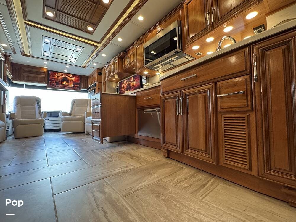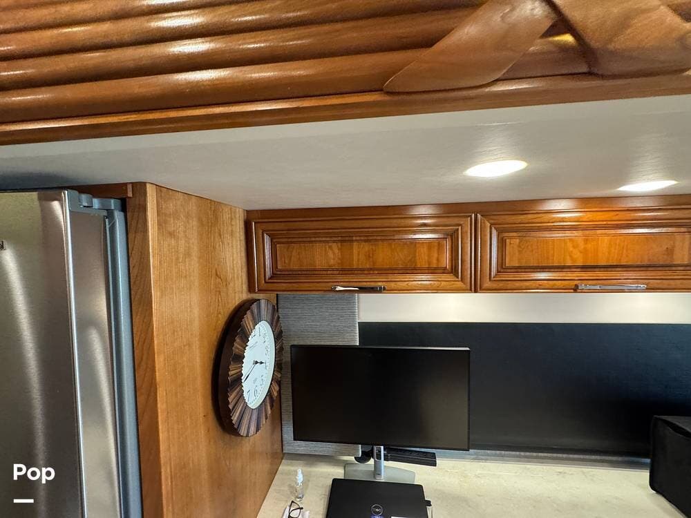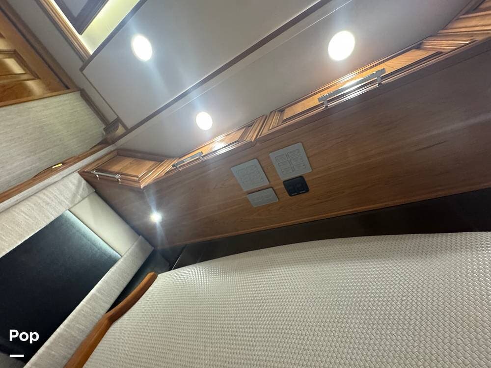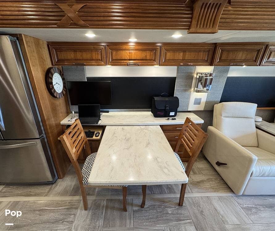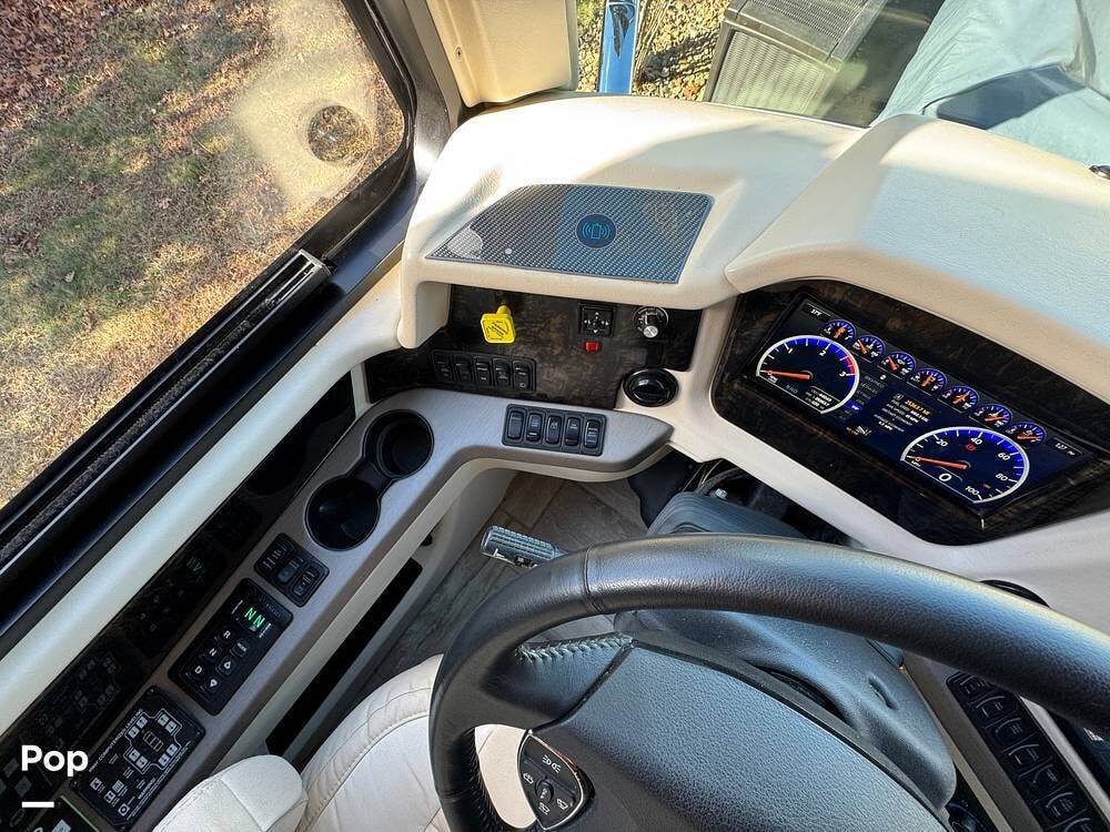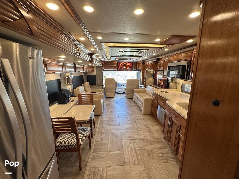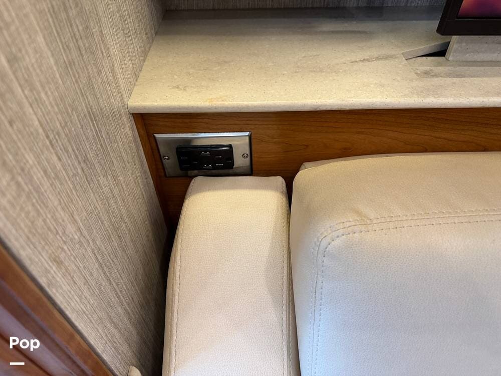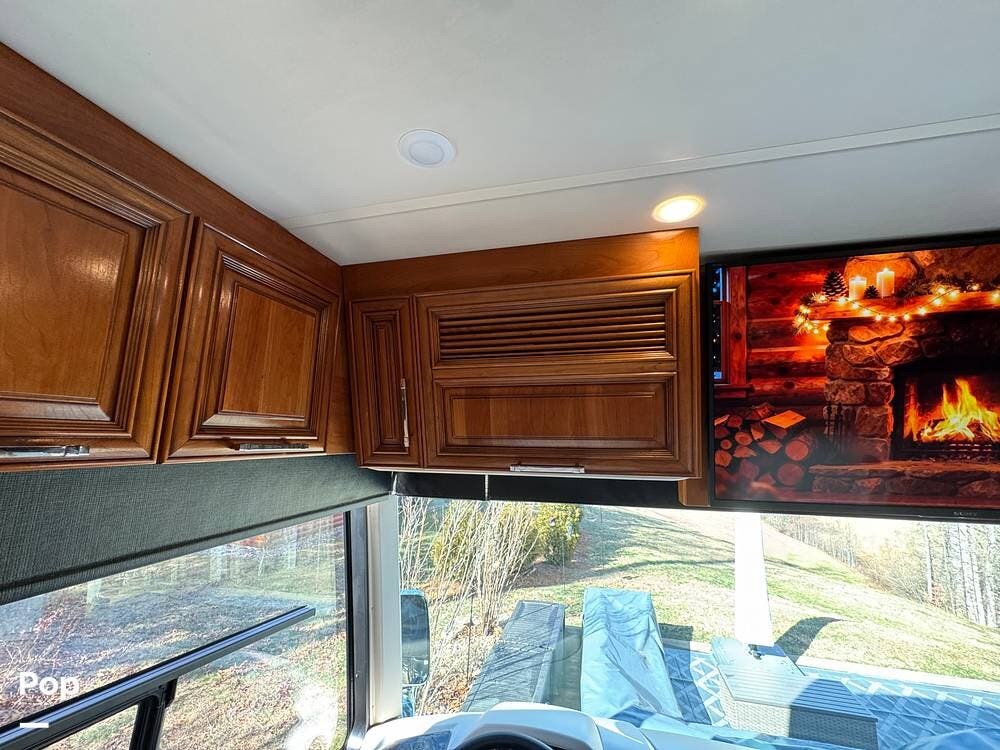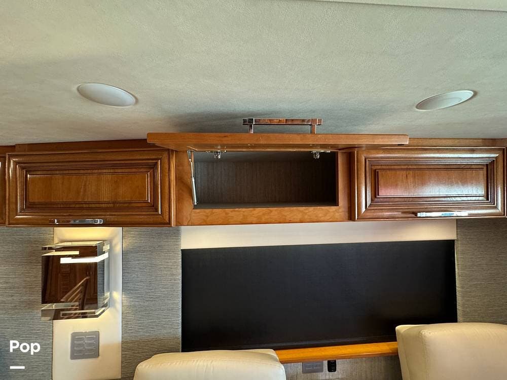 The cockpit is equipped with a fully digital dash, navigation, satellite radio, and a comprehensive 360-degree camera system providing full surround visibility. Side cameras automatically activate with turn signals, and split-screen views allow continuous monitoring of a towed vehicle. Both driver and passenger seats are power-adjustable, heated, and equipped with lumbar support and leg extensions, and they rotate to integrate into the living area when parked.
