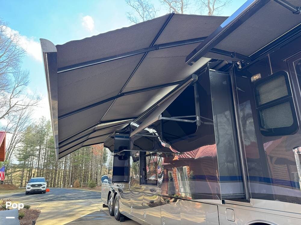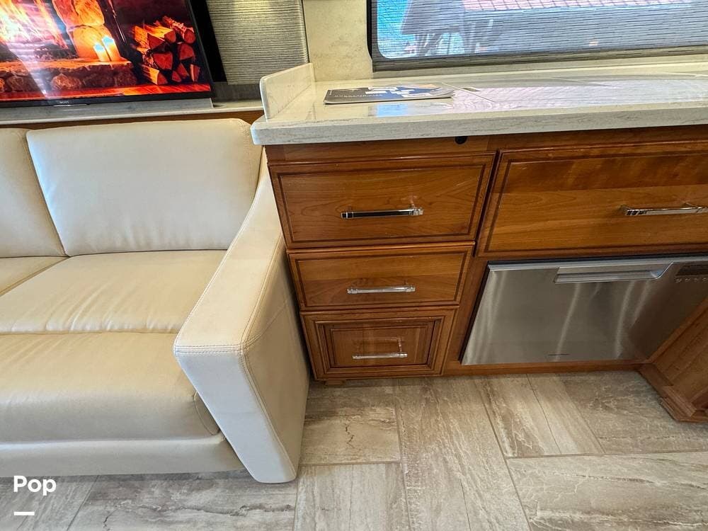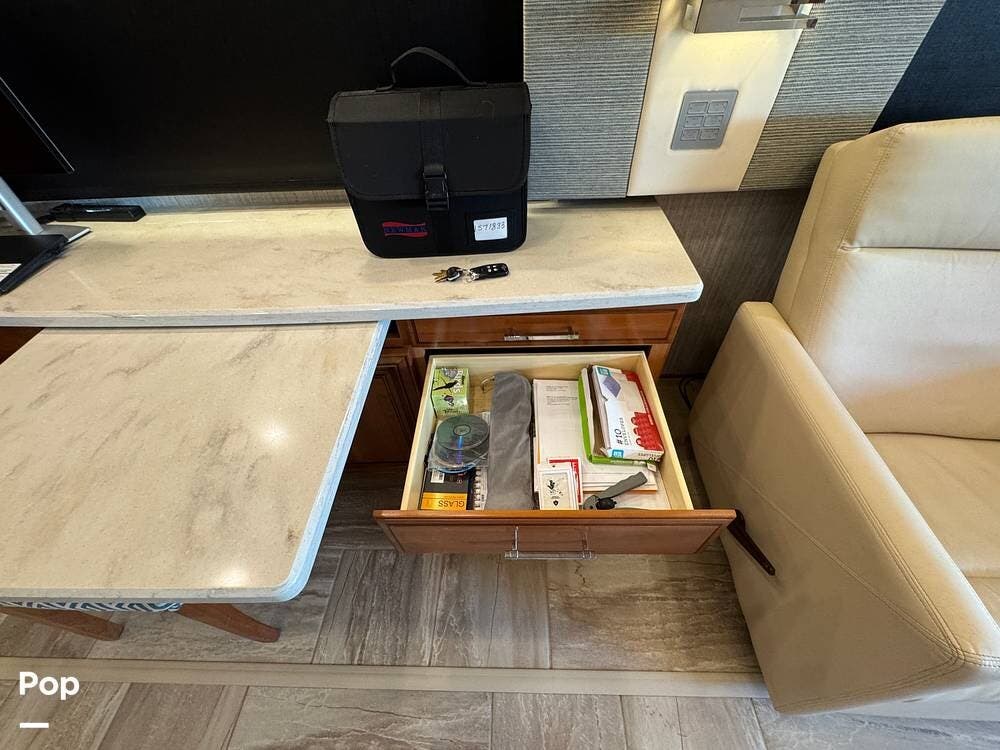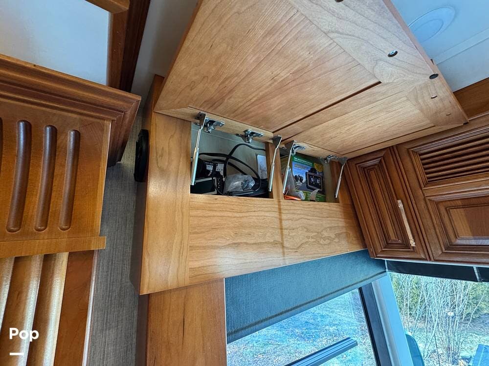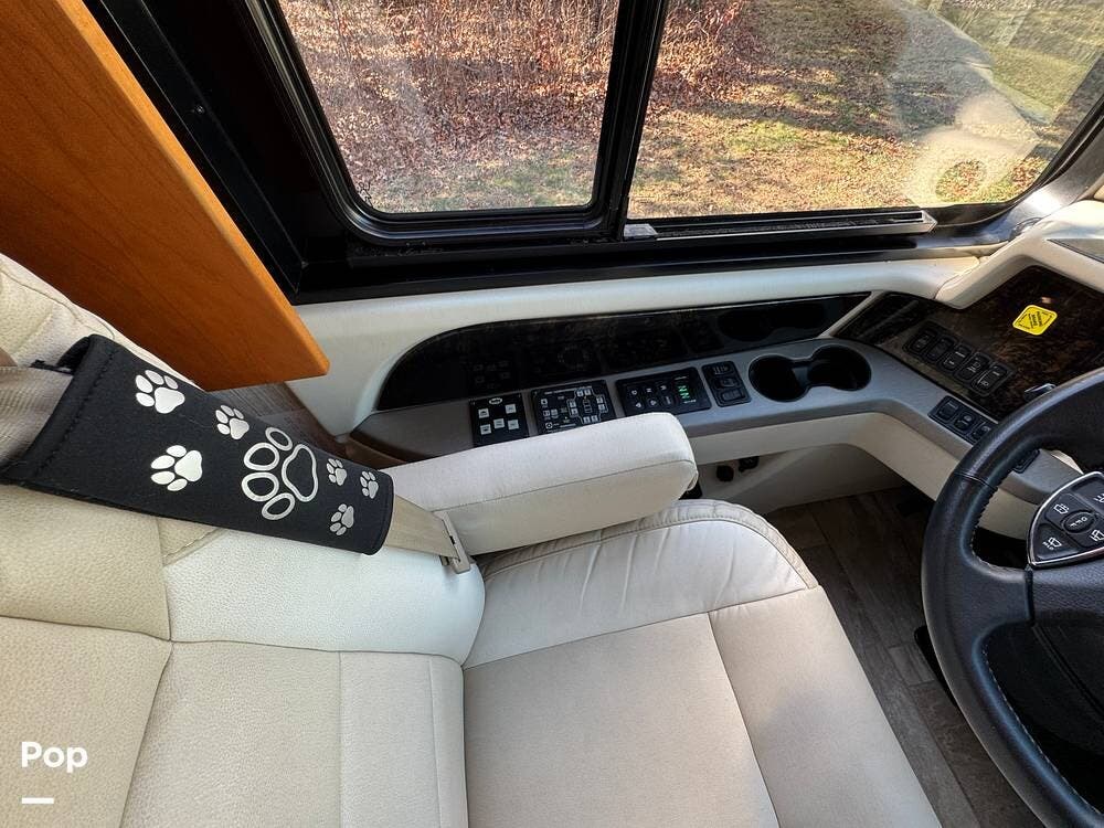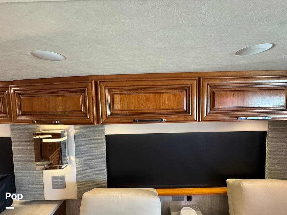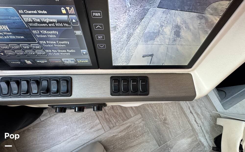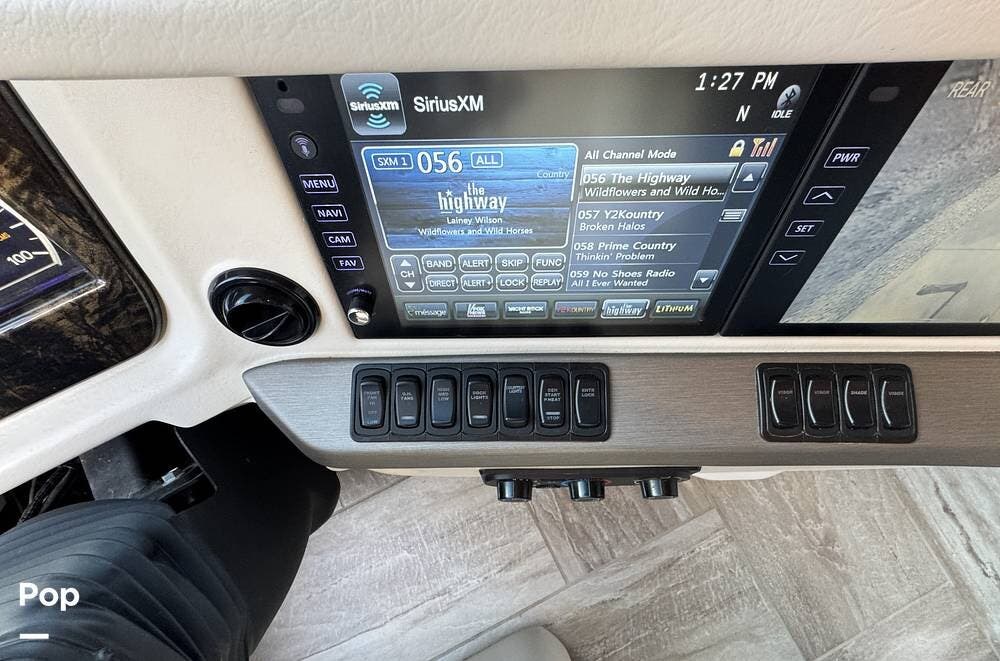 The cockpit is equipped with a fully digital dash, navigation, satellite radio, and a comprehensive 360-degree camera system providing full surround visibility. Side cameras automatically activate with turn signals, and split-screen views allow continuous monitoring of a towed vehicle. Both driver and passenger seats are power-adjustable, heated, and equipped with lumbar support and leg extensions, and they rotate to integrate into the living area when parked.