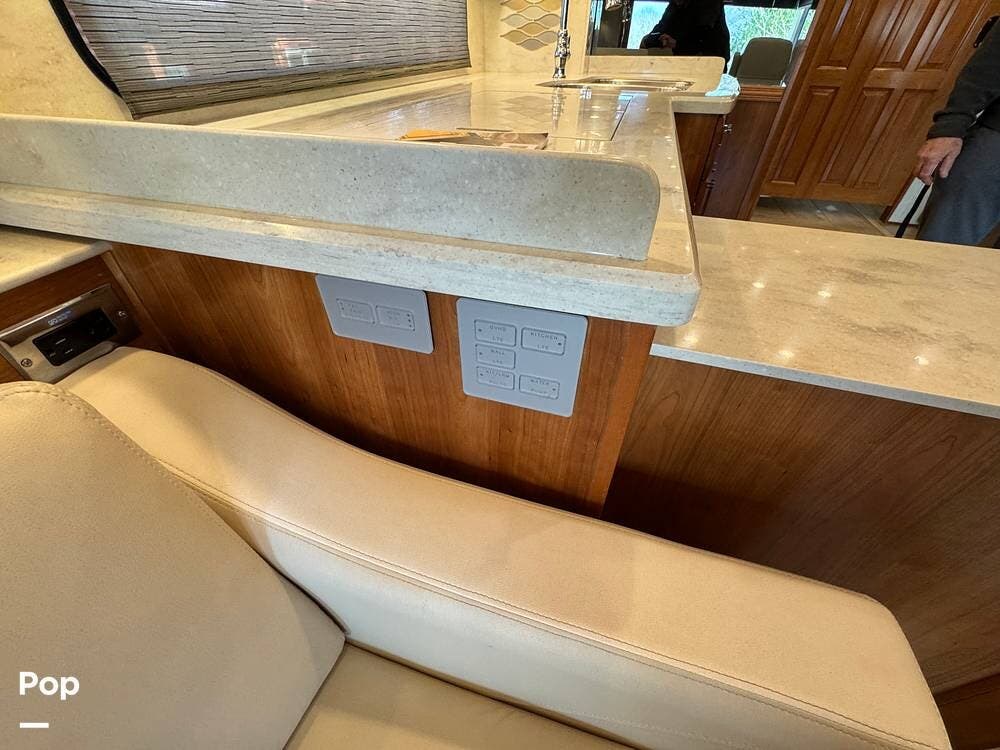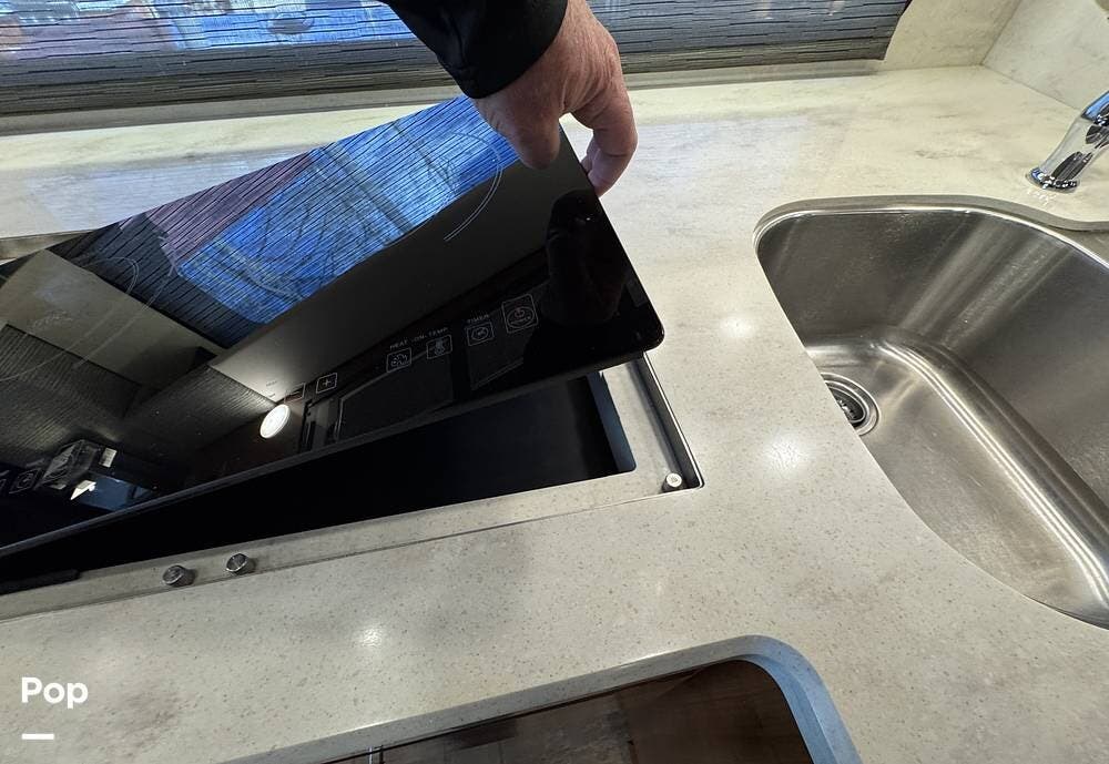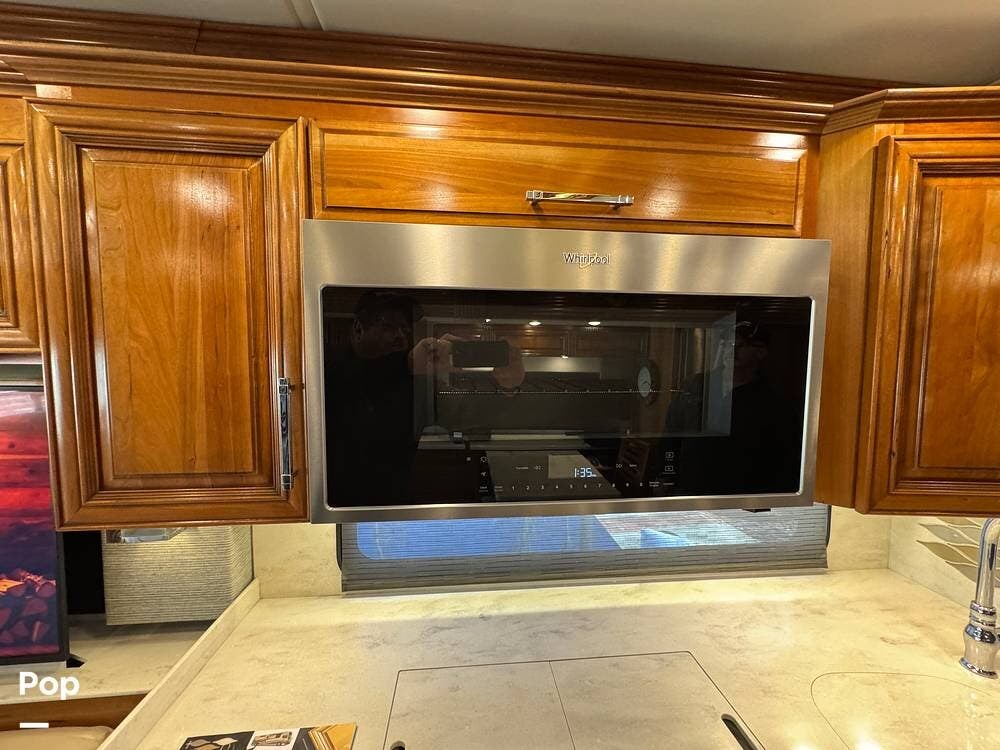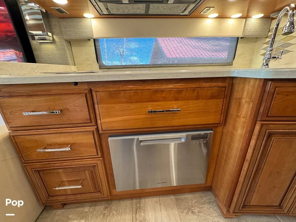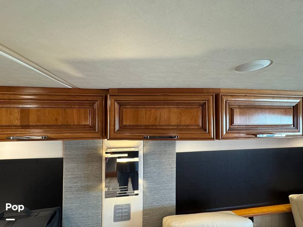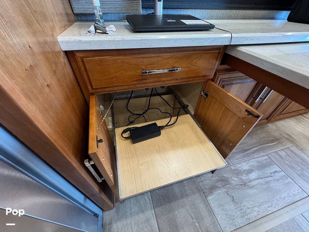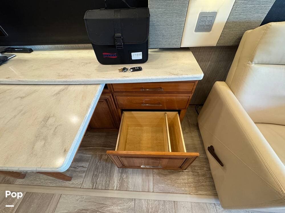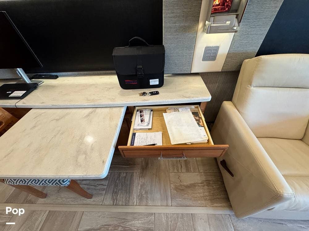The cockpit is equipped with a fully digital dash, navigation, satellite radio, and a comprehensive 360-degree camera system providing full surround visibility. Side cameras automatically activate with turn signals, and split-screen views allow continuous monitoring of a towed vehicle. Both driver and passenger seats are power-adjustable, heated, and equipped with lumbar support and leg extensions, and they rotate to integrate into the living area when parked.