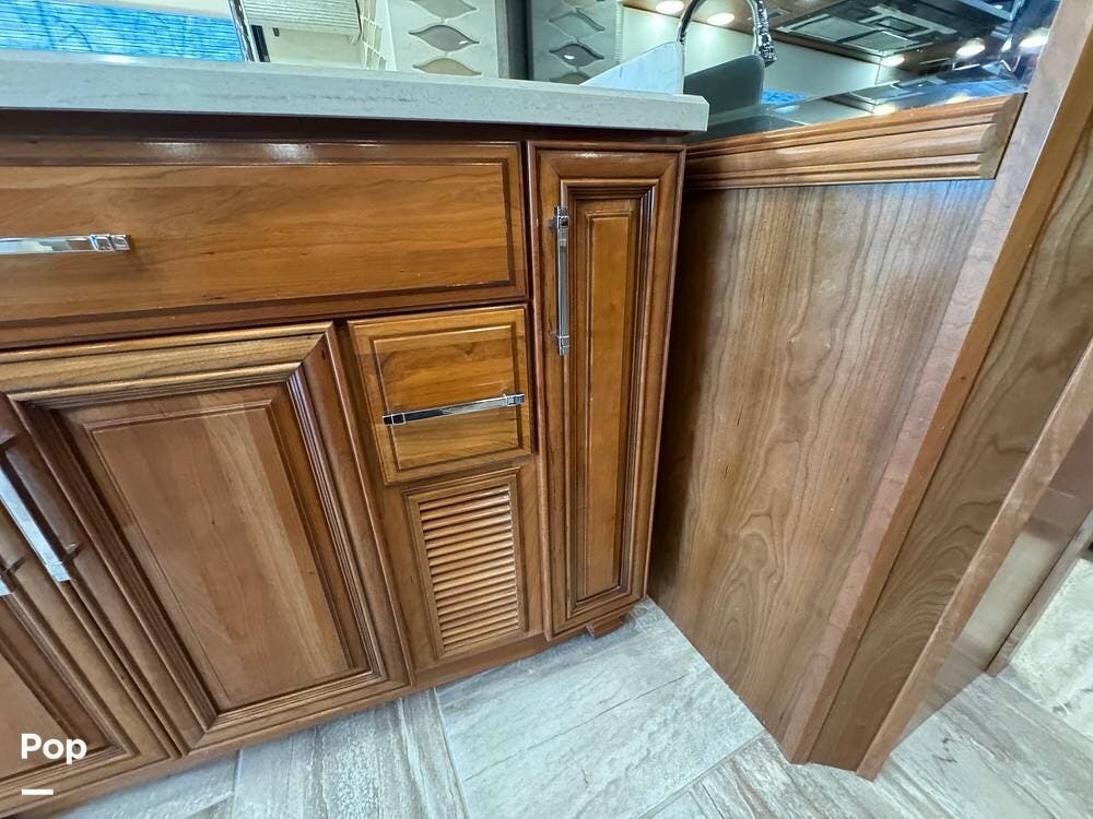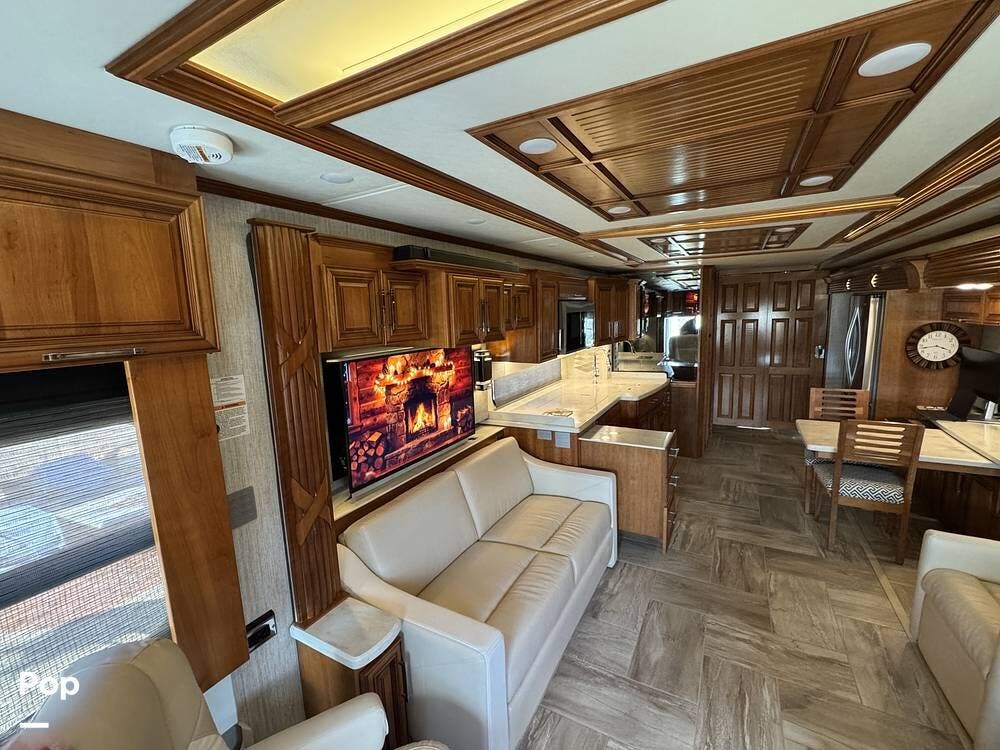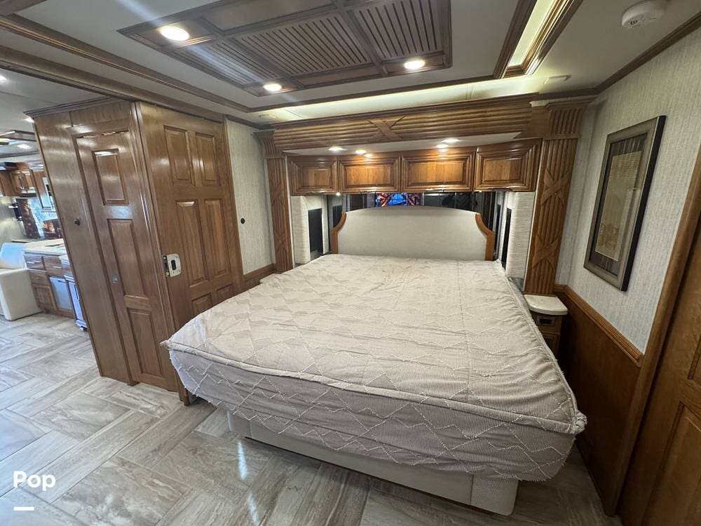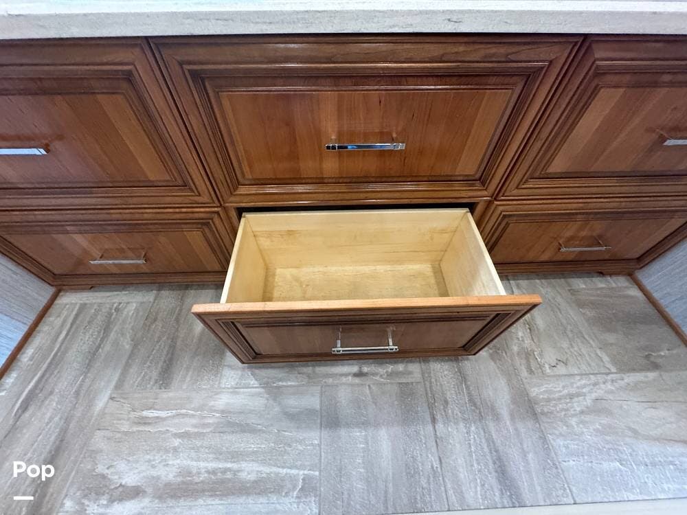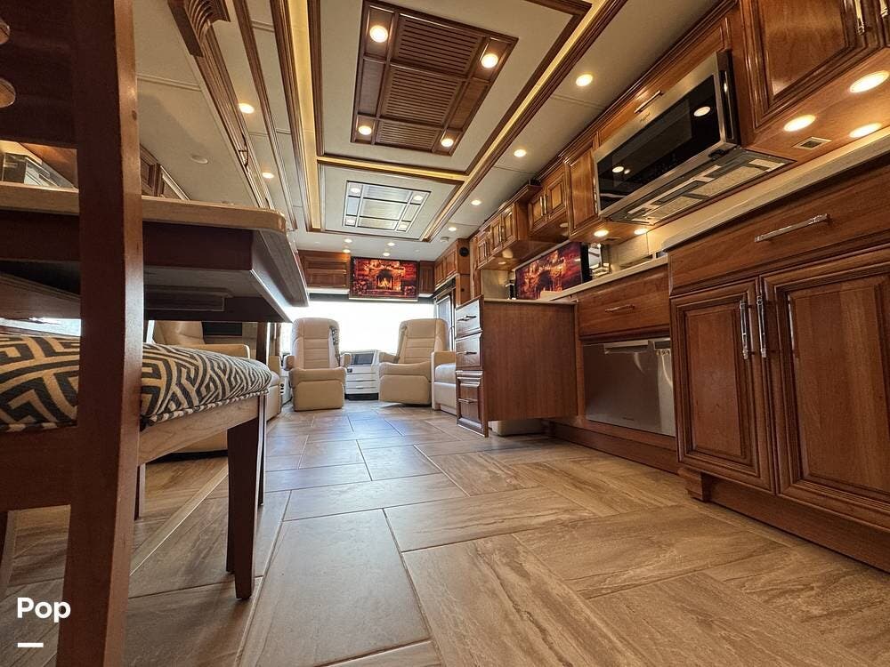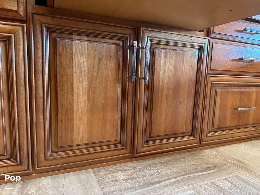 The interior reflects Newmar's premium construction standards, featuring Amish-built solid wood cabinetry with dovetail joints and hand-finished details. Cabinetry throughout the coach is notably deep and offers extensive, functional storage. All flooring, including the slide-outs, is tile, with no carpet present anywhere in the coach. Decorative ceiling woodwork with integrated drop-down vent covers conceals HVAC openings, creating a clean, refined interior.