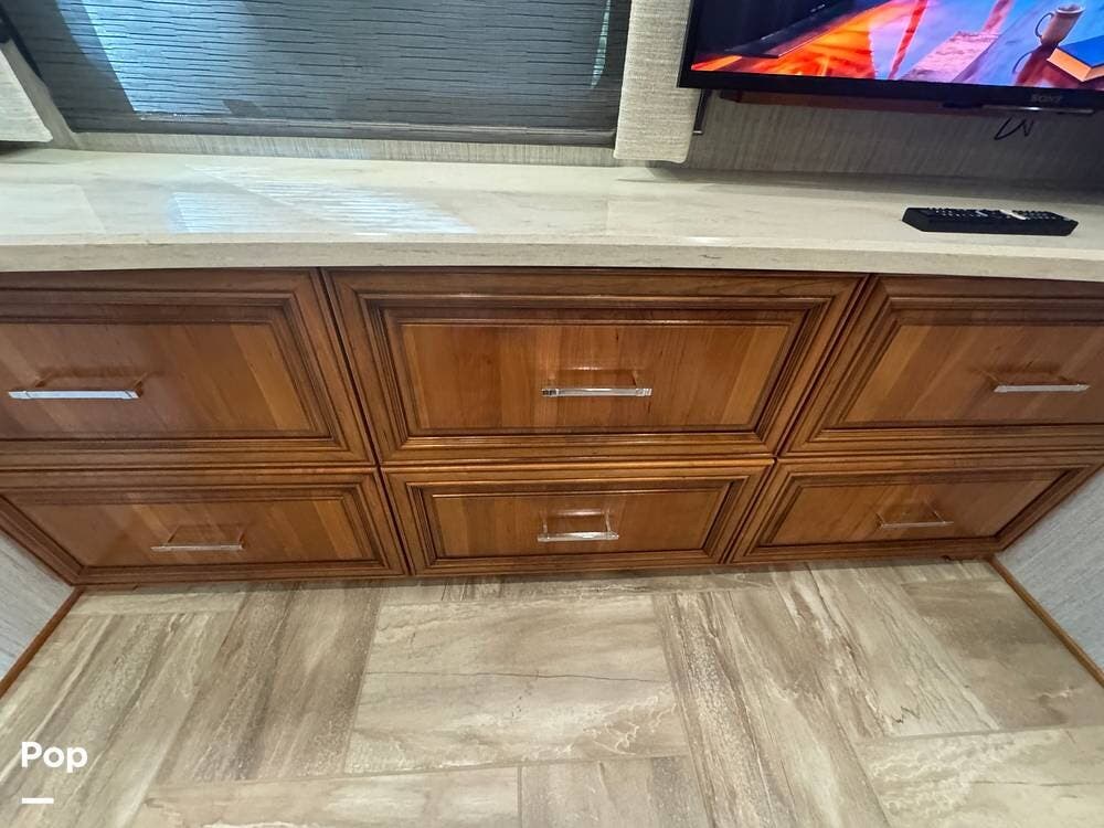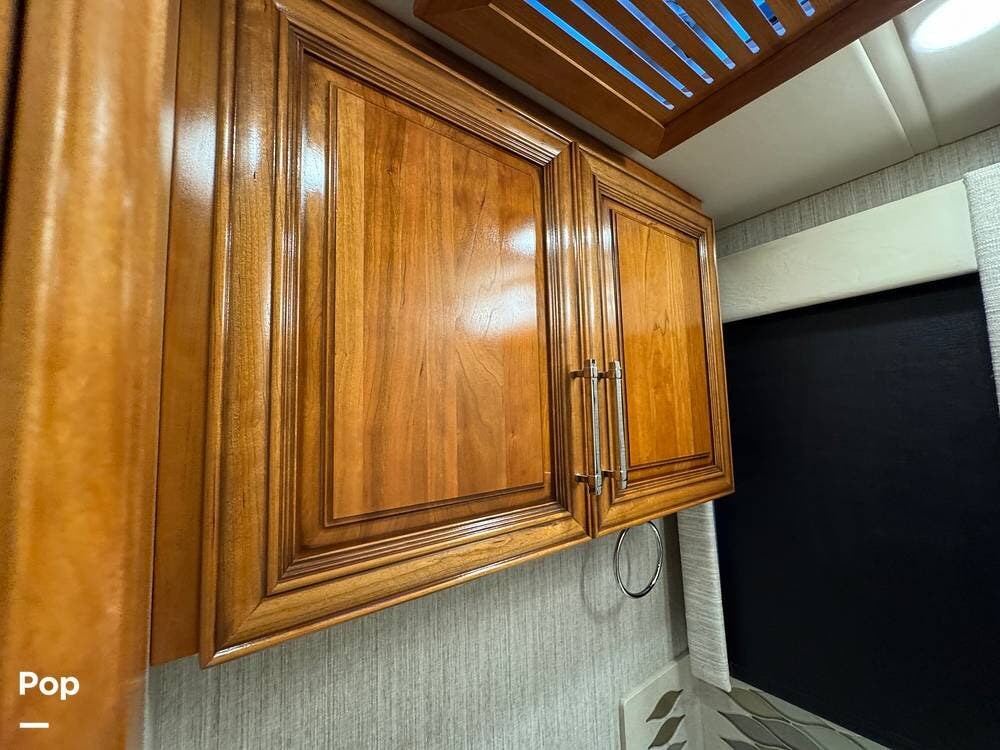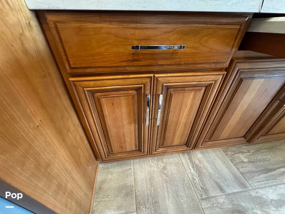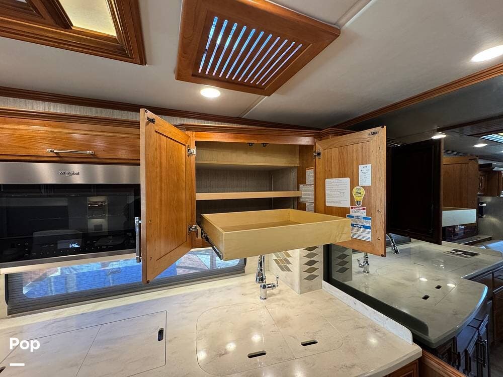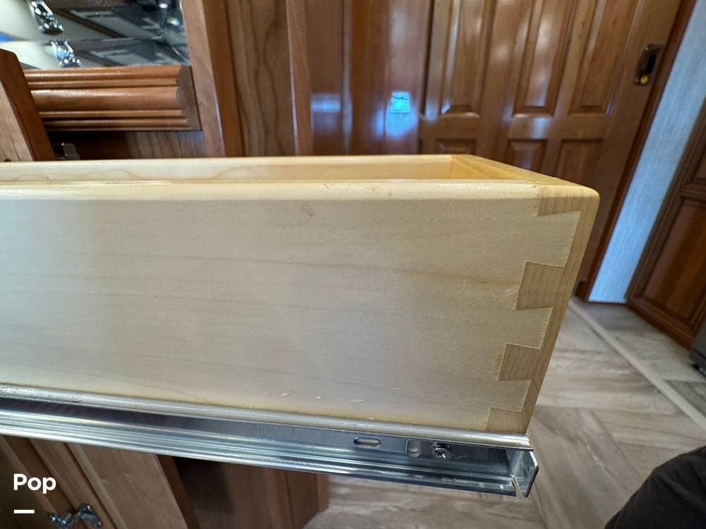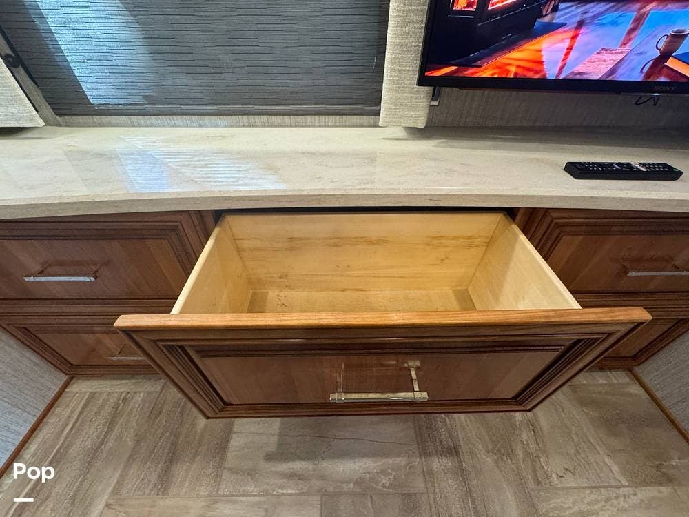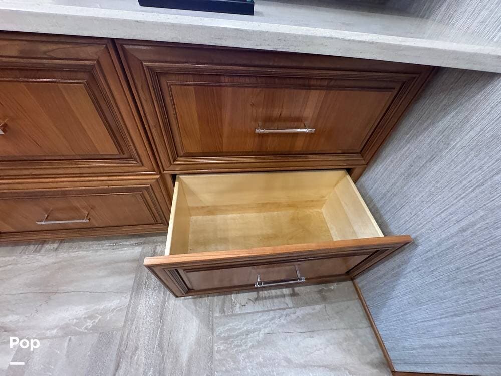 The interior reflects Newmar's premium construction standards, featuring Amish-built solid wood cabinetry with dovetail joints and hand-finished details. Cabinetry throughout the coach is notably deep and offers extensive, functional storage. All flooring, including the slide-outs, is tile, with no carpet present anywhere in the coach. Decorative ceiling woodwork with integrated drop-down vent covers conceals HVAC openings, creating a clean, refined interior.