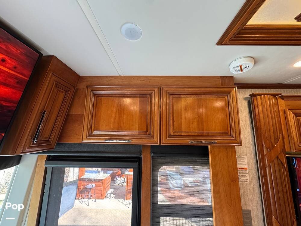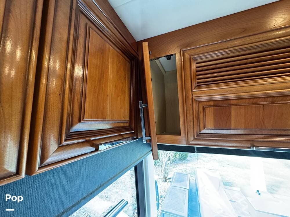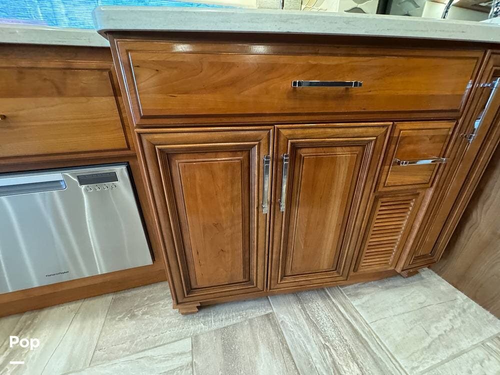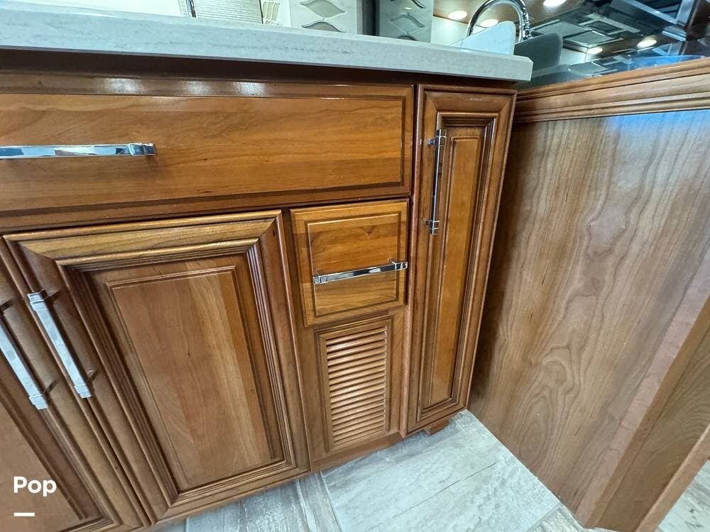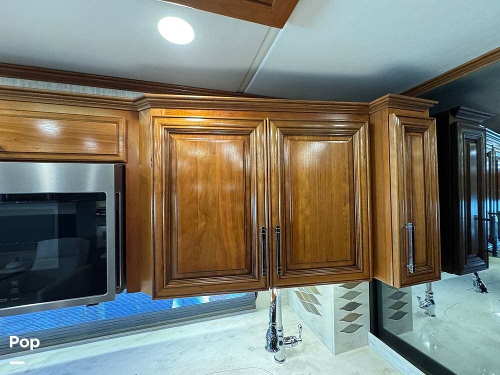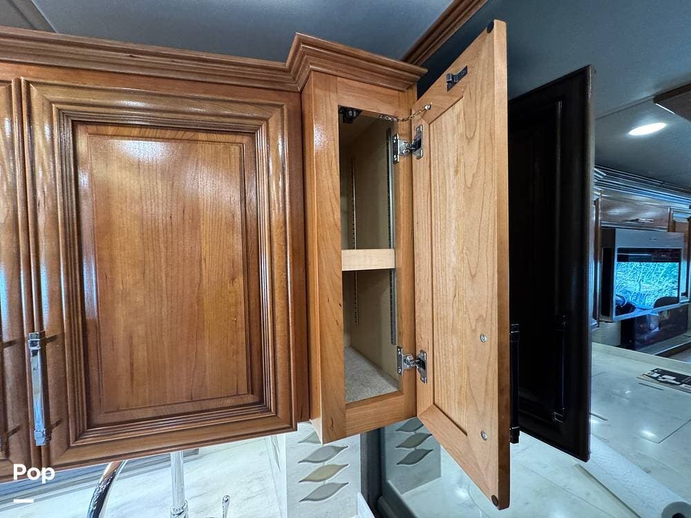The interior reflects Newmar's premium construction standards, featuring Amish-built solid wood cabinetry with dovetail joints and hand-finished details. Cabinetry throughout the coach is notably deep and offers extensive, functional storage. All flooring, including the slide-outs, is tile, with no carpet present anywhere in the coach. Decorative ceiling woodwork with integrated drop-down vent covers conceals HVAC openings, creating a clean, refined interior.
