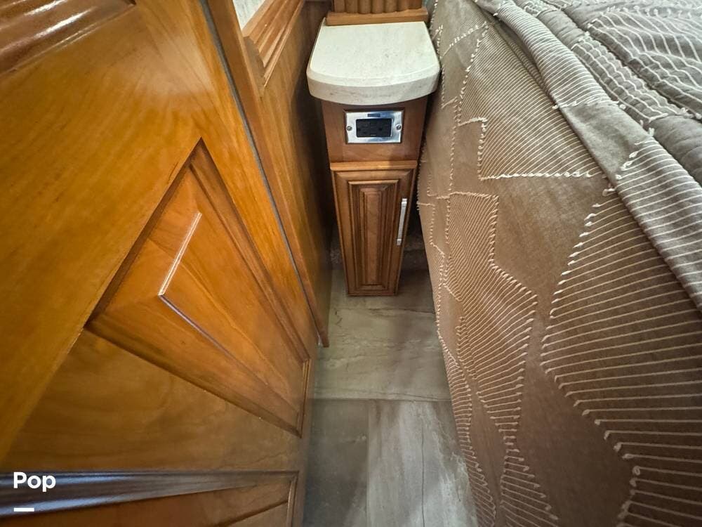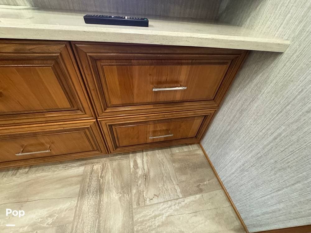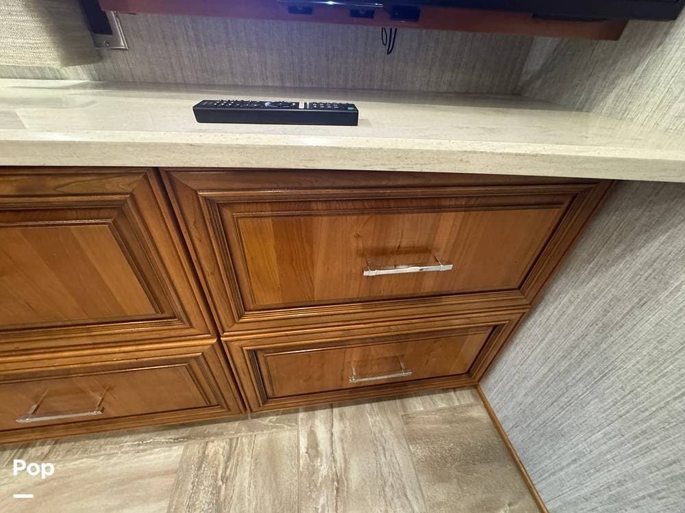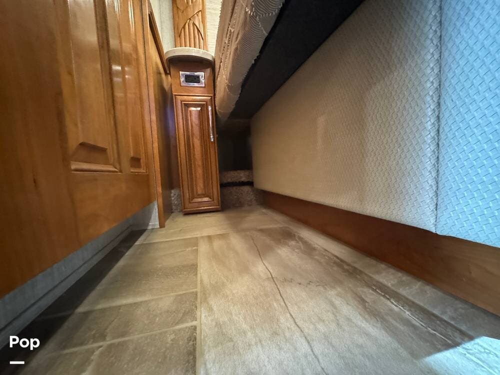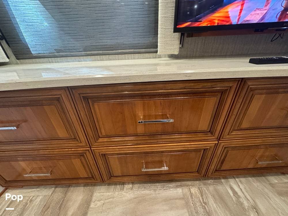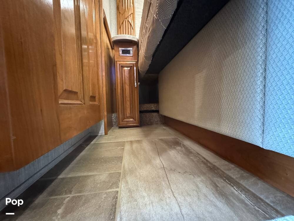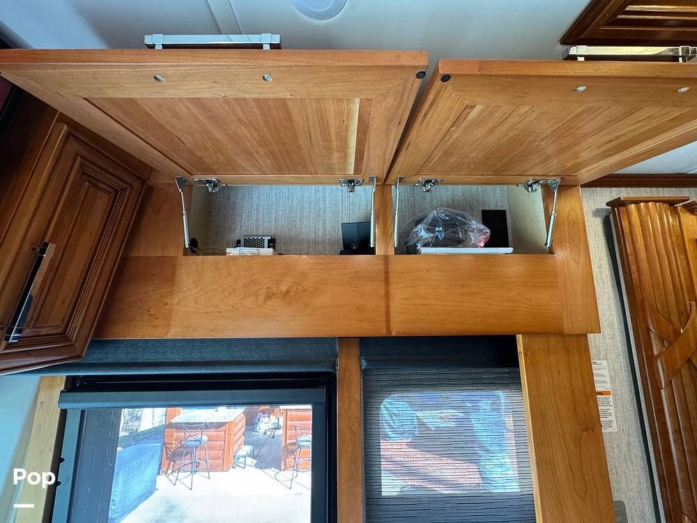 The interior reflects Newmar's premium construction standards, featuring Amish-built solid wood cabinetry with dovetail joints and hand-finished details. Cabinetry throughout the coach is notably deep and offers extensive, functional storage. All flooring, including the slide-outs, is tile, with no carpet present anywhere in the coach. Decorative ceiling woodwork with integrated drop-down vent covers conceals HVAC openings, creating a clean, refined interior.