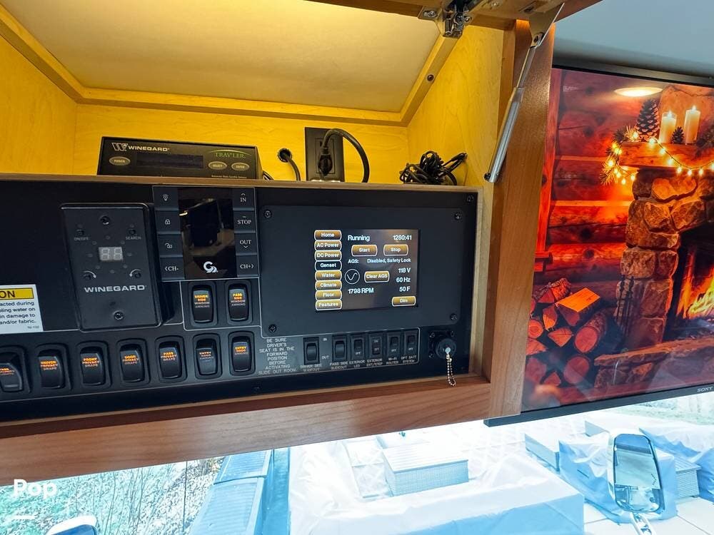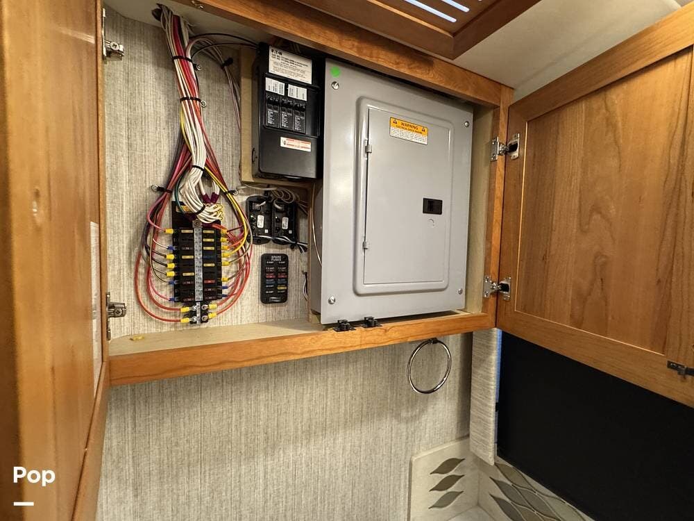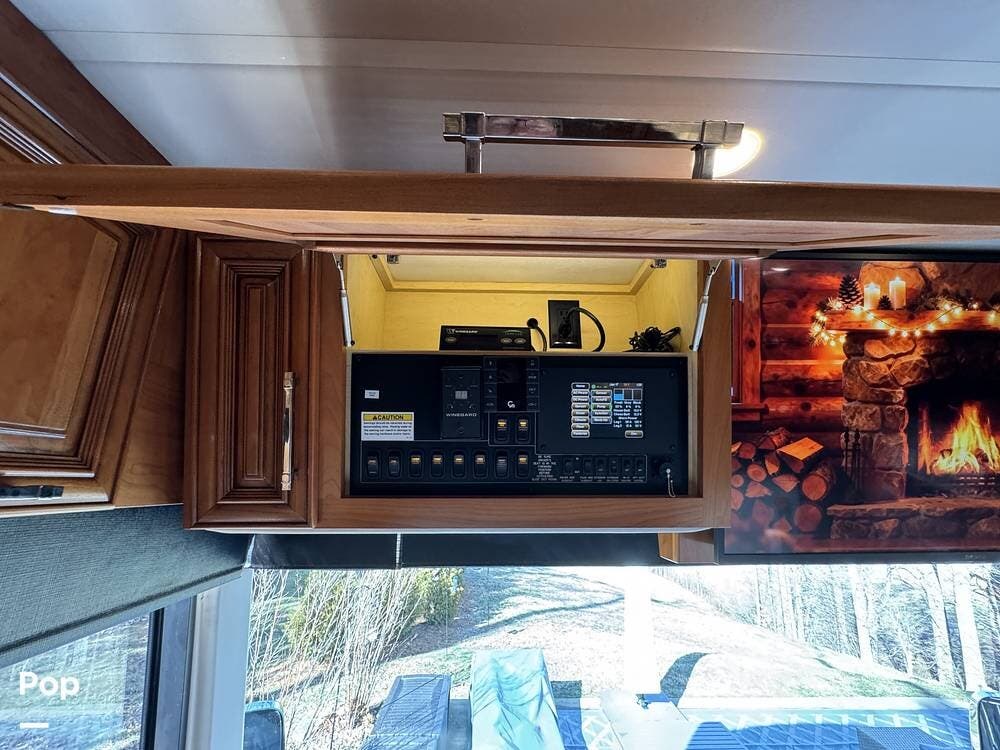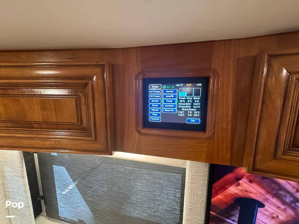 This Mountain Aire is an all-electric coach with no propane systems. Electrical power is supported by eight house batteries, a 3,500-watt inverter, and a 12.5 kW Cummins generator. An automatic transfer switch prioritizes generator power when running, while shore power is managed through an automatic 50-amp power reel. A Bluetooth-enabled surge protection system monitors incoming power. All major systems -- including electrical, lighting, climate control, slides, awnings, and diagnostics -- are managed through Newmar's SilverLeaf control system, with full access from both the front cockpit and the bedroom.