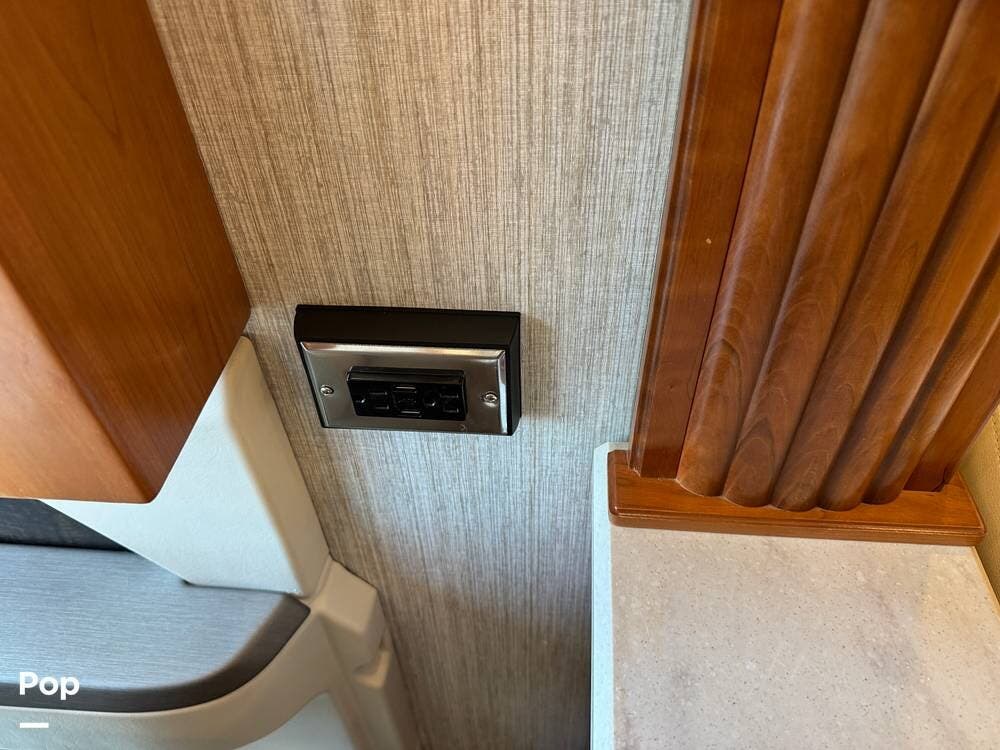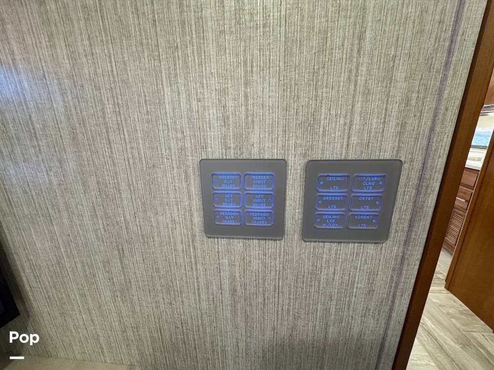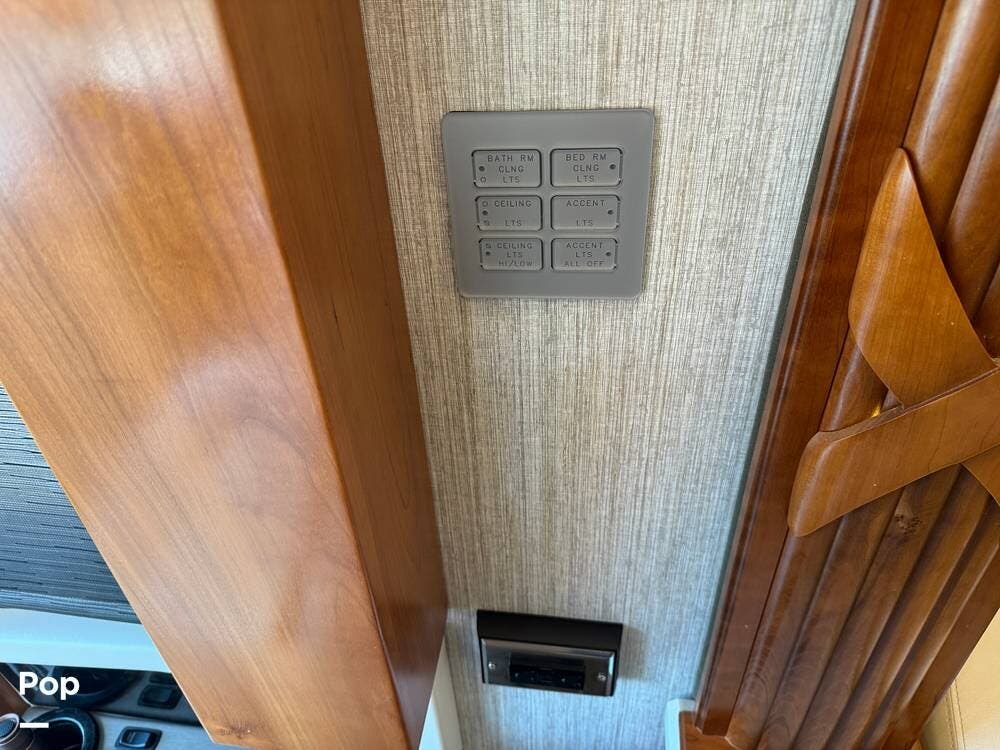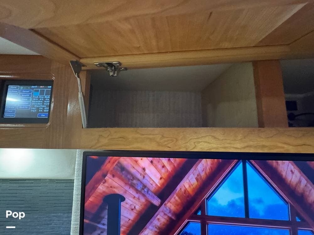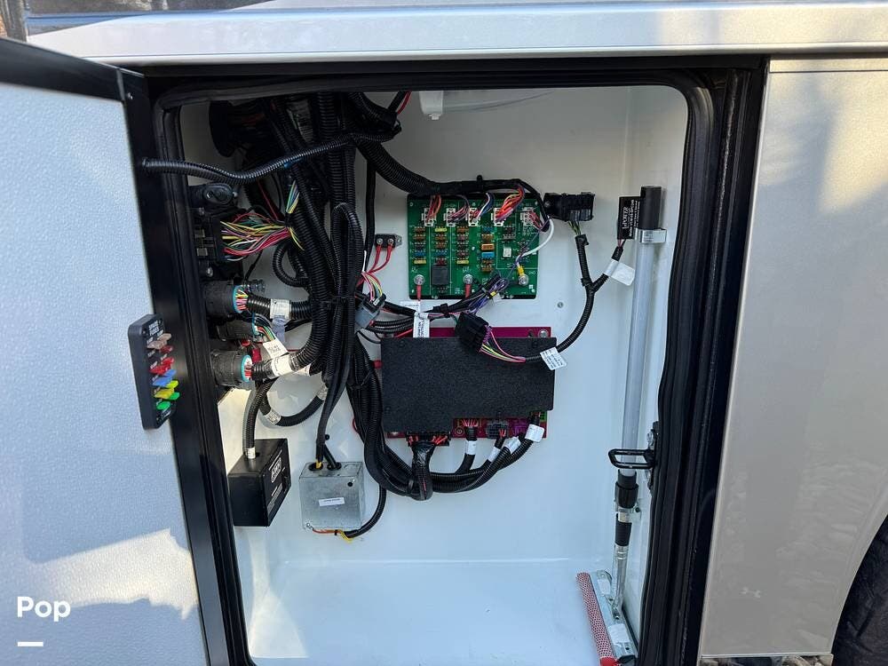 This Mountain Aire is an all-electric coach with no propane systems. Electrical power is supported by eight house batteries, a 3,500-watt inverter, and a 12.5 kW Cummins generator. An automatic transfer switch prioritizes generator power when running, while shore power is managed through an automatic 50-amp power reel. A Bluetooth-enabled surge protection system monitors incoming power. All major systems -- including electrical, lighting, climate control, slides, awnings, and diagnostics -- are managed through Newmar's SilverLeaf control system, with full access from both the front cockpit and the bedroom.
