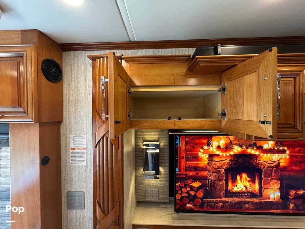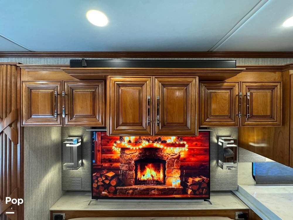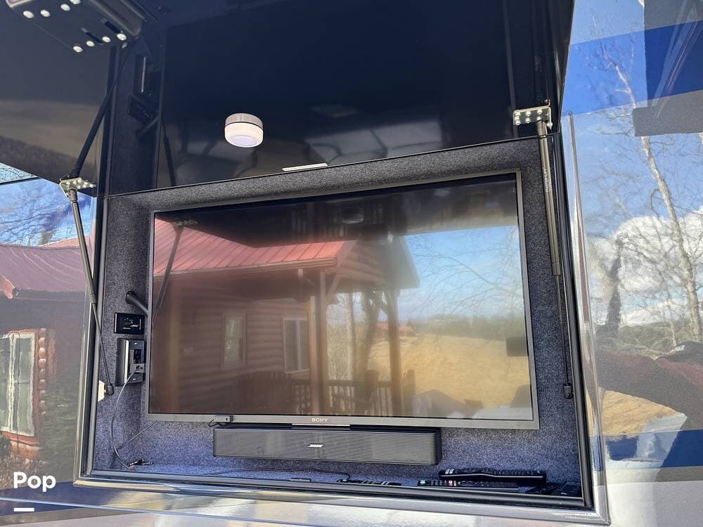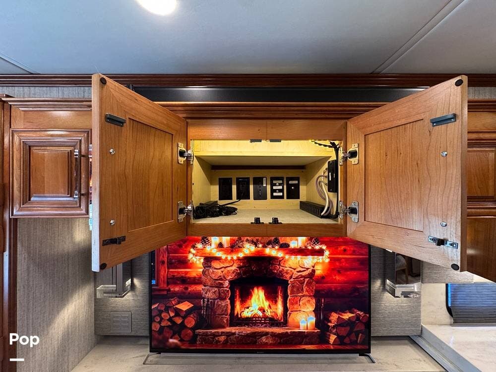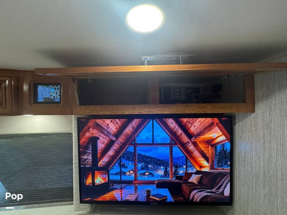 The living area includes a queen sleeper sofa with a built-in powered air mattress, power seating, an automated TV lift, accent lighting, and multiple power and USB outlets throughout.