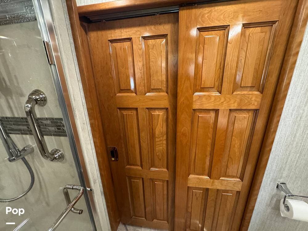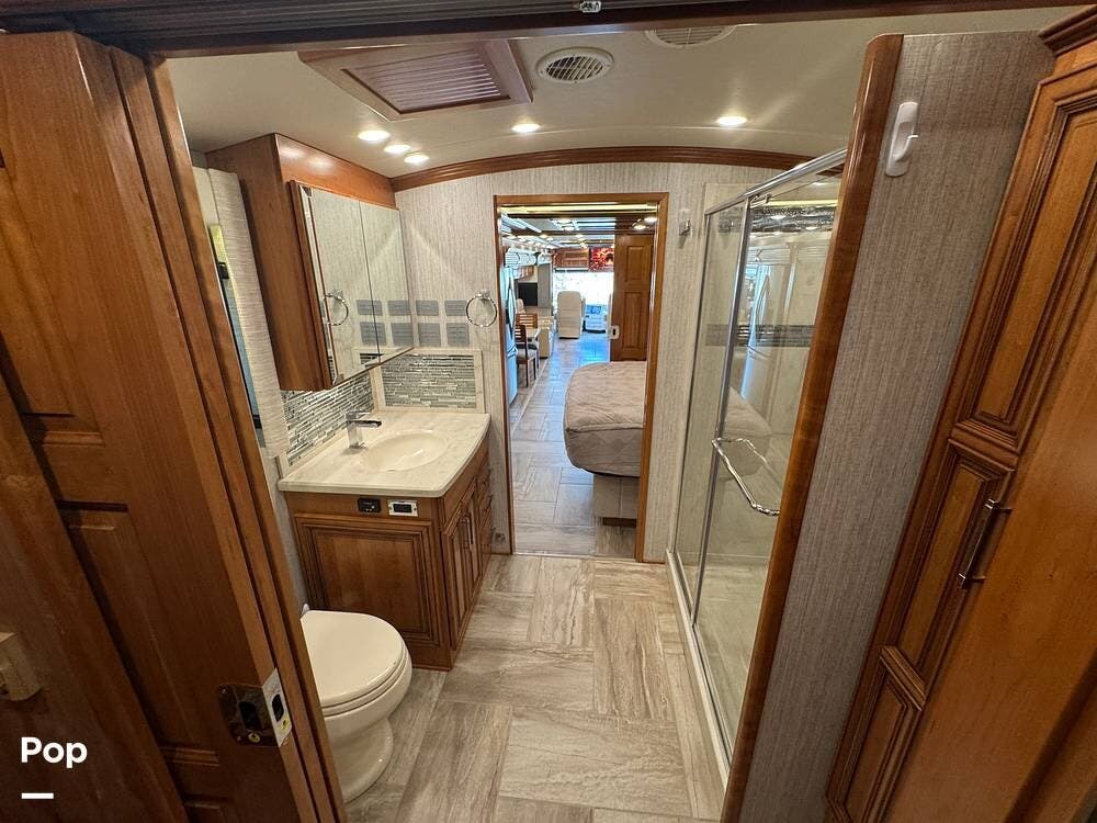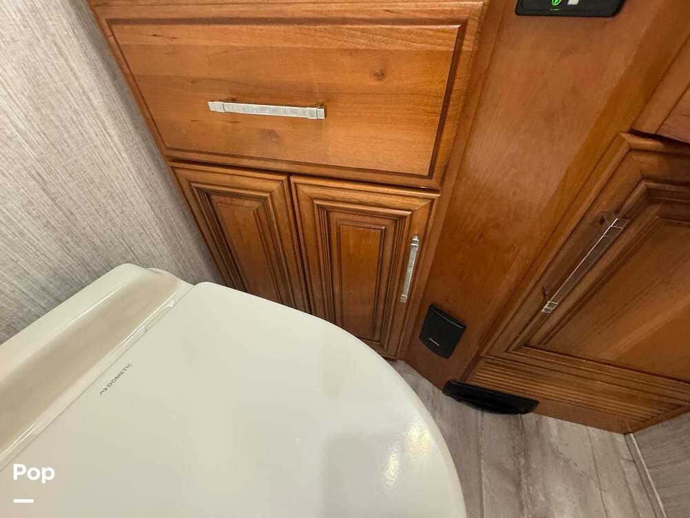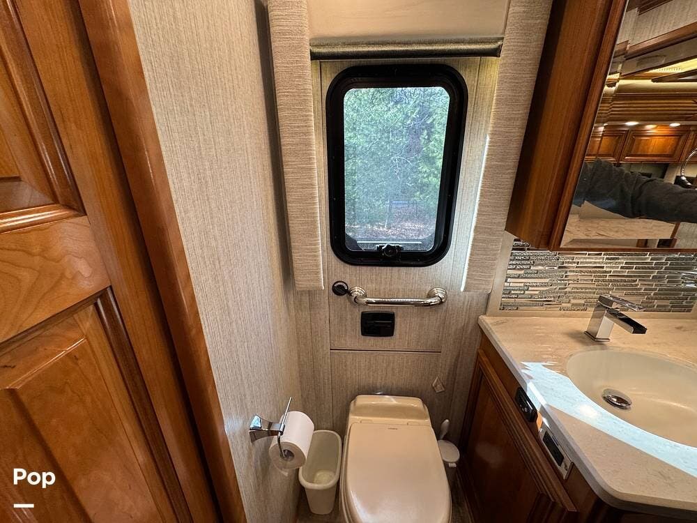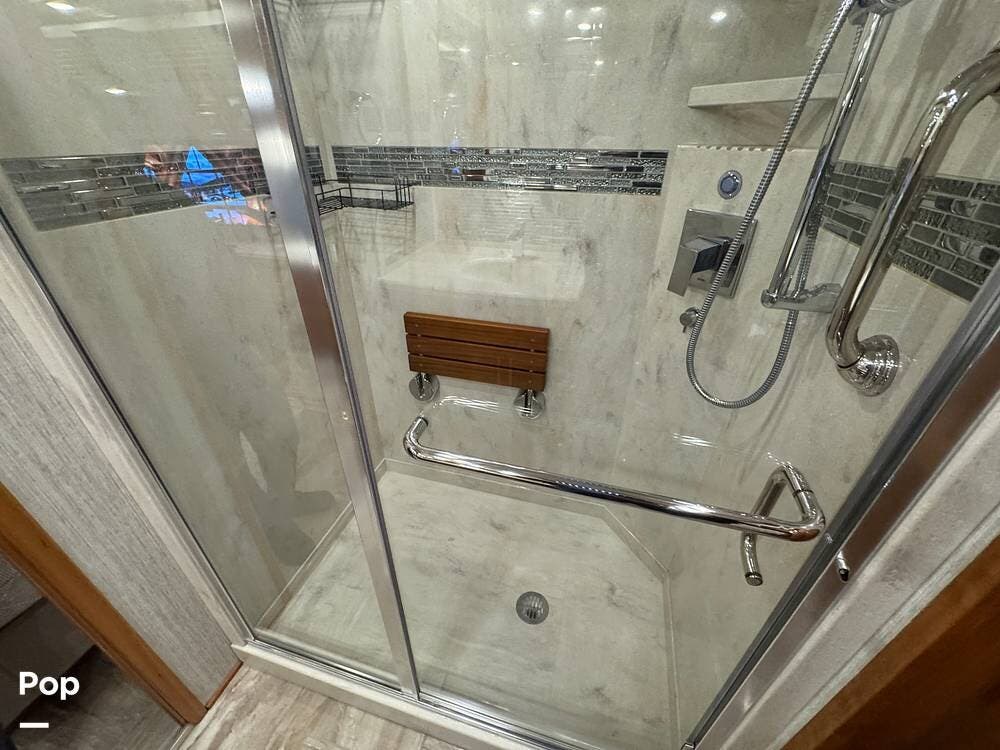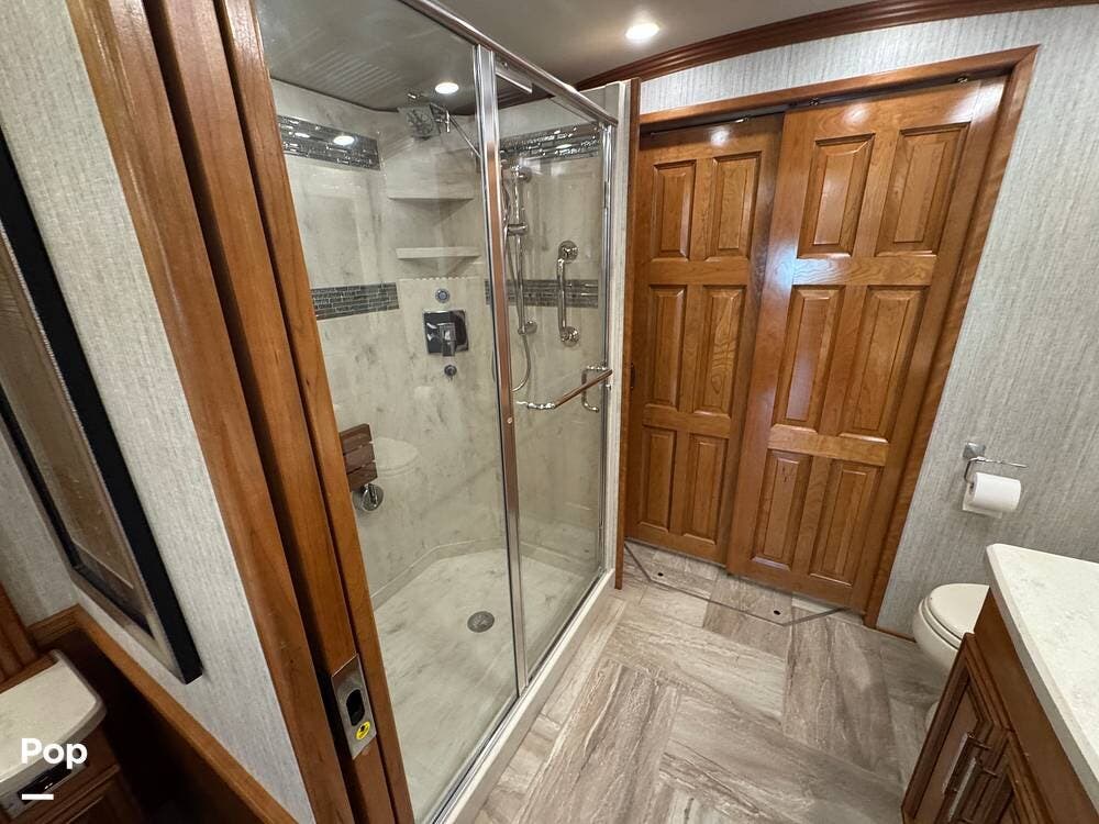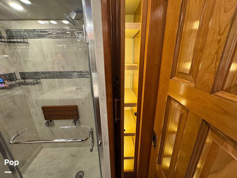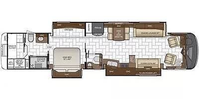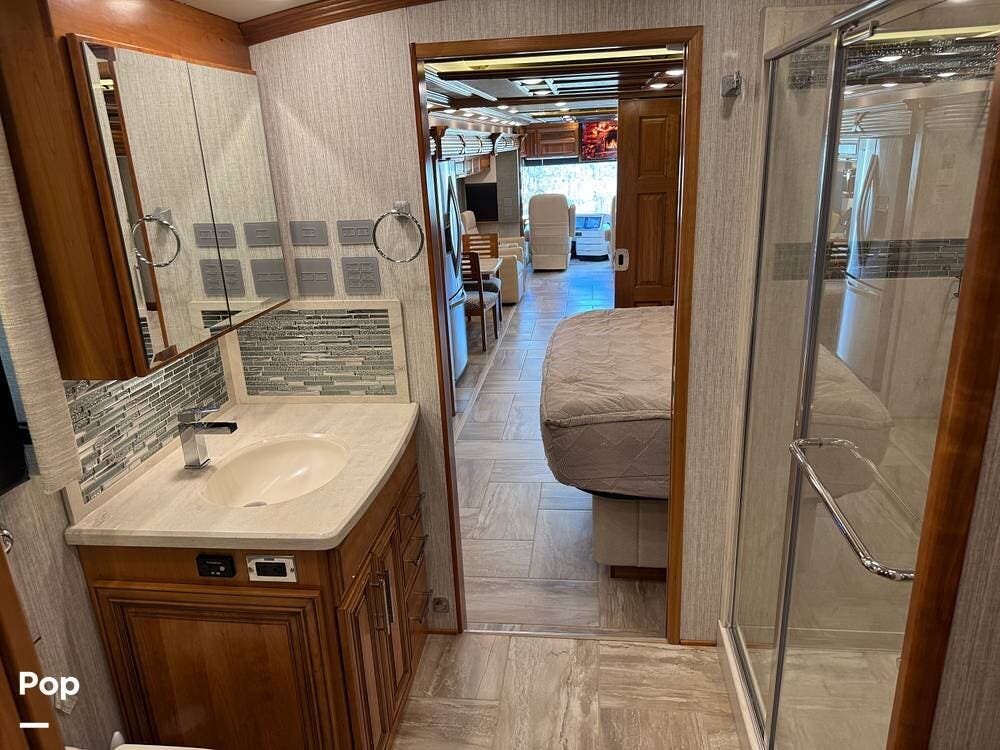 A key advantage of this floorplan is that, with all slides retracted, usable centerline access remains through the coach. The bathroom, refrigerator, and kitchen can be accessed while traveling without deploying slides. The mid-coach half bath provides ample space and includes a macerator toilet and vacuum inlet. The rear bath features a sink-and-a-half layout, substantial cabinetry, and one of the largest showers available in a Class A motorcoach. Both toilets are macerator-style and are monitored through digital tank level displays visible locally and through the SilverLeaf system. The Aquamizer function recirculates water internally until hot, minimizing water waste during dry camping.