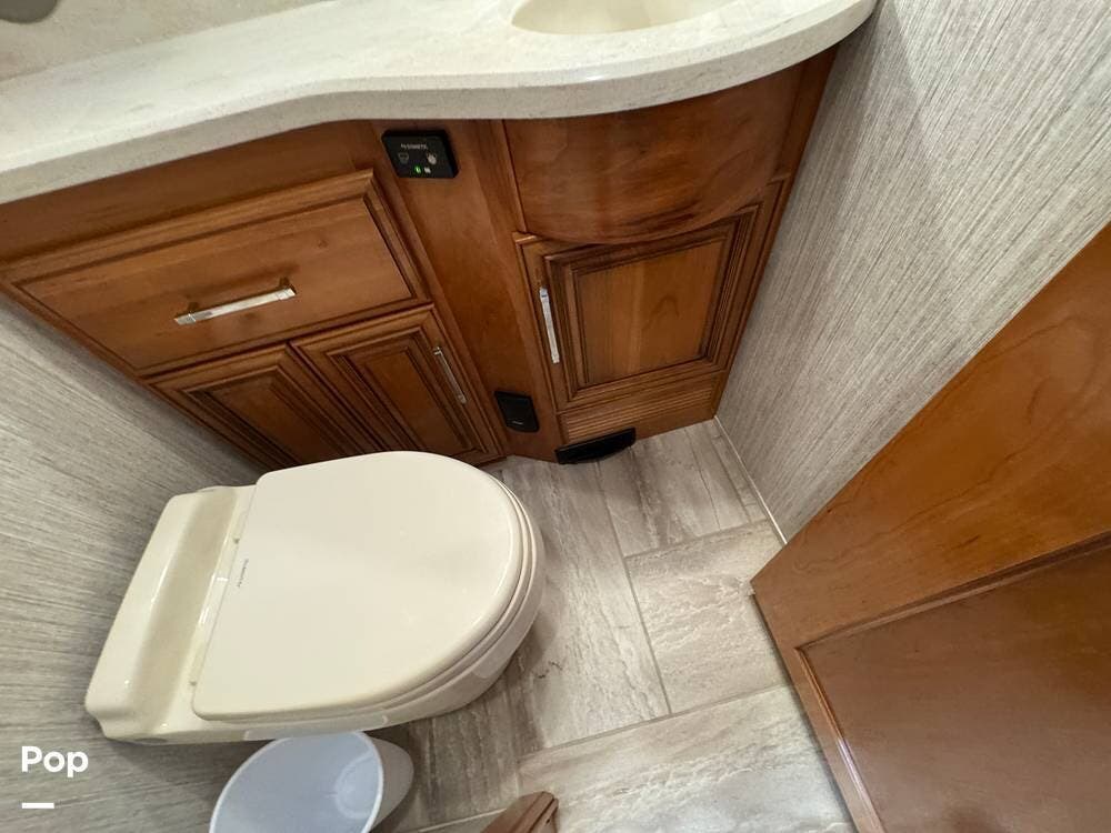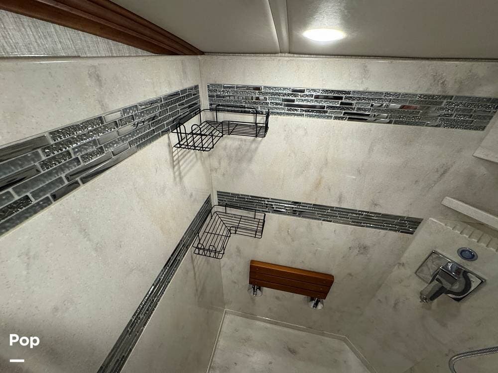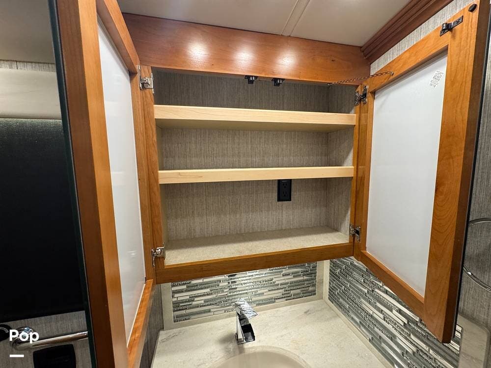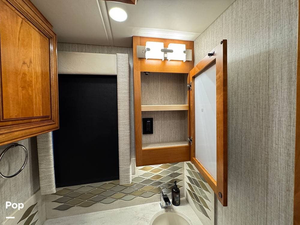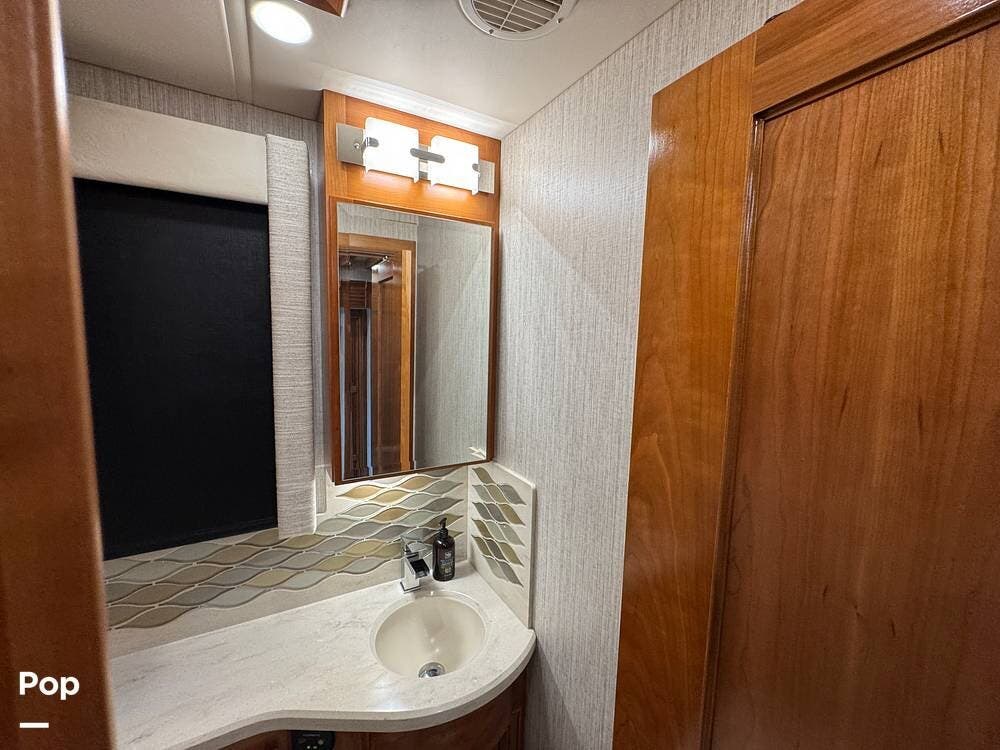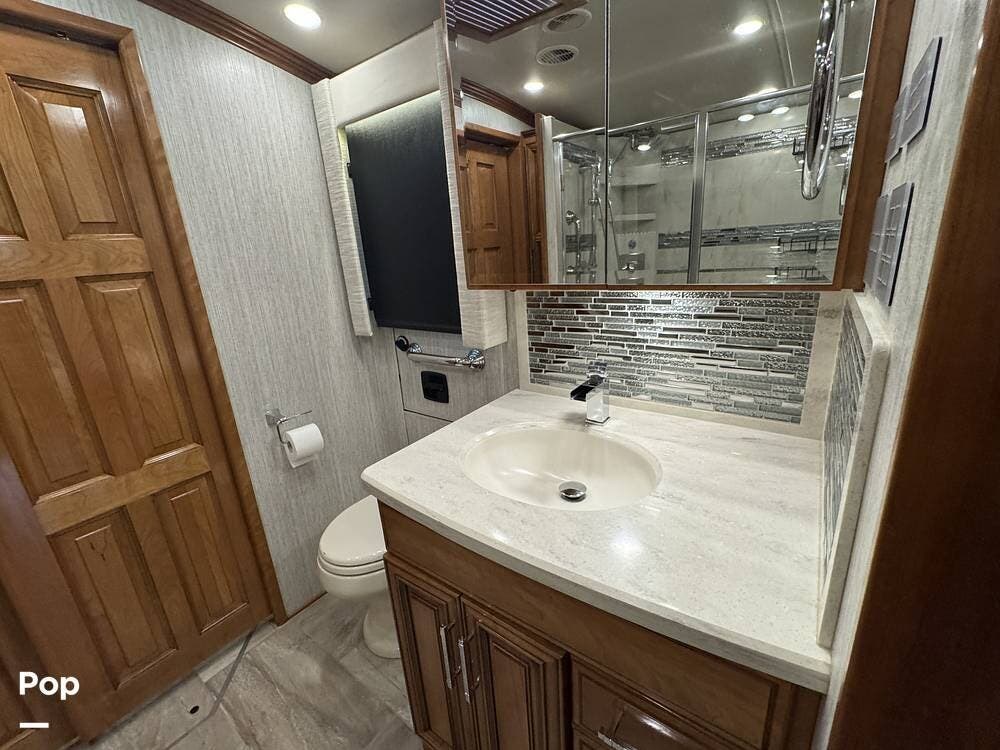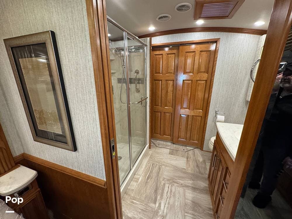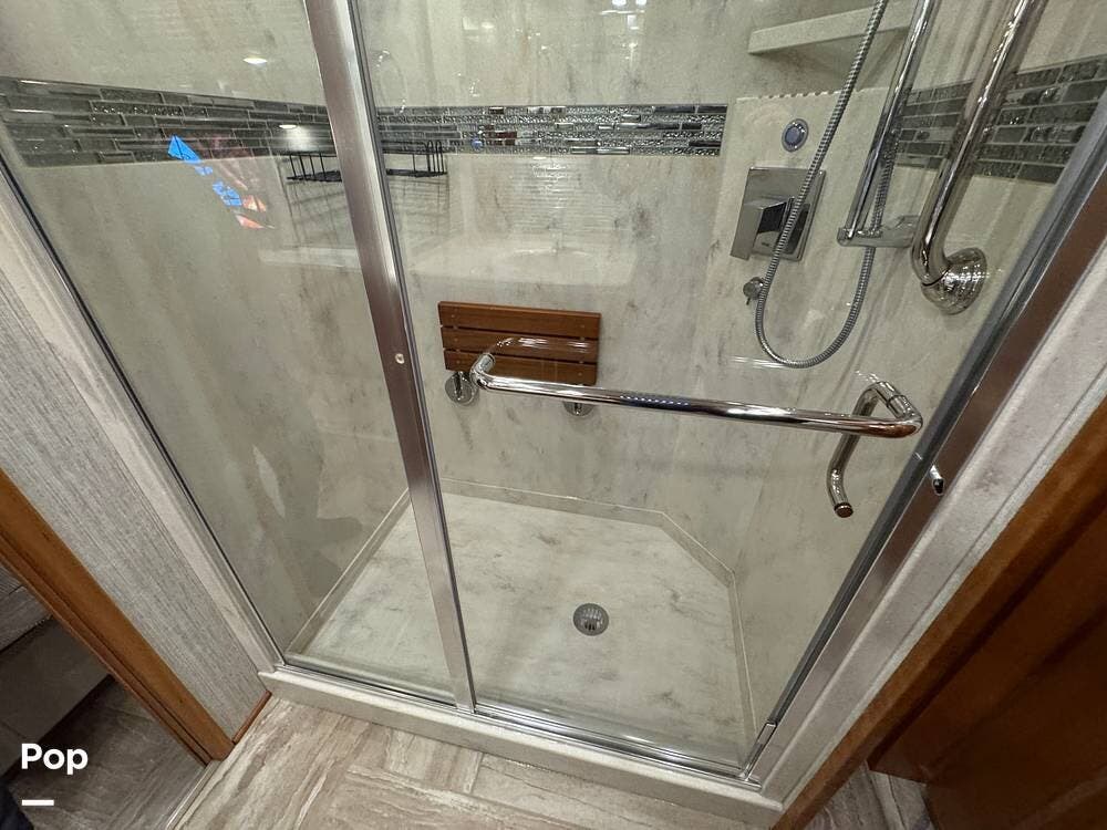 A key advantage of this floorplan is that, with all slides retracted, usable centerline access remains through the coach. The bathroom, refrigerator, and kitchen can be accessed while traveling without deploying slides. The mid-coach half bath provides ample space and includes a macerator toilet and vacuum inlet. The rear bath features a sink-and-a-half layout, substantial cabinetry, and one of the largest showers available in a Class A motorcoach. Both toilets are macerator-style and are monitored through digital tank level displays visible locally and through the SilverLeaf system. The Aquamizer function recirculates water internally until hot, minimizing water waste during dry camping.