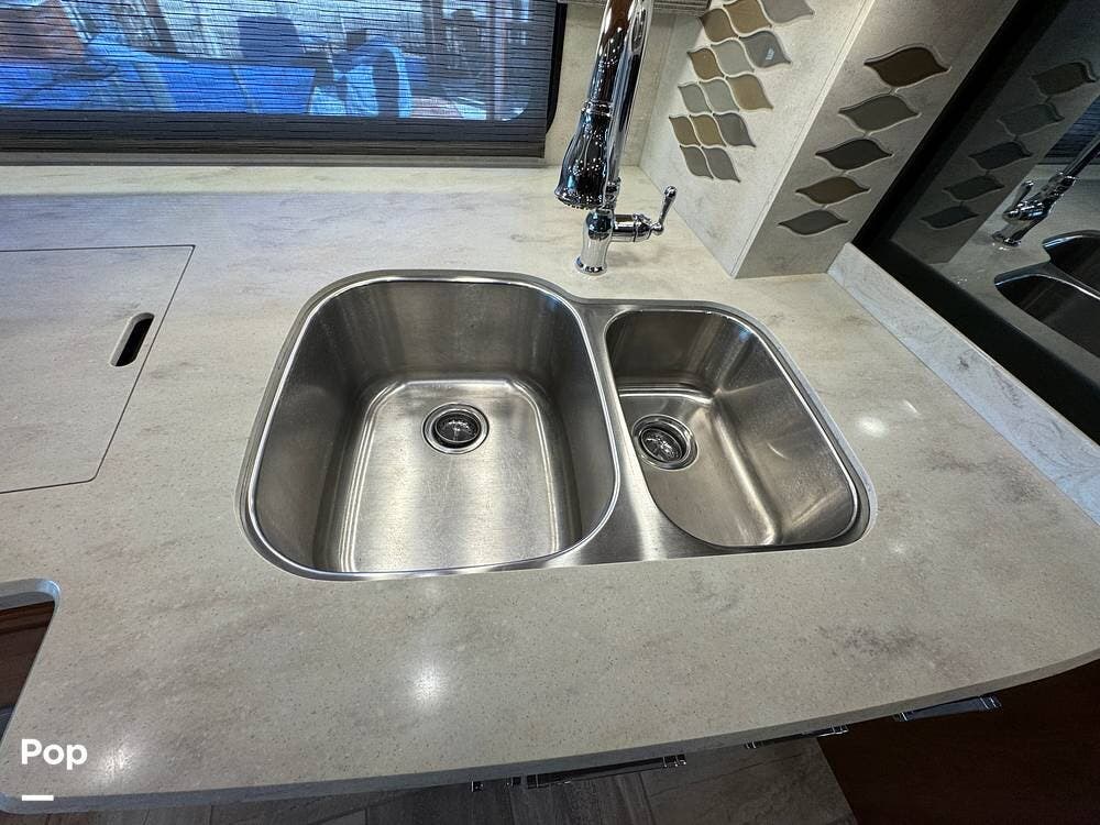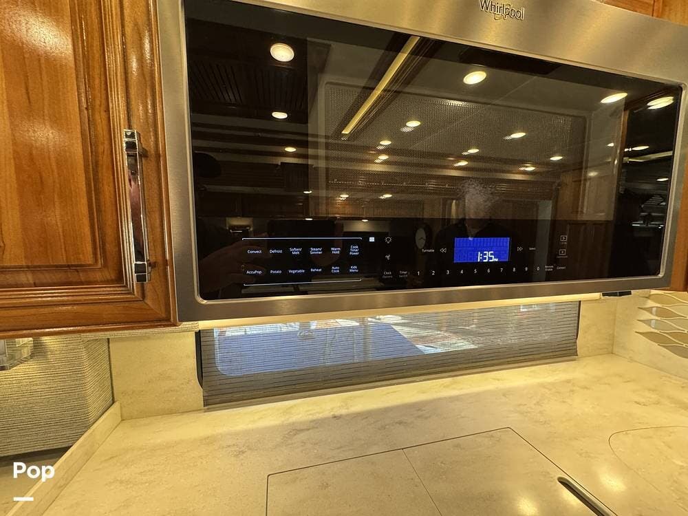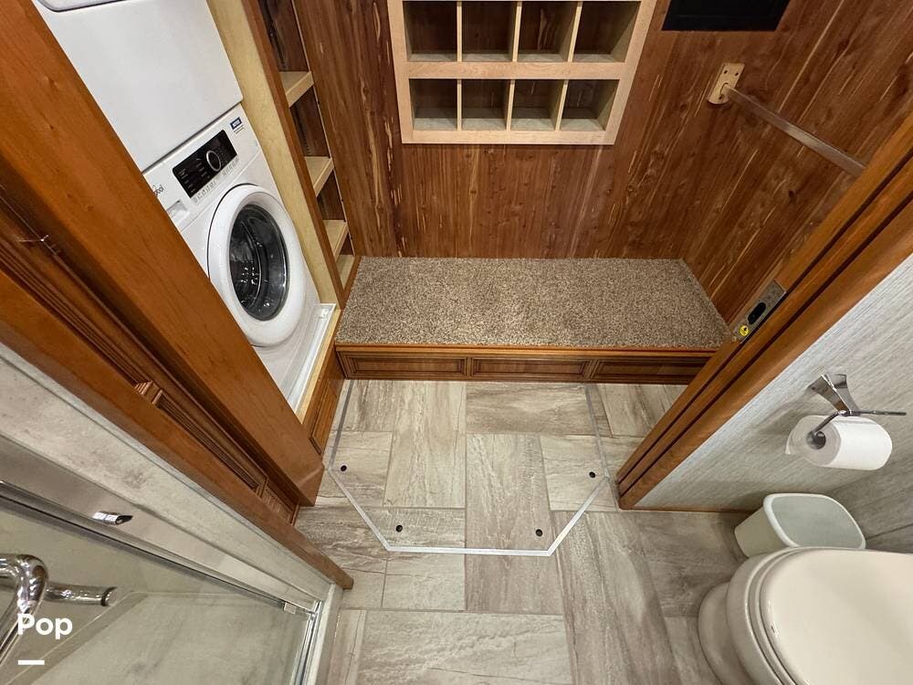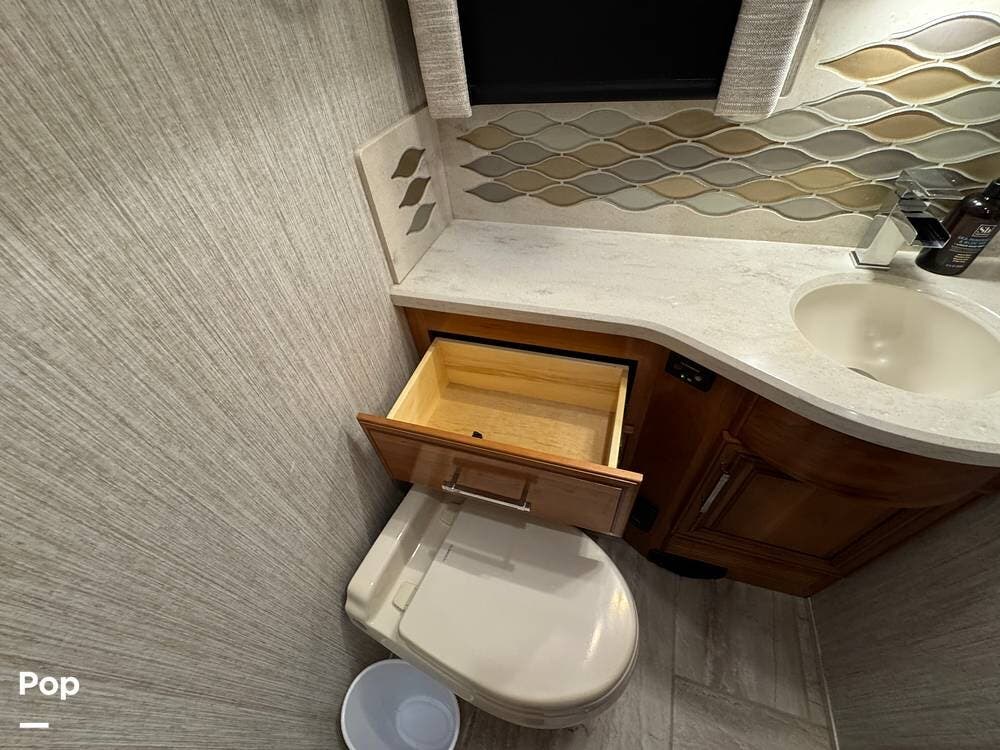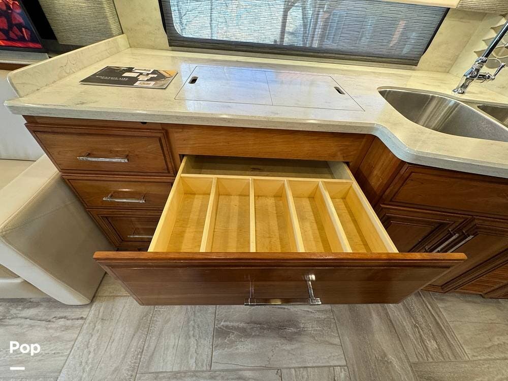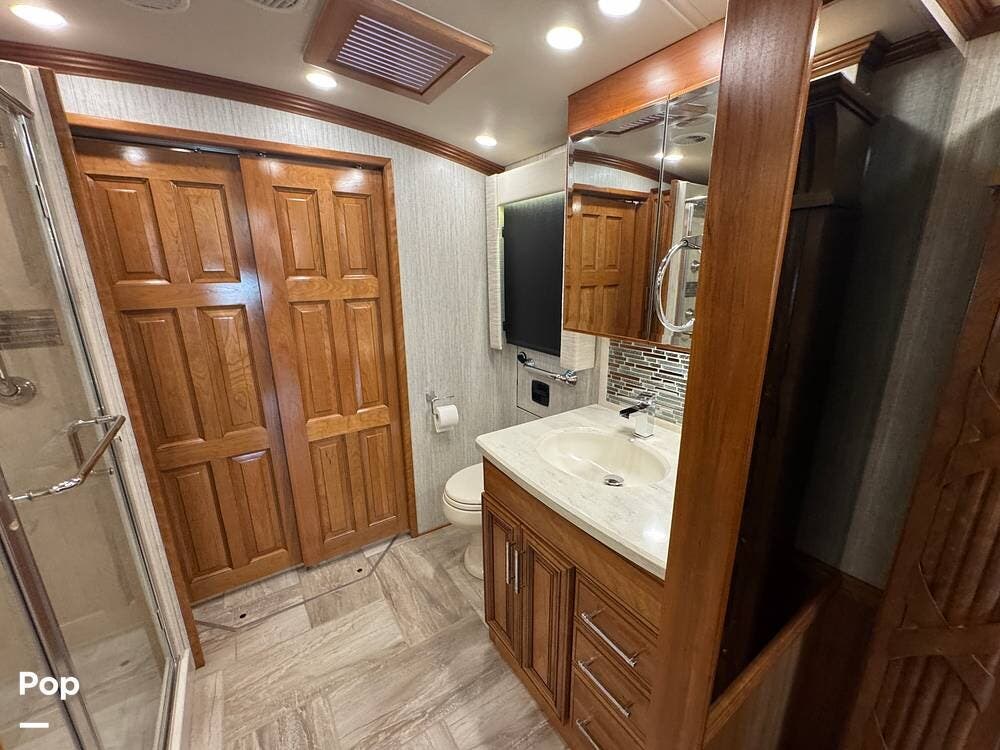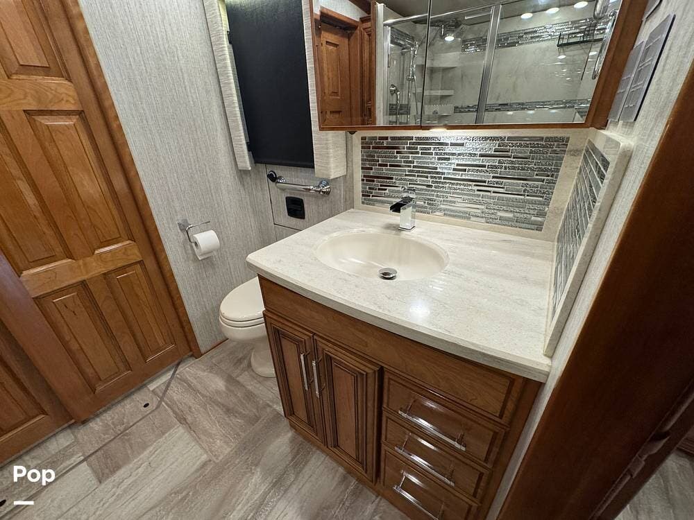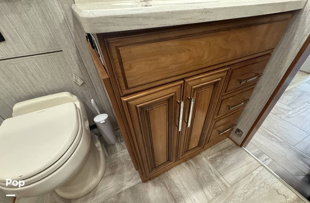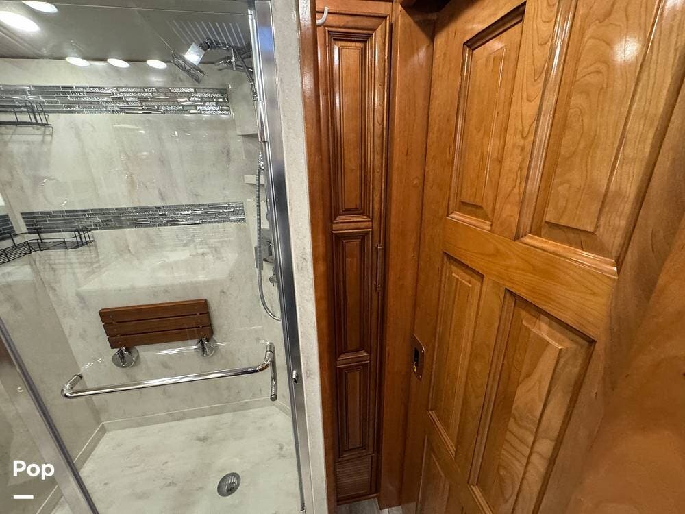 A key advantage of this floorplan is that, with all slides retracted, usable centerline access remains through the coach. The bathroom, refrigerator, and kitchen can be accessed while traveling without deploying slides. The mid-coach half bath provides ample space and includes a macerator toilet and vacuum inlet. The rear bath features a sink-and-a-half layout, substantial cabinetry, and one of the largest showers available in a Class A motorcoach. Both toilets are macerator-style and are monitored through digital tank level displays visible locally and through the SilverLeaf system. The Aquamizer function recirculates water internally until hot, minimizing water waste during dry camping.