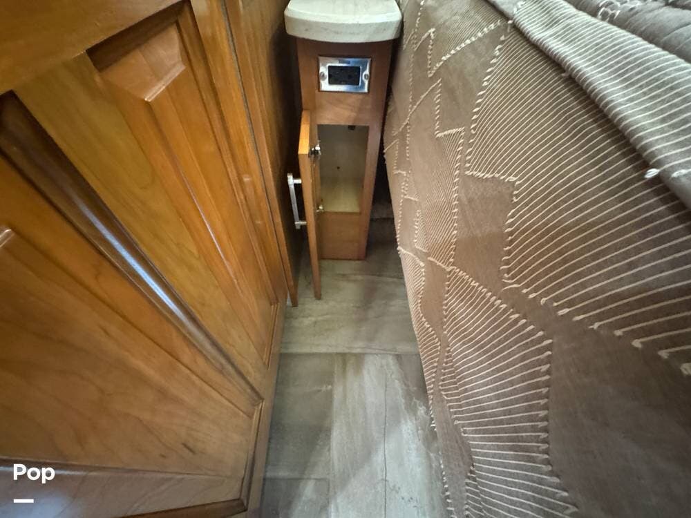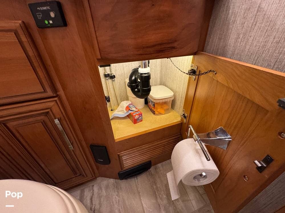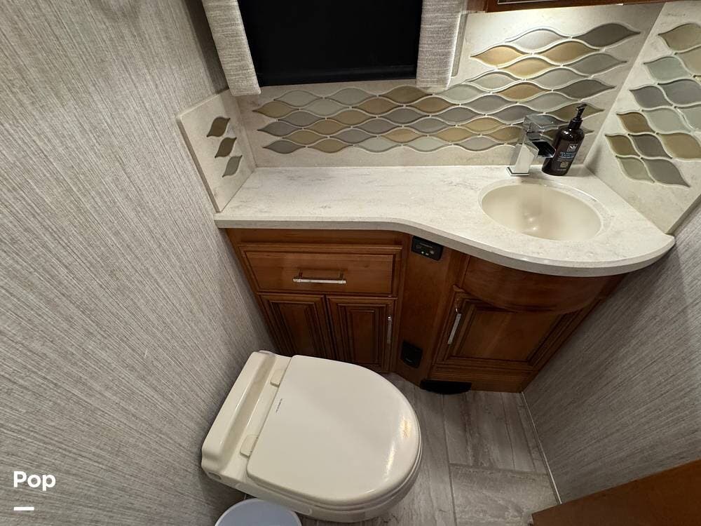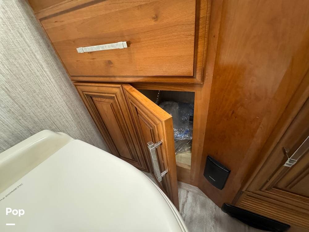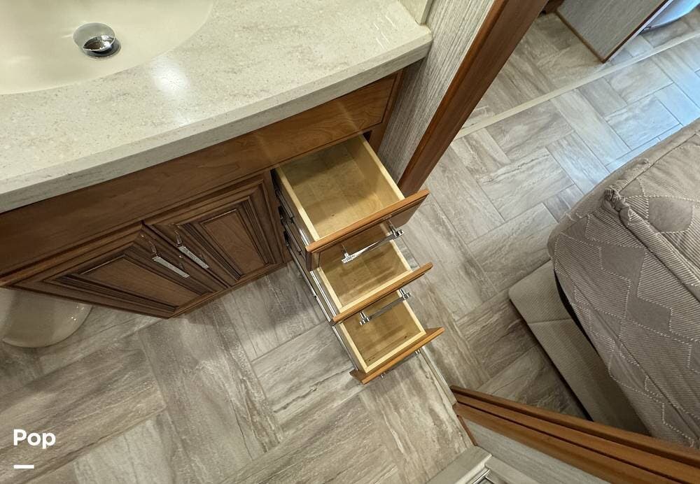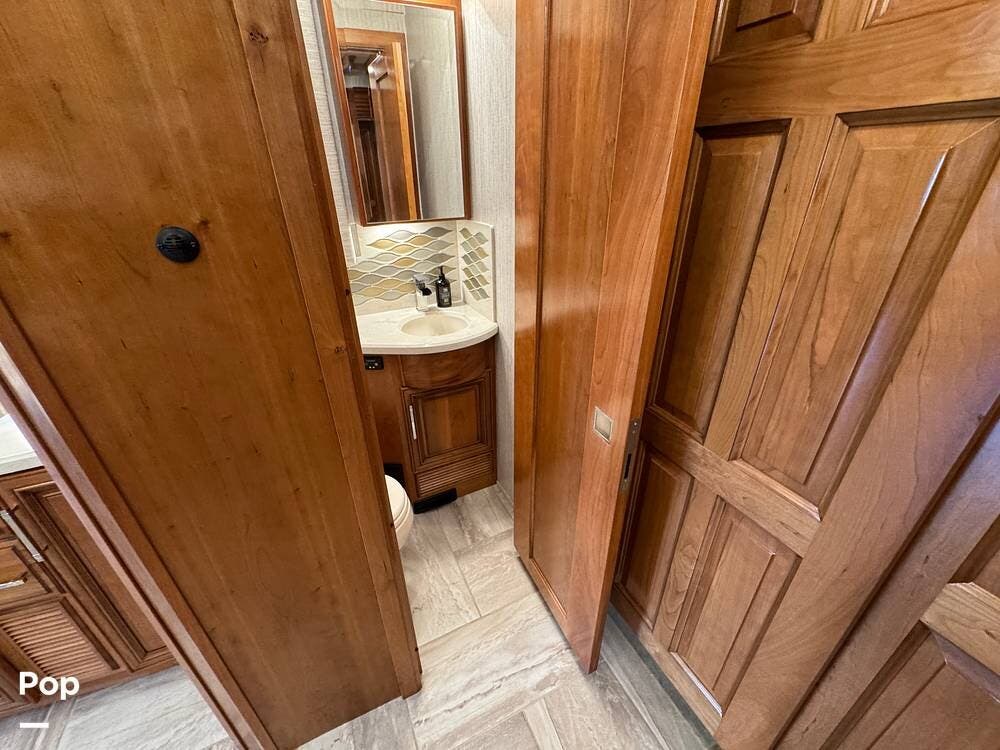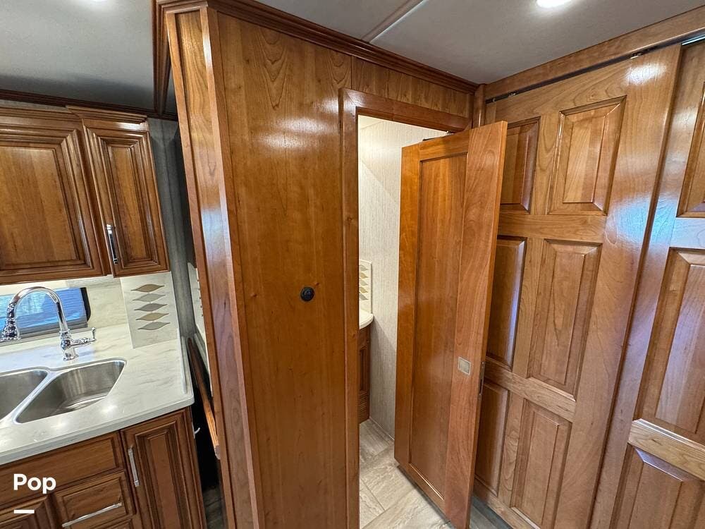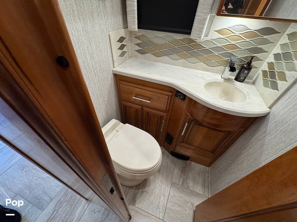 A key advantage of this floorplan is that, with all slides retracted, usable centerline access remains through the coach. The bathroom, refrigerator, and kitchen can be accessed while traveling without deploying slides. The mid-coach half bath provides ample space and includes a macerator toilet and vacuum inlet. The rear bath features a sink-and-a-half layout, substantial cabinetry, and one of the largest showers available in a Class A motorcoach. Both toilets are macerator-style and are monitored through digital tank level displays visible locally and through the SilverLeaf system. The Aquamizer function recirculates water internally until hot, minimizing water waste during dry camping.