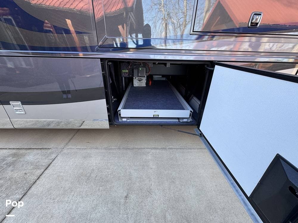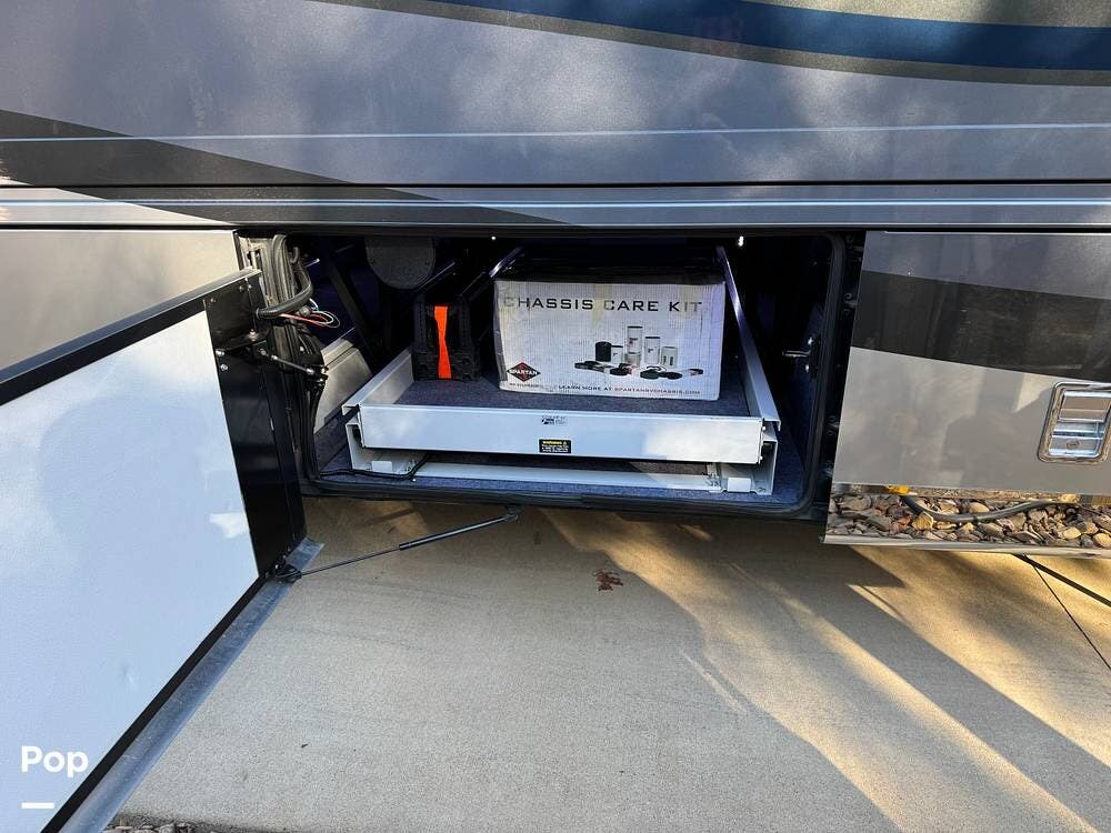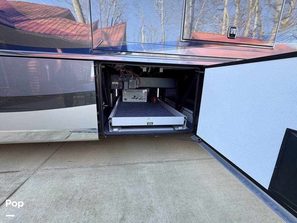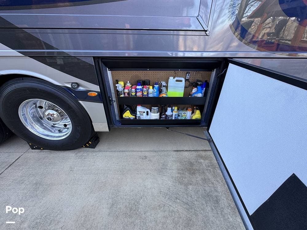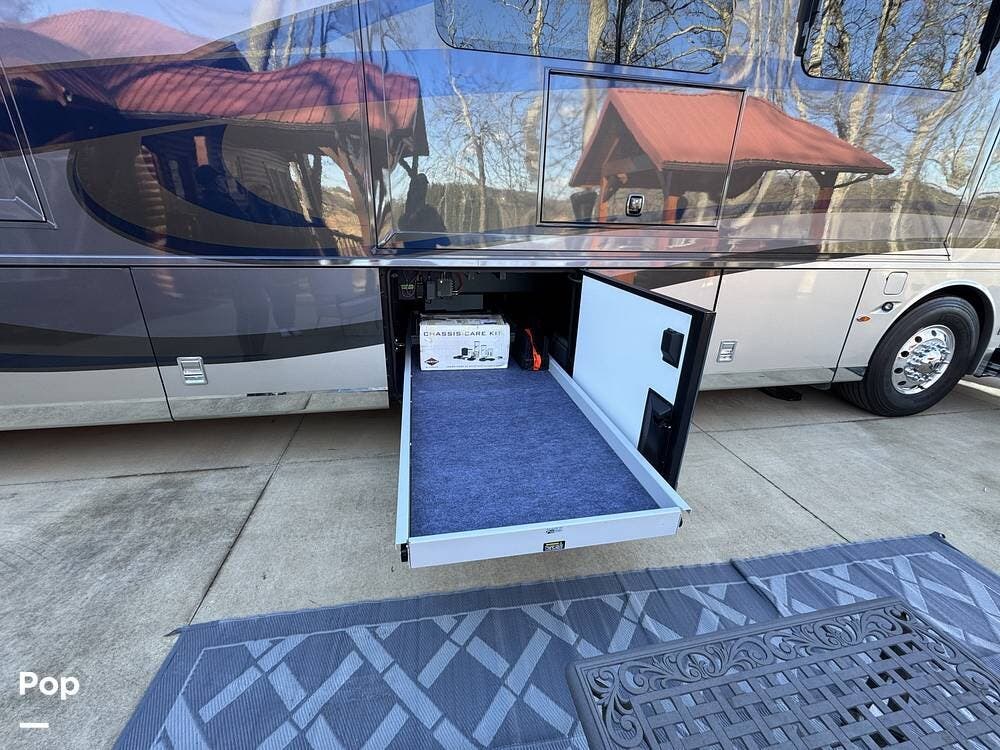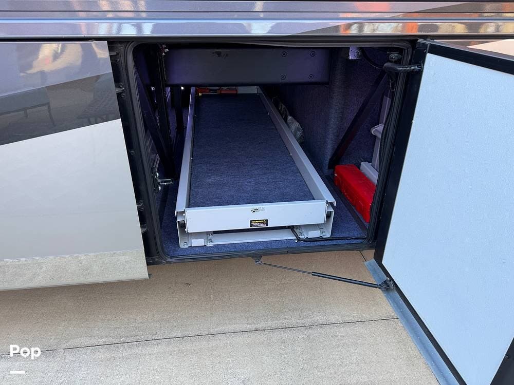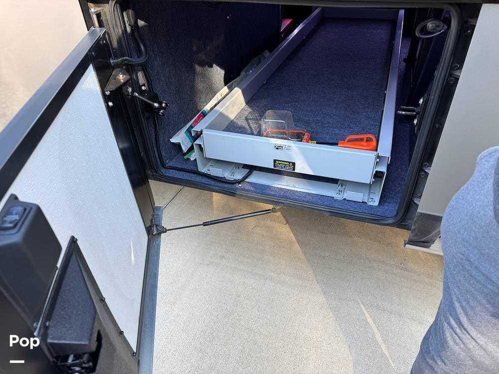 Basement storage is extensive and well-organized, featuring multiple power-sliding cargo trays, exterior power outlets, and clearly labeled service bays. Included equipment consists of a Blue Ox tow system and tire pressure monitoring on all wheels.