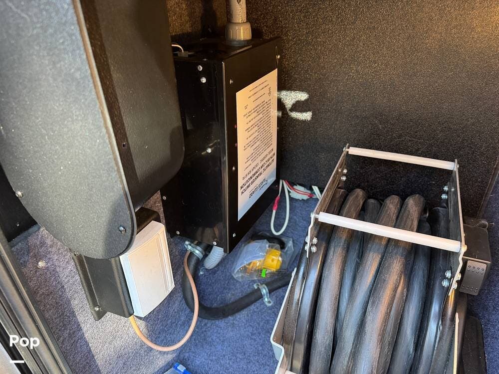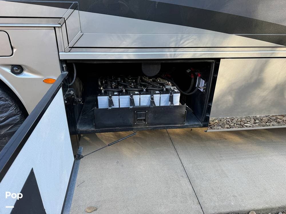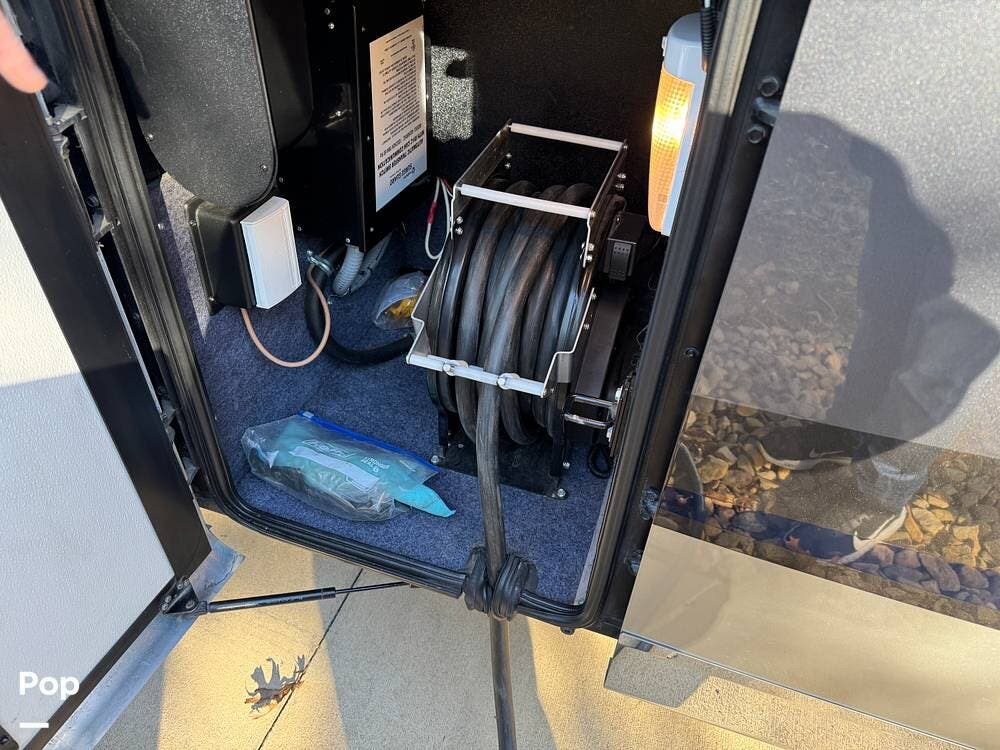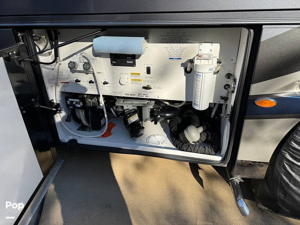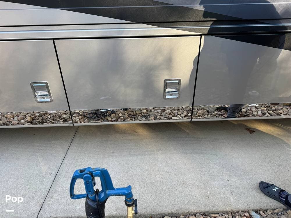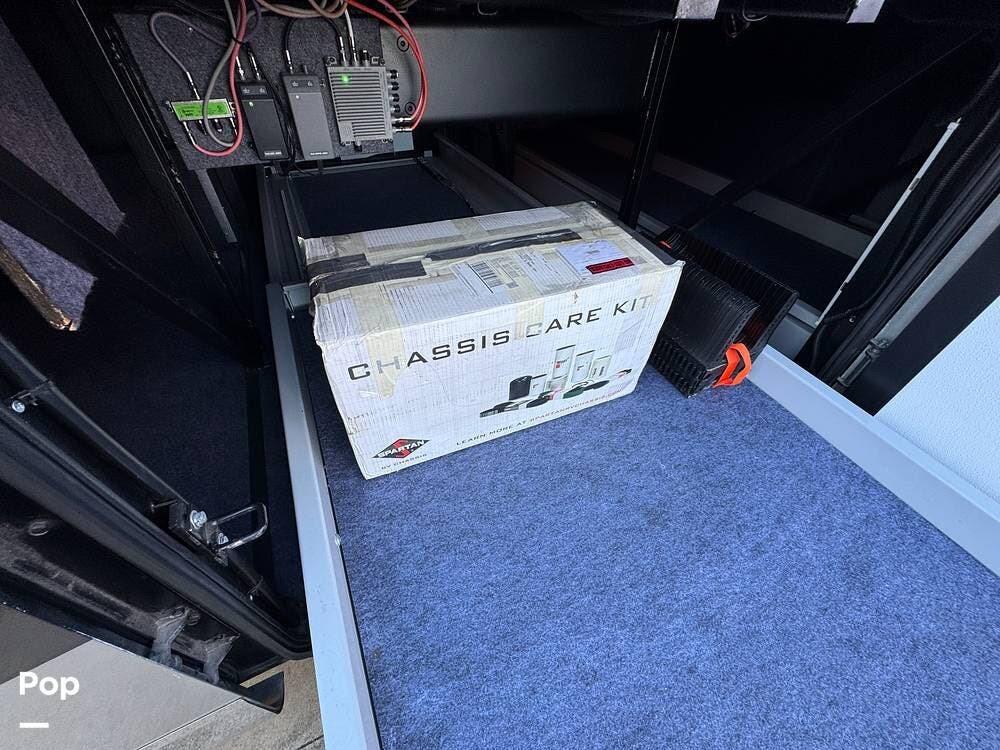 Basement storage is extensive and well-organized, featuring multiple power-sliding cargo trays, exterior power outlets, and clearly labeled service bays. Included equipment consists of a Blue Ox tow system and tire pressure monitoring on all wheels.