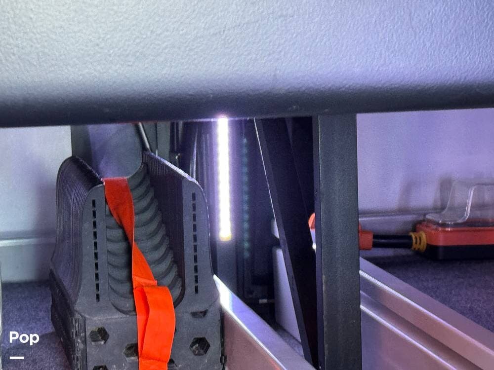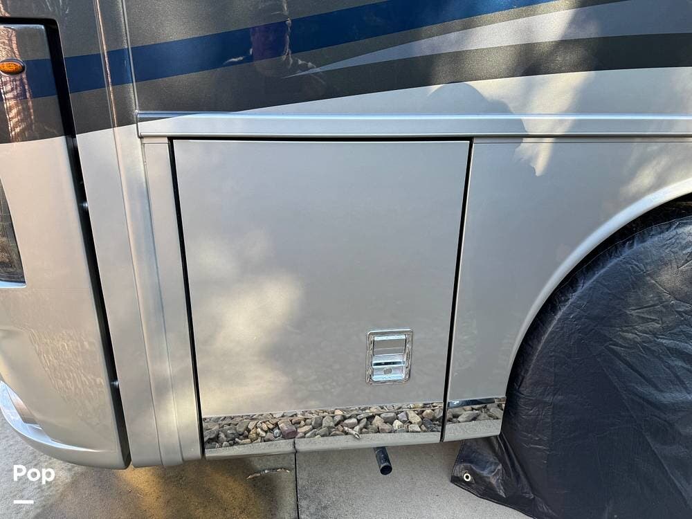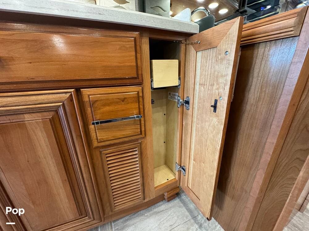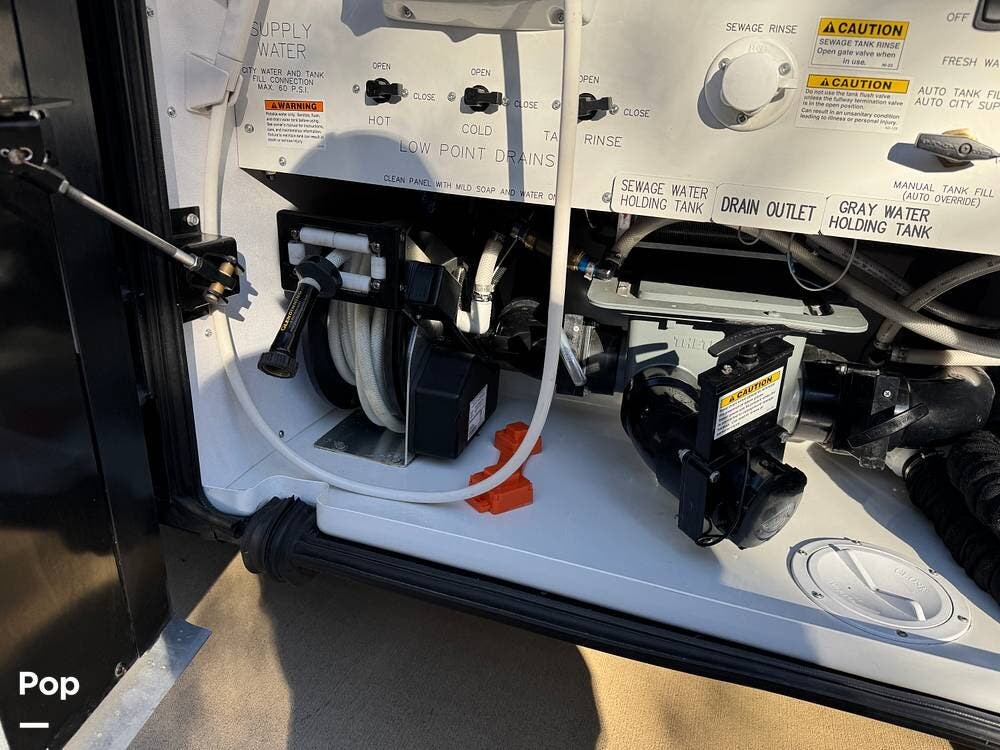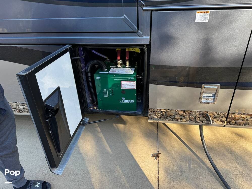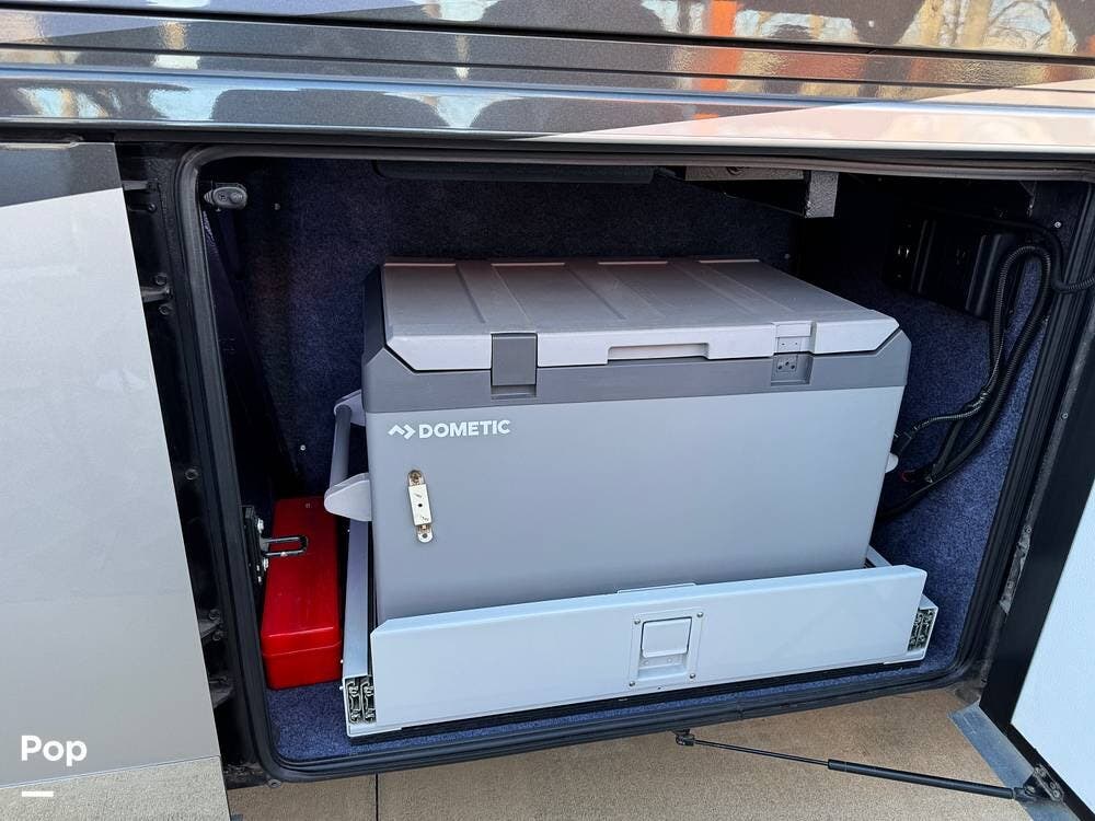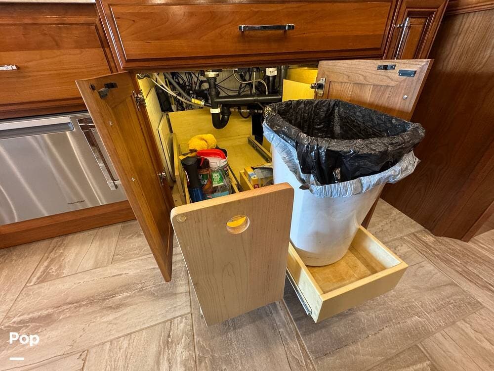 Basement storage is extensive and well-organized, featuring multiple power-sliding cargo trays, exterior power outlets, and clearly labeled service bays. Included equipment consists of a Blue Ox tow system and tire pressure monitoring on all wheels.