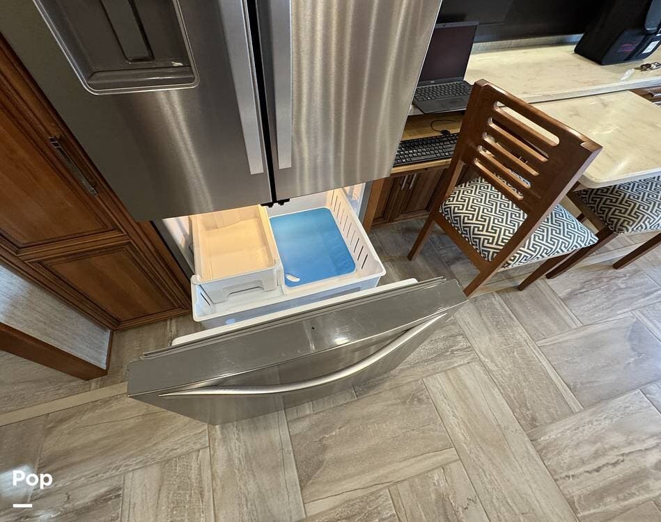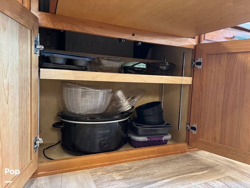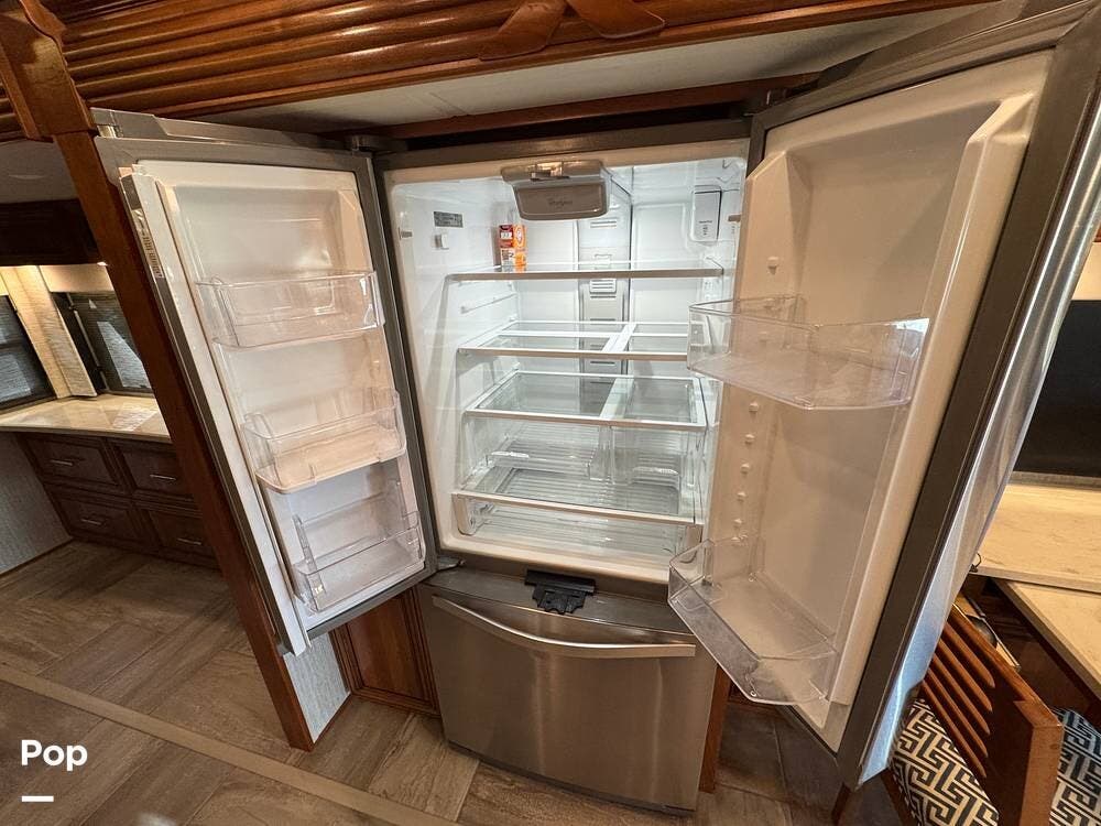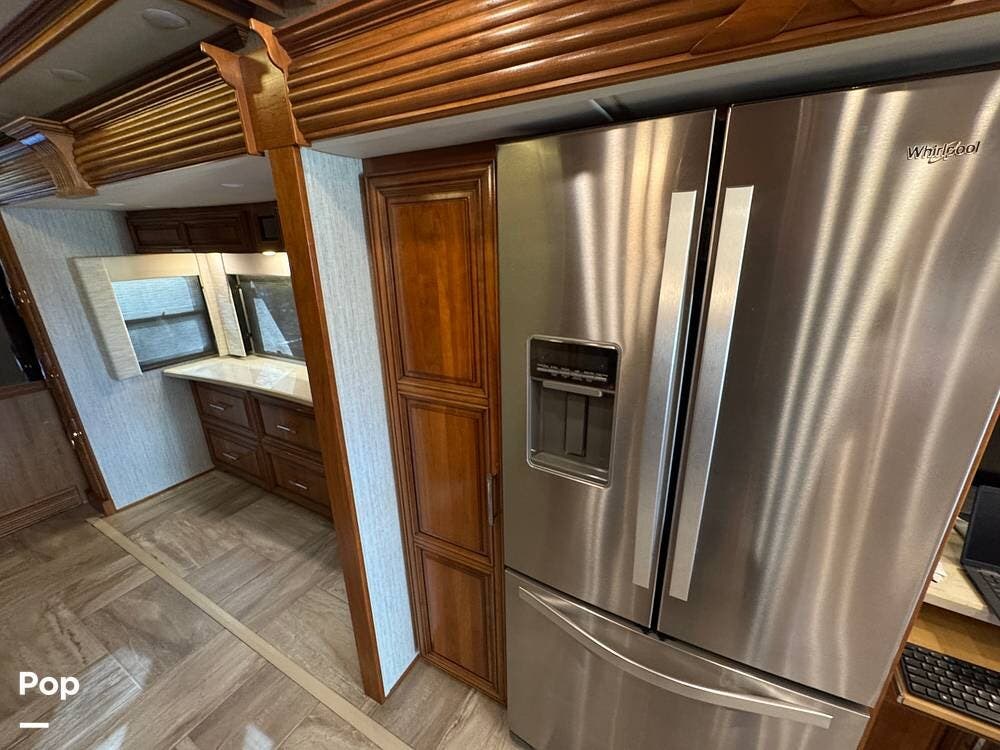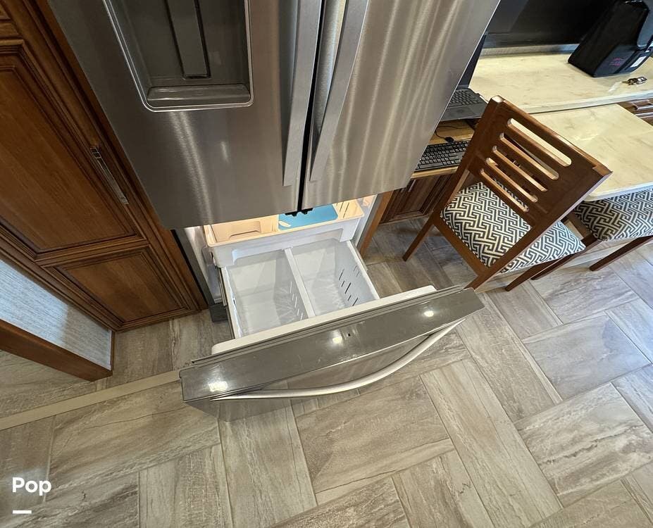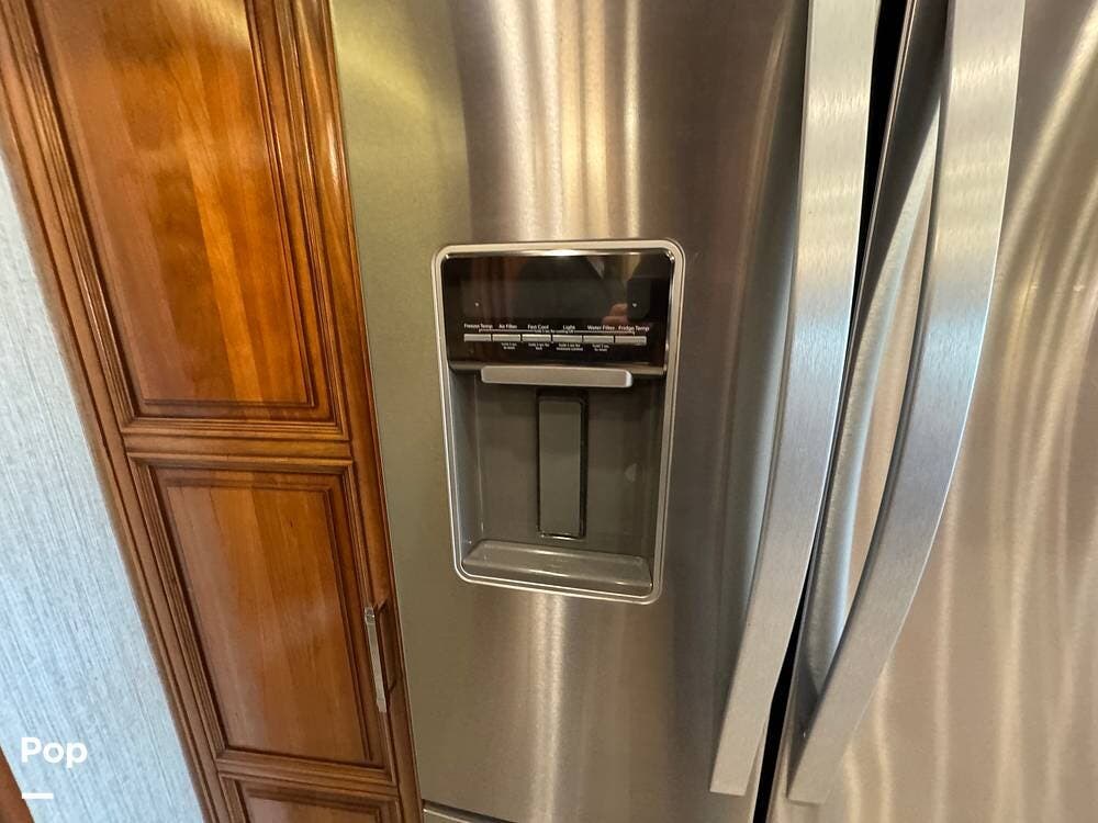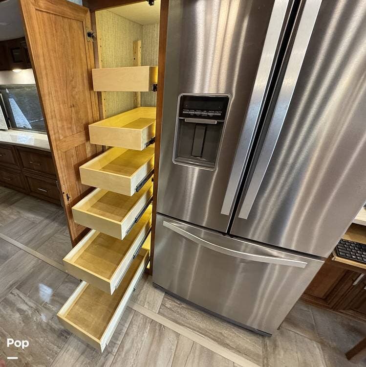 The kitchen is equipped with full-size residential appliances, including a household refrigerator that remains operational while driving. An additional refrigerator/freezer is located in the basement for expanded storage. A deep pantry with adjustable shelving allows flexible organization. A built-in triple water filtration system is installed, supplemented by a portable water softening system, and the refrigerator includes its own dedicated water filter.