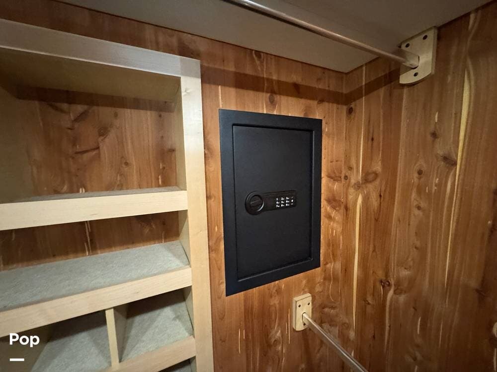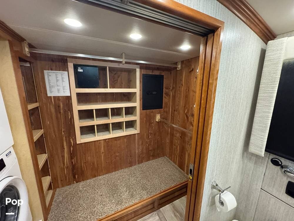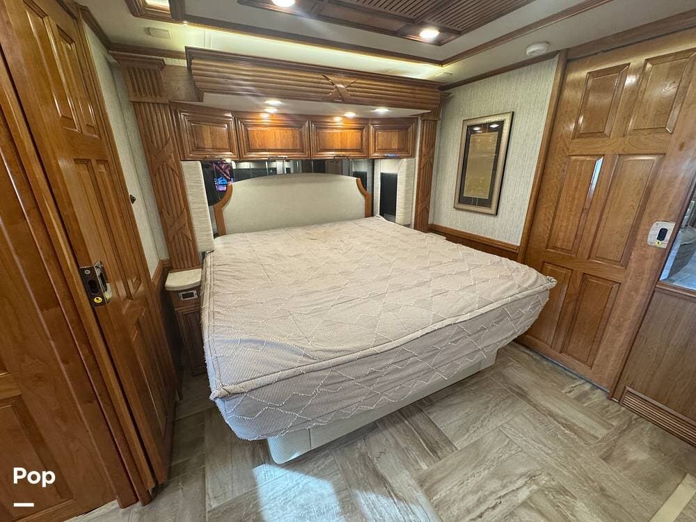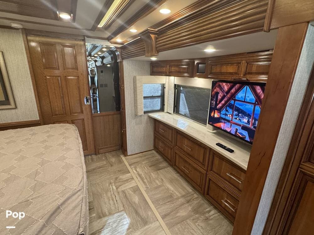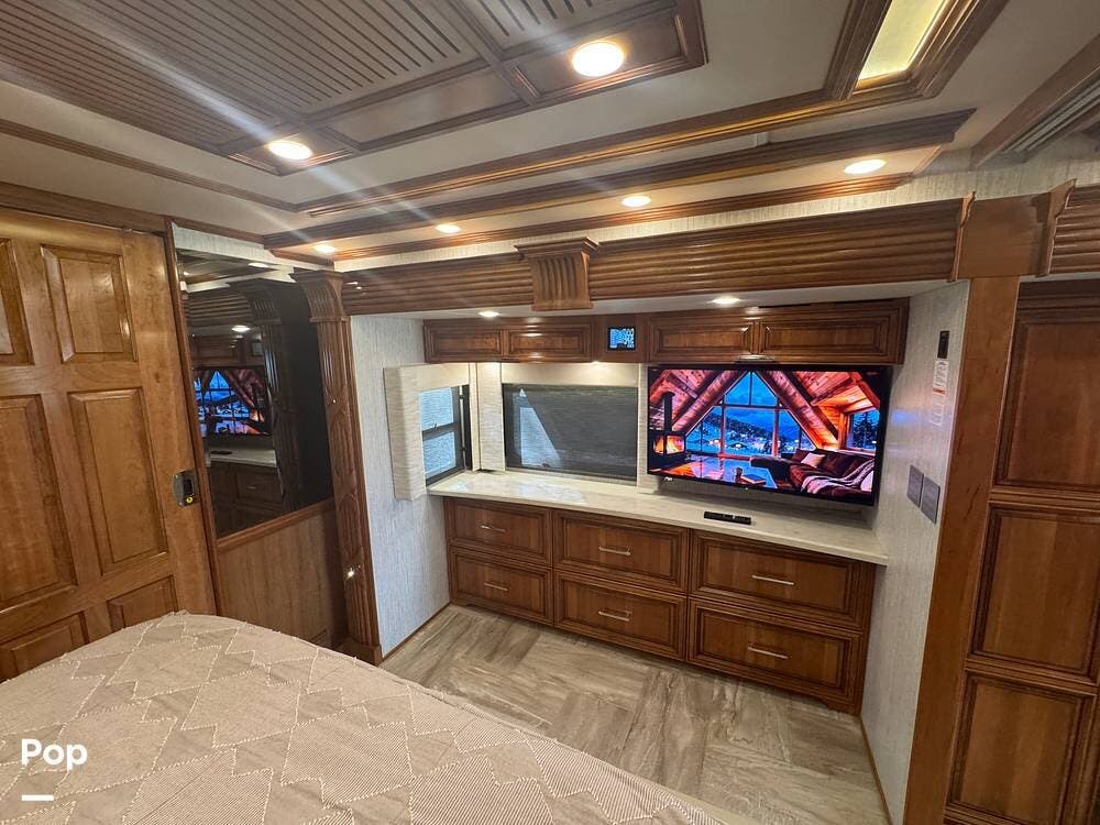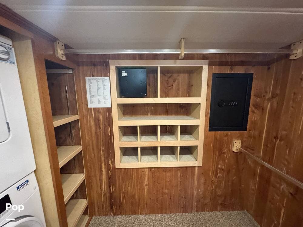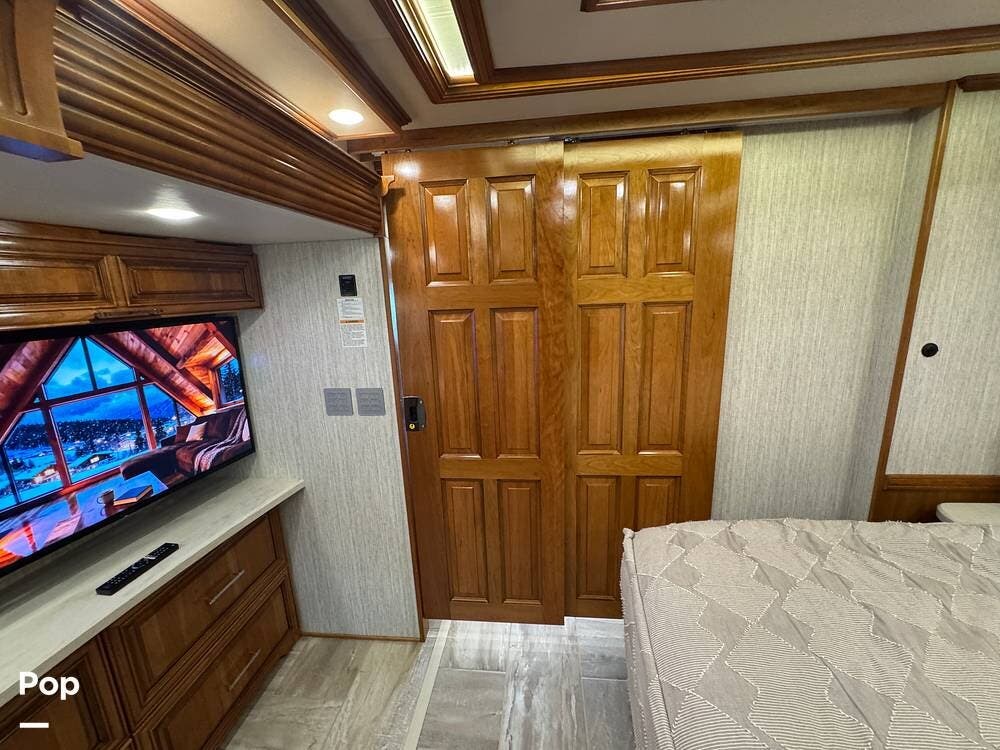 The master bedroom includes a king bed with under-bed storage, multiple lighting modes including courtesy floor lighting, and a third television with surround sound. Exterior security lighting can be activated from the bedroom. Solid wood doors fully separate the living area, bedroom, bathroom, and walk-in closet. The rear emergency exit is located in the master bath and also provides convenient access for loading luggage near the closet. The walk-in closet offers extensive hanging and shelf storage, built-in shoe racks, a Whirlpool washer and dryer, and a built-in safe with restored access and multiple keys included.