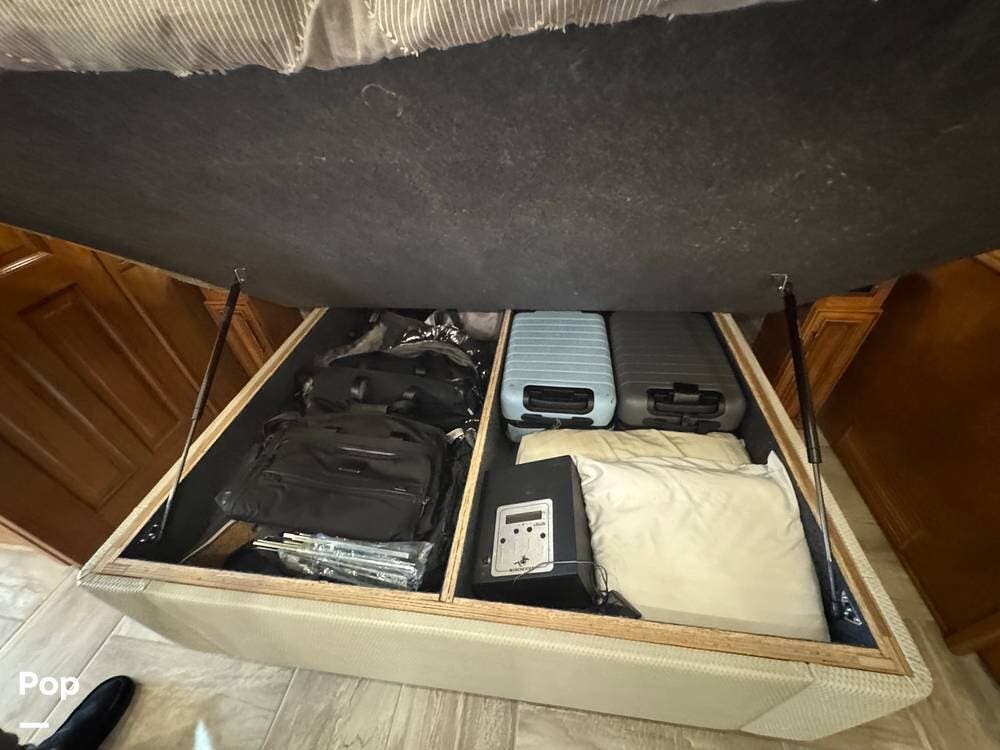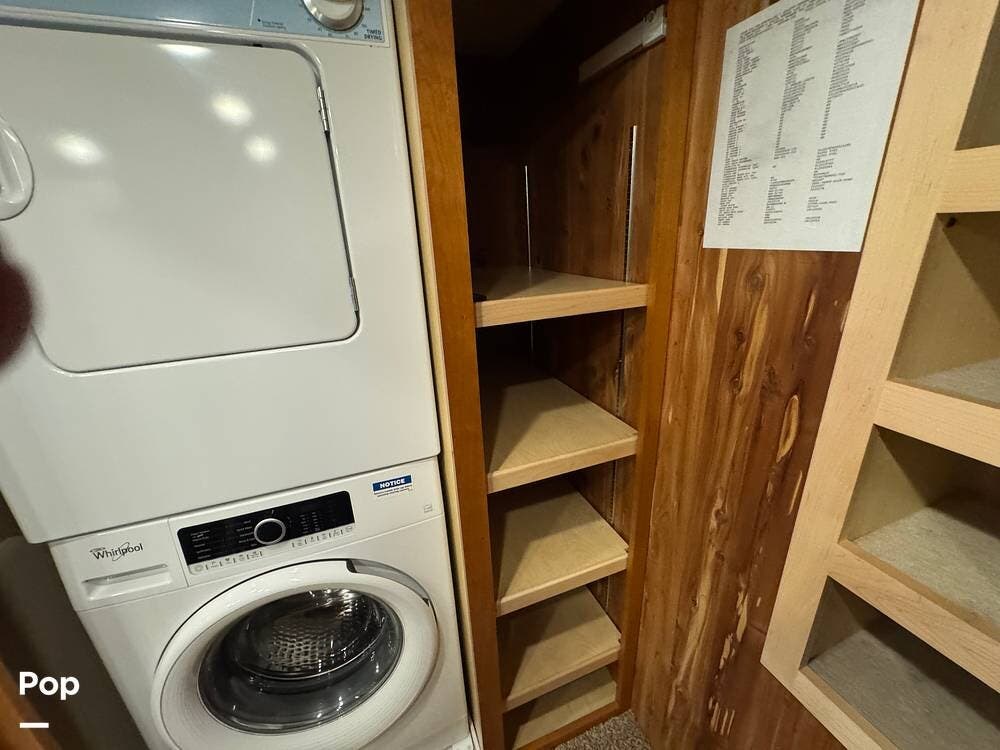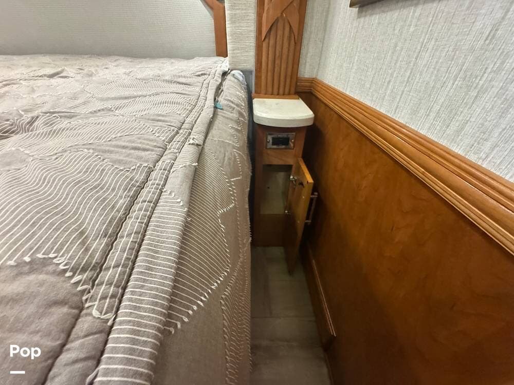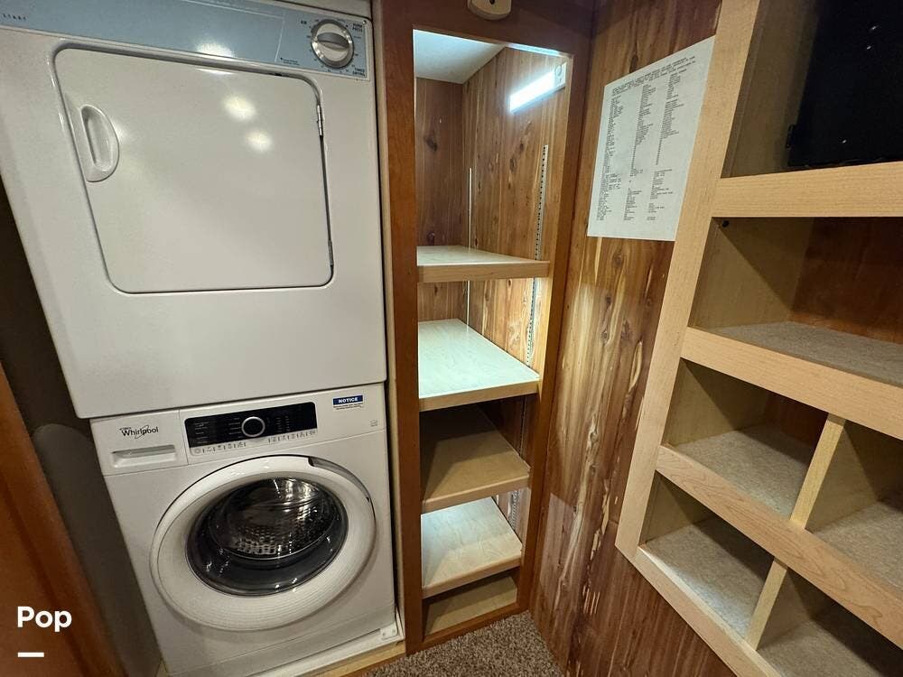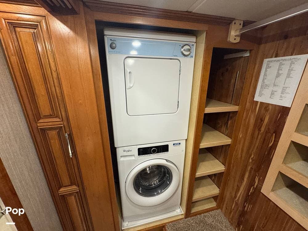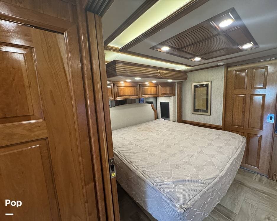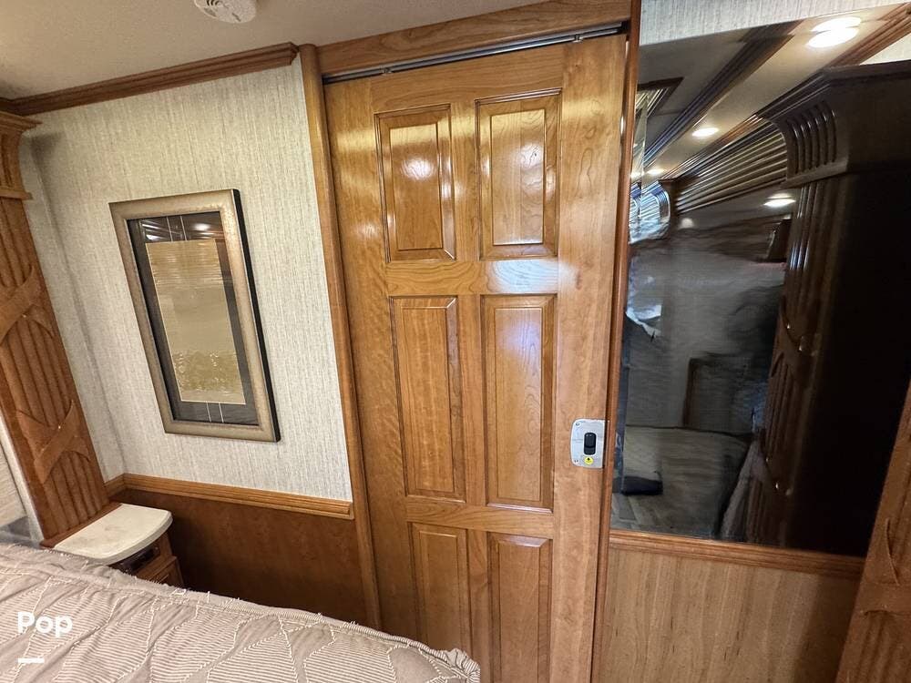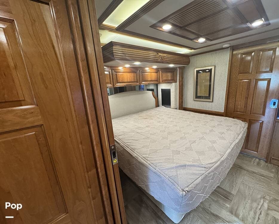 The master bedroom includes a king bed with under-bed storage, multiple lighting modes including courtesy floor lighting, and a third television with surround sound. Exterior security lighting can be activated from the bedroom. Solid wood doors fully separate the living area, bedroom, bathroom, and walk-in closet. The rear emergency exit is located in the master bath and also provides convenient access for loading luggage near the closet. The walk-in closet offers extensive hanging and shelf storage, built-in shoe racks, a Whirlpool washer and dryer, and a built-in safe with restored access and multiple keys included.