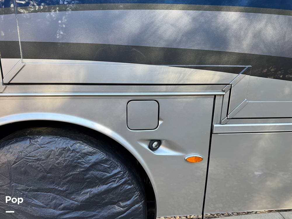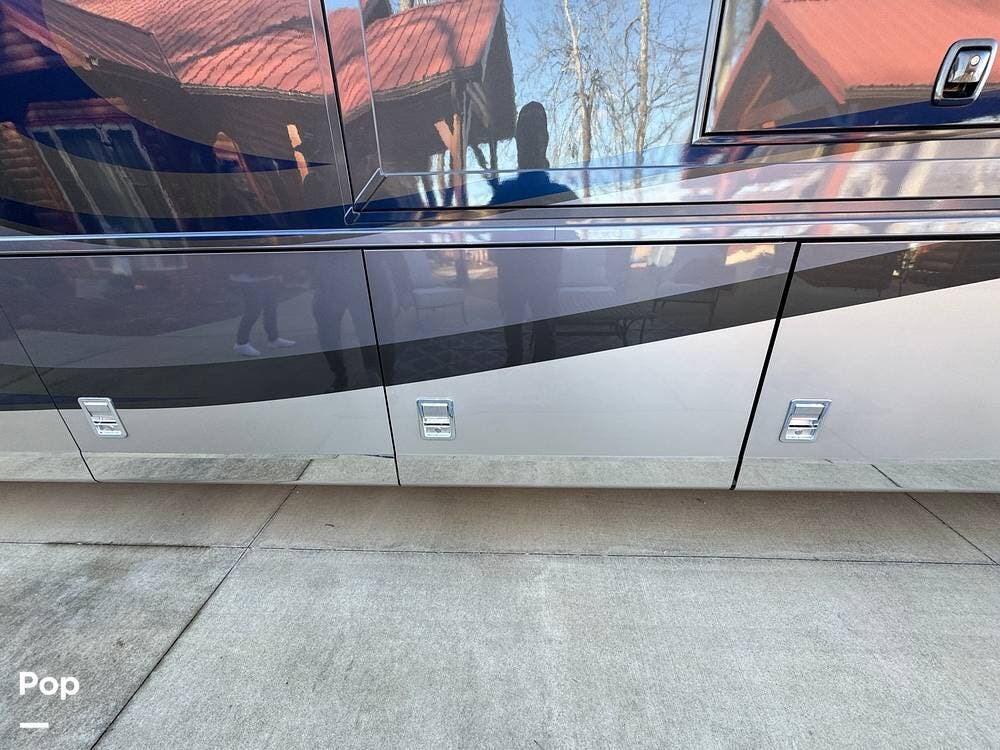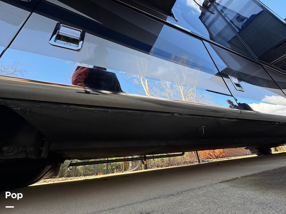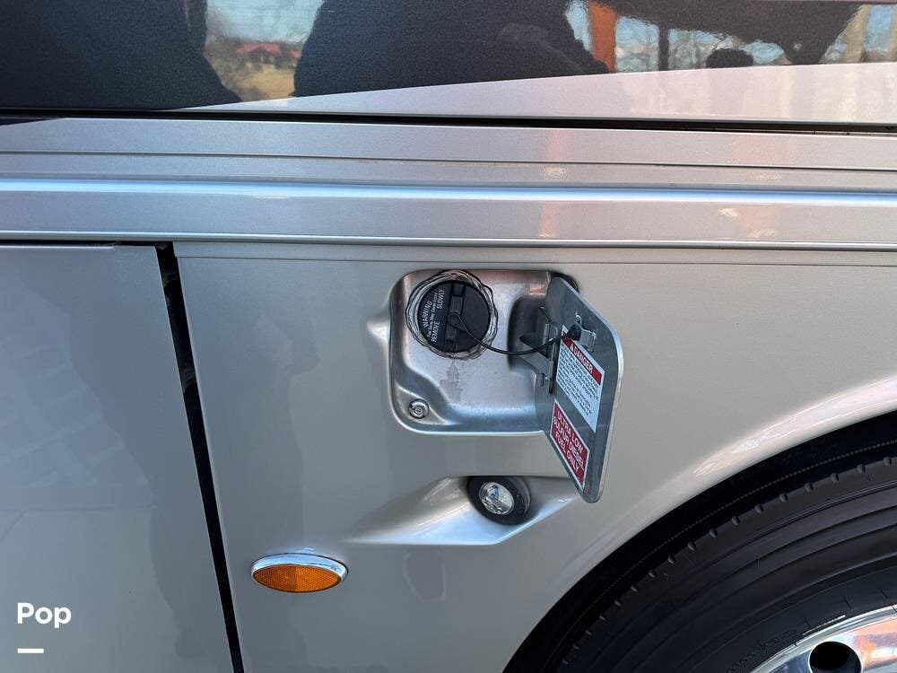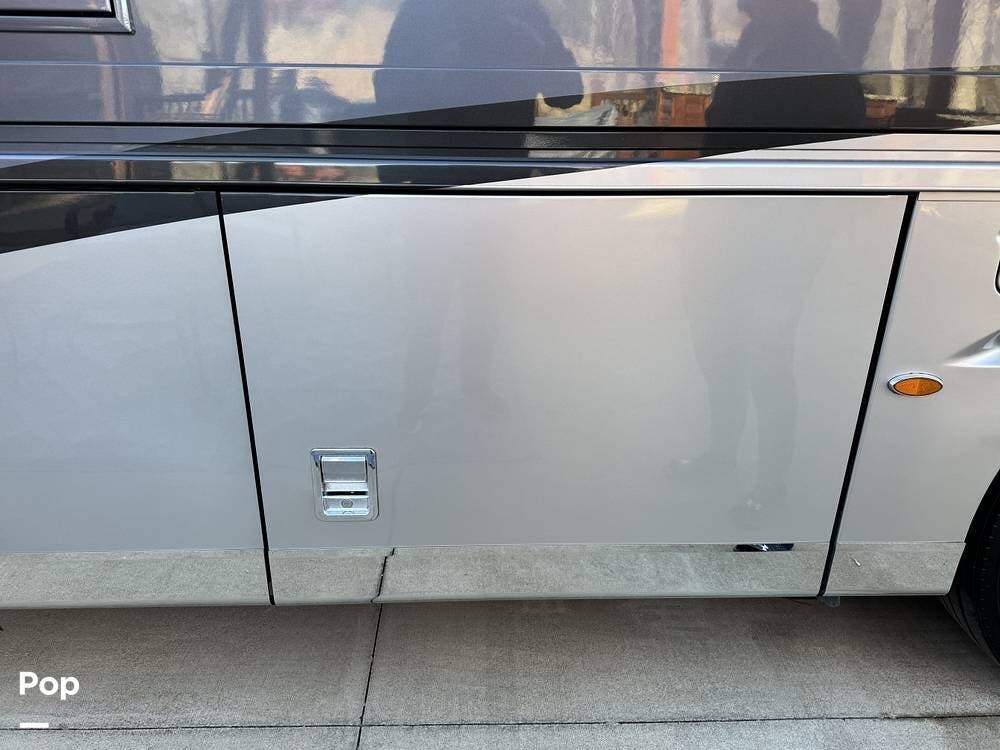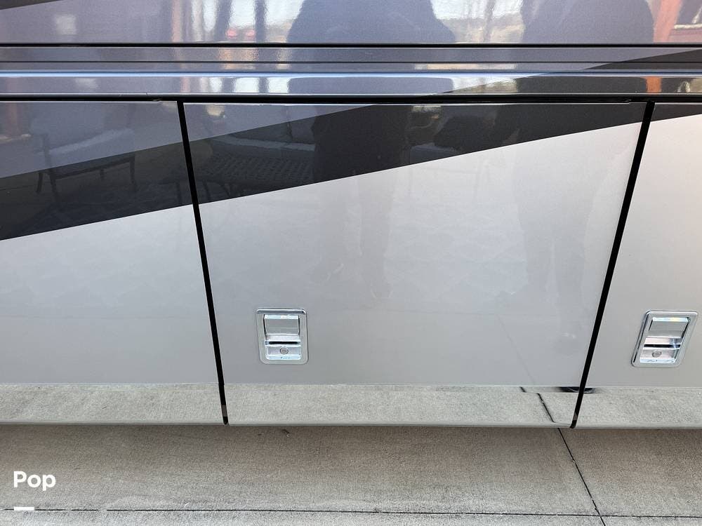 The air-ride system includes onboard air access ports at the front and rear for inflating tires or accessories. Fueling access is available from both sides of the coach. The roofline is fully enclosed, concealing rooftop equipment for a clean and streamlined profile.