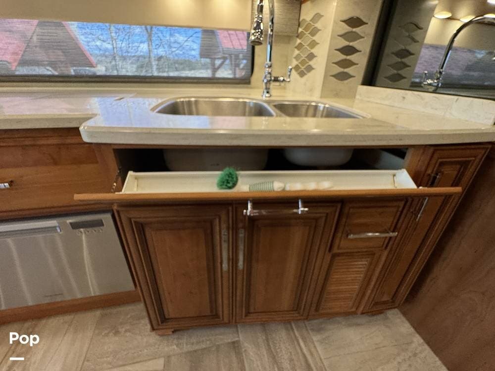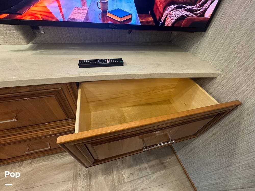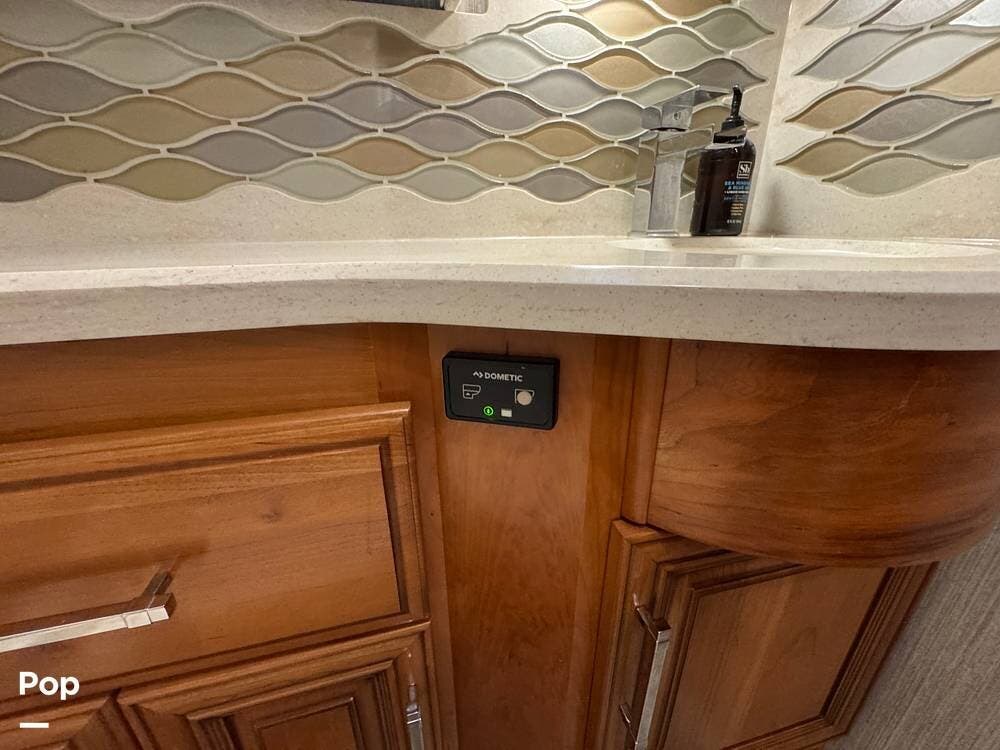 Heated tile flooring extends throughout the coach, including the living area, bedroom, and bathroom, with independent zone control. Both bathroom roof vents are equipped with rain-sensing technology and automatically close when moisture is detected.