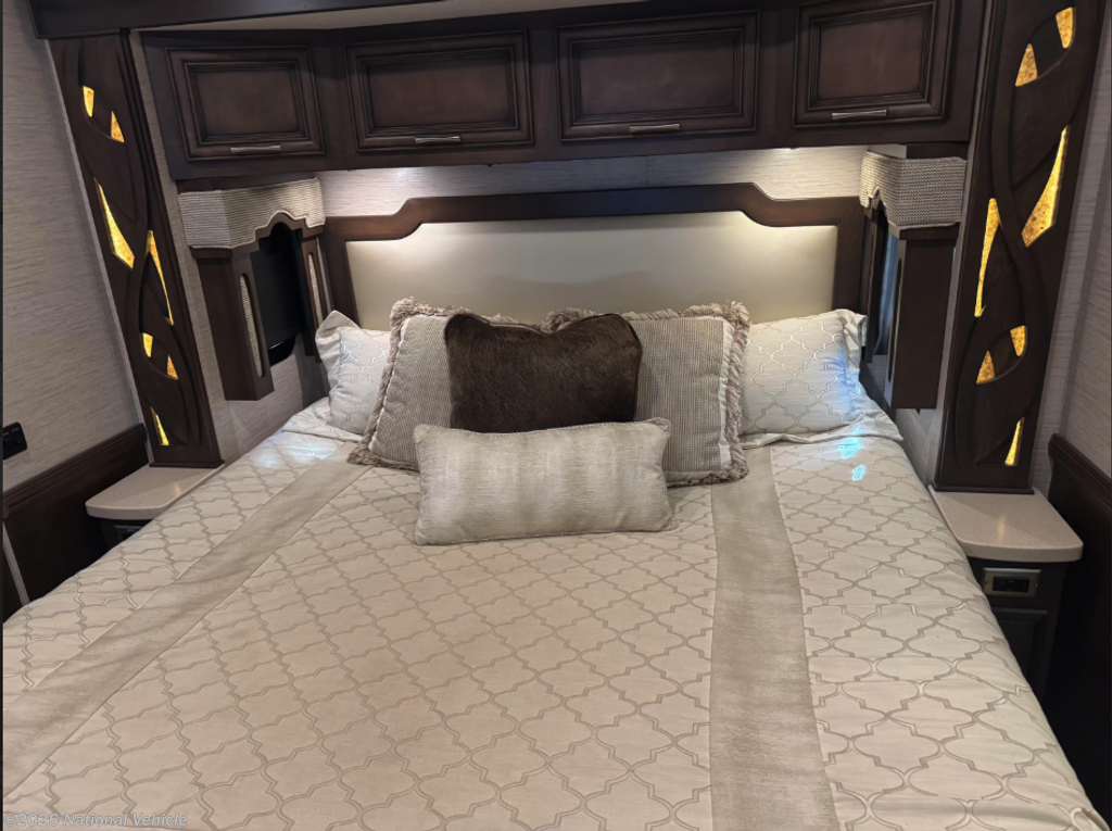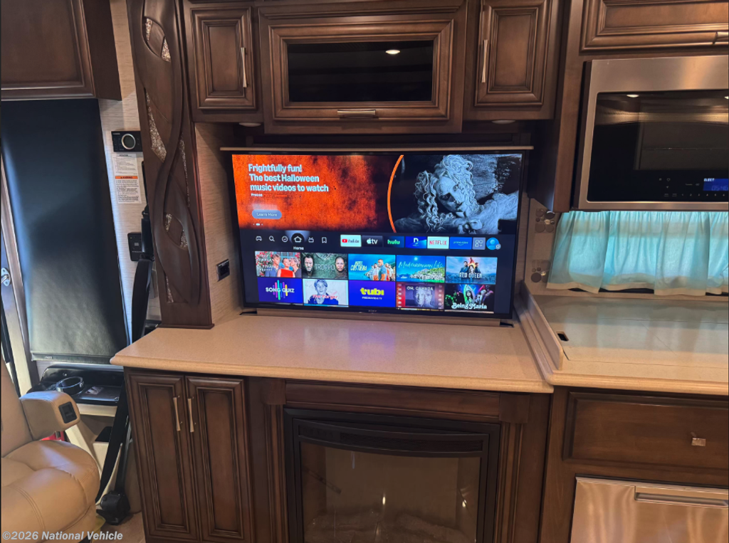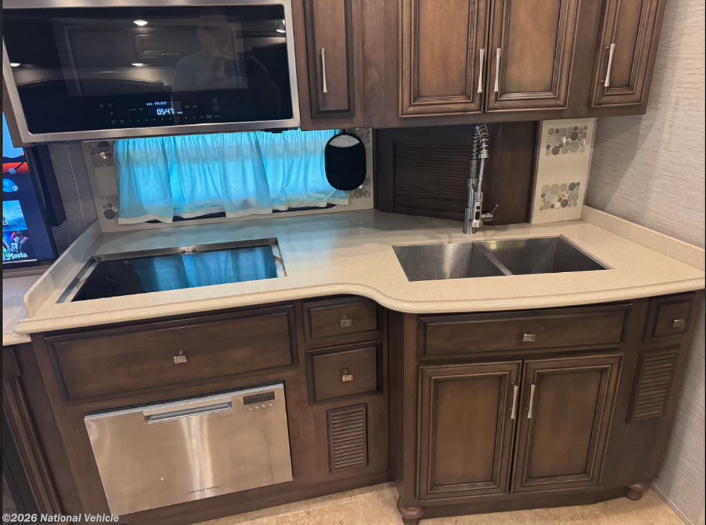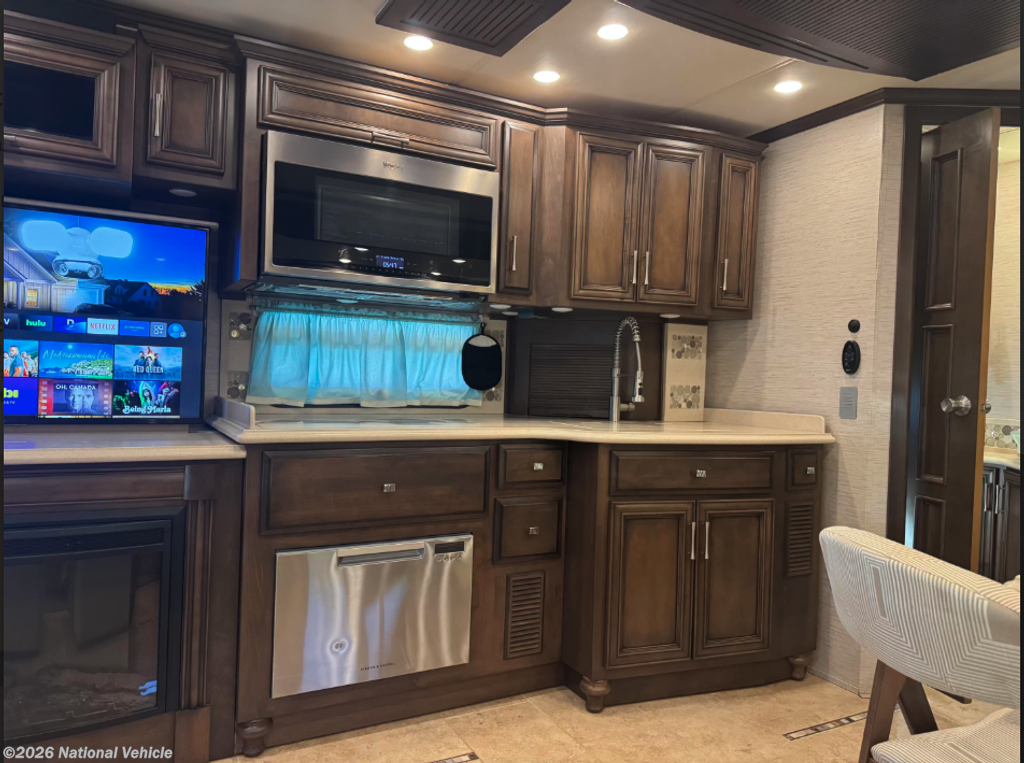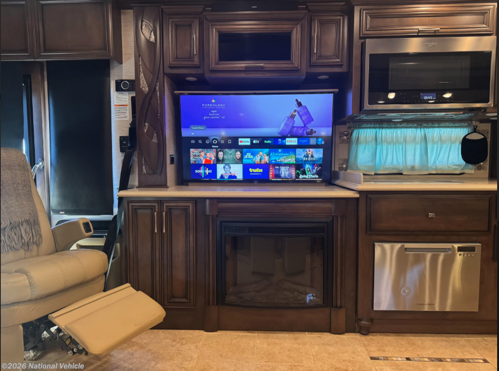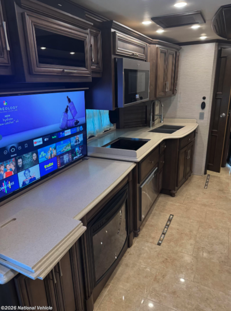 This all-electric coach and thoughtfully equipped for extended travel or full-time living. Step inside to a beautifully appointed interior featuring solid-surface countertops, rich hardwood cabinetry, residential-style lighting, and tile flooring throughout.