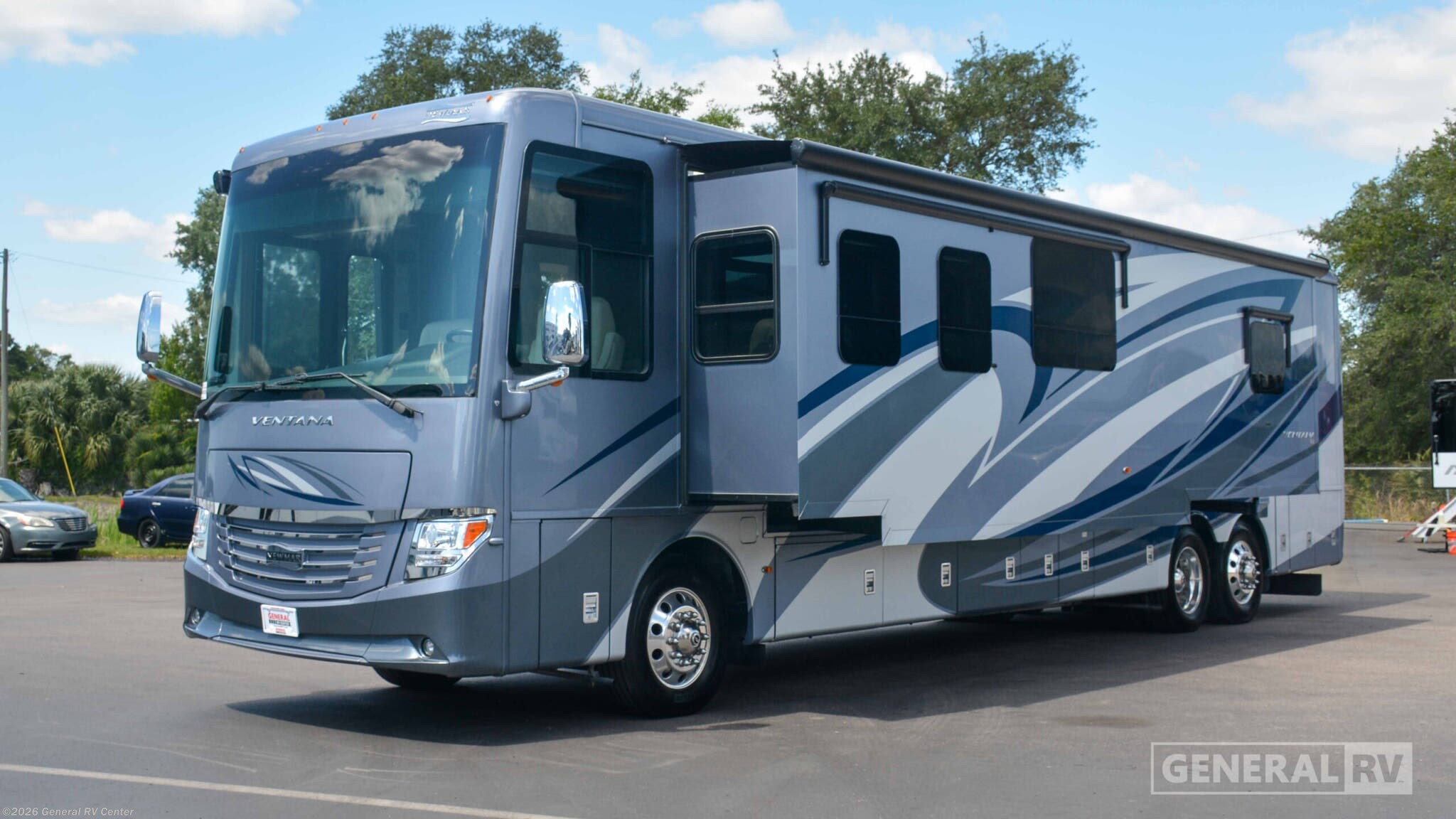 **2019 Newmar Ventana Class A Diesel Motorhome 4369 highlights:** - Bath and a Half - Tag Axle - King Bed Suite - Washer and Dryer - Residential Kitchen The 2019 Newmar Ventana 4369 is a luxury diesel pusher designed for extended travel and full-time comfort, blending residential amenities with Newmar’s renowned build quality. The spacious bath-and-a-half floorplan offers excellent separation between living and sleeping areas, while the rear private bedroom features a king bed, large wardrobes, and direct access to the full bath. Multiple slide outs expand the living space, creating an open and inviting interior with ample room to relax or entertain. Built on a Freightliner chassis with tag axle stability, the Ventana delivers a smooth and confident ride paired with powerful diesel performance. Inside, the gourmet kitchen includes solid-surface countertops, ample cabinetry, and a residential refrigerator, making meal prep effortless on the road. Comfort is enhanced with hydronic heating, multiple roof air conditioners, and a stacked washer and dryer for true residential convenience. With refined interior finishes, generous storage throughout, and premium construction, the Ventana 4369 is perfectly suited for travelers who demand luxury, capability, and long-term livability in a Class A motorhome.