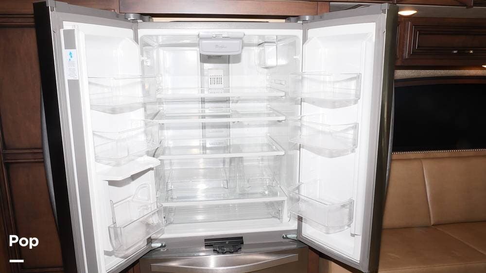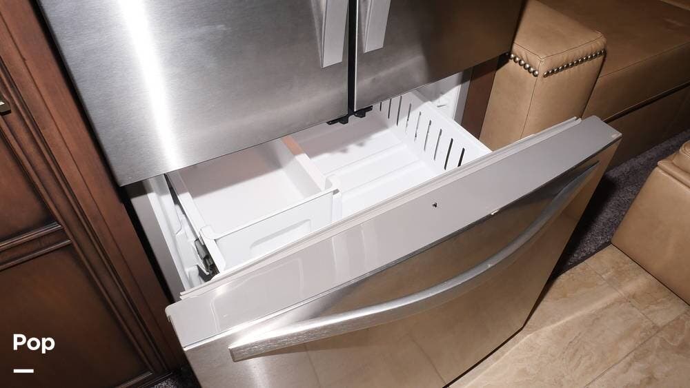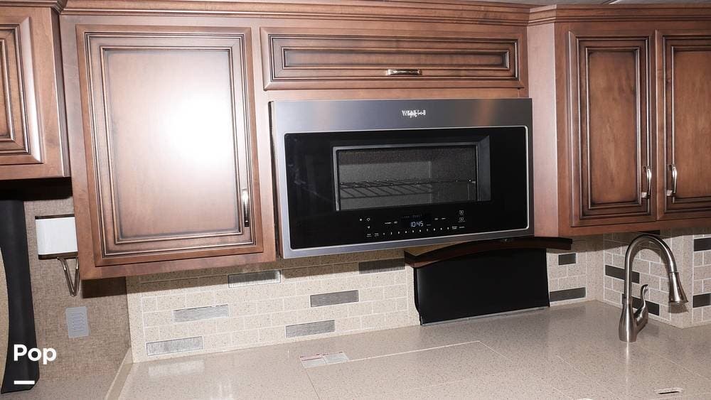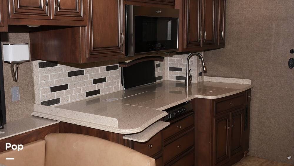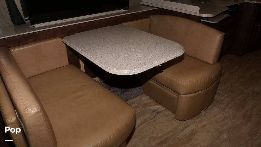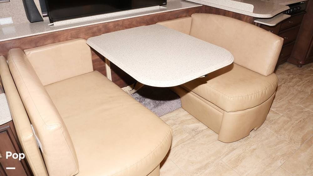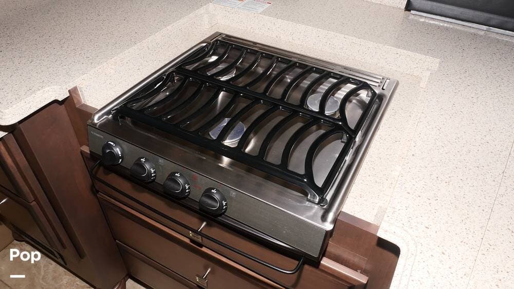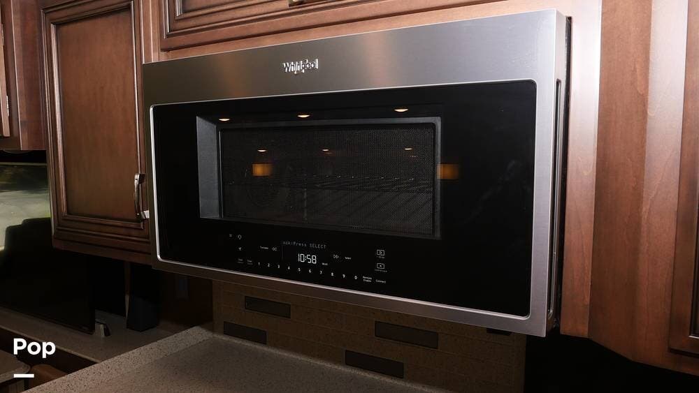 In the kitchen, a residential stainless steel refrigerator, three-burner cooktop, solid-surface countertops, and convection microwave let you prepare meals with ease, while the booth dinette doubles as a dining and workspace.