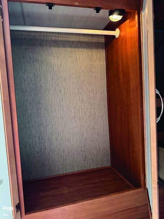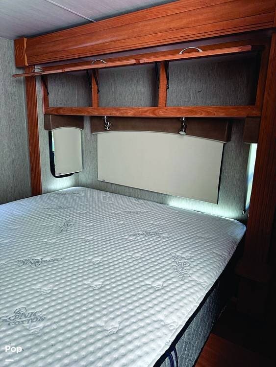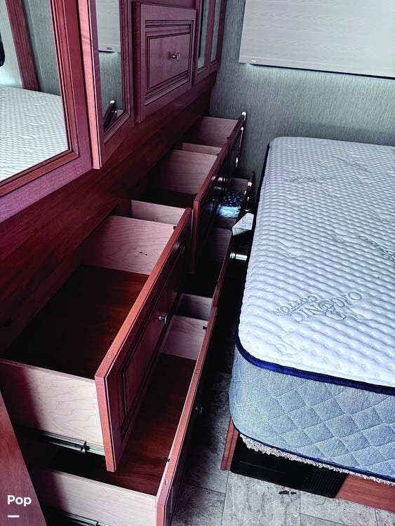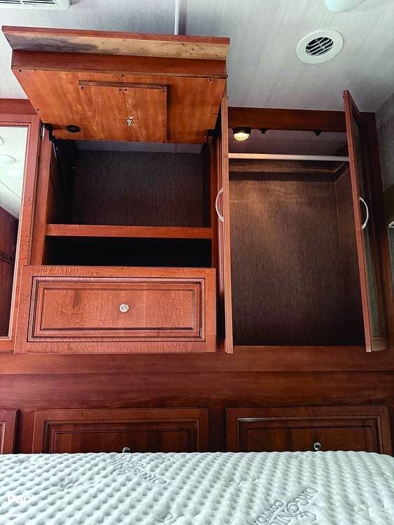 The Master Bedroom features a walk-around RV KING bed (an upgrade) with a new Wilderness Montana mattress. Across is a large wardrobe closet with dresser storage. Relax and enjoy the flat screen TV.
