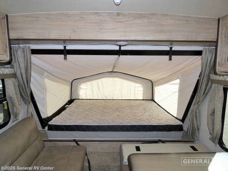 2019 Palomino 163X travel trailer highlights: Expandable Queen Beds U-Shaped Dinette Slide-Out Full Kitchen Lightweight Design Sleeps Up to Seven Whether you're planning a weekend getaway or an extended road trip, this hybrid travel trailer offers the perfect mix of comfort and versatility. With expandable queen beds at both ends, you get the open feel of tent camping with the protection and convenience of solid walls. Inside, the large U-shaped dinette sits on a slide-out to maximize your living space. It’s perfect for meals, game nights, or relaxing indoors—and it also converts into an additional sleeping area for guests or kids. The full kitchen includes a three-burner cooktop, oven, microwave, and a double-door refrigerator, making it easy to prepare your favorite meals on the go. There’s plenty of cabinet space to keep all your kitchen essentials organized. The full rear bathroom offers a corner shower, toilet, and vanity, so you can skip the campground bathhouse. With ducted A/C, a propane furnace, and a power awning with LED lighting, you’ll stay comfortable no matter the weather.