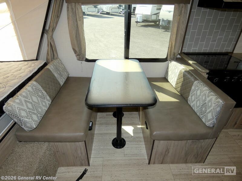 2019 Palomino 163X travel trailer highlights: Expandable Queen Beds U-Shaped Dinette Slide-Out Full Kitchen Lightweight Design Sleeps Up to Seven Whether you're planning a weekend getaway or an extended road trip, this hybrid travel trailer offers the perfect mix of comfort and versatility. With expandable queen beds at both ends, you get the open feel of tent camping with the protection and convenience of solid walls. Inside, the large U-shaped dinette sits on a slide-out to maximize your living space. It’s perfect for meals, game nights, or relaxing indoors—and it also converts into an additional sleeping area for guests or kids. The full kitchen includes a three-burner cooktop, oven, microwave, and a double-door refrigerator, making it easy to prepare your favorite meals on the go. There’s plenty of cabinet space to keep all your kitchen essentials organized. The full rear bathroom offers a corner shower, toilet, and vanity, so you can skip the campground bathhouse. With ducted A/C, a propane furnace, and a power awning with LED lighting, you’ll stay comfortable no matter the weather.
