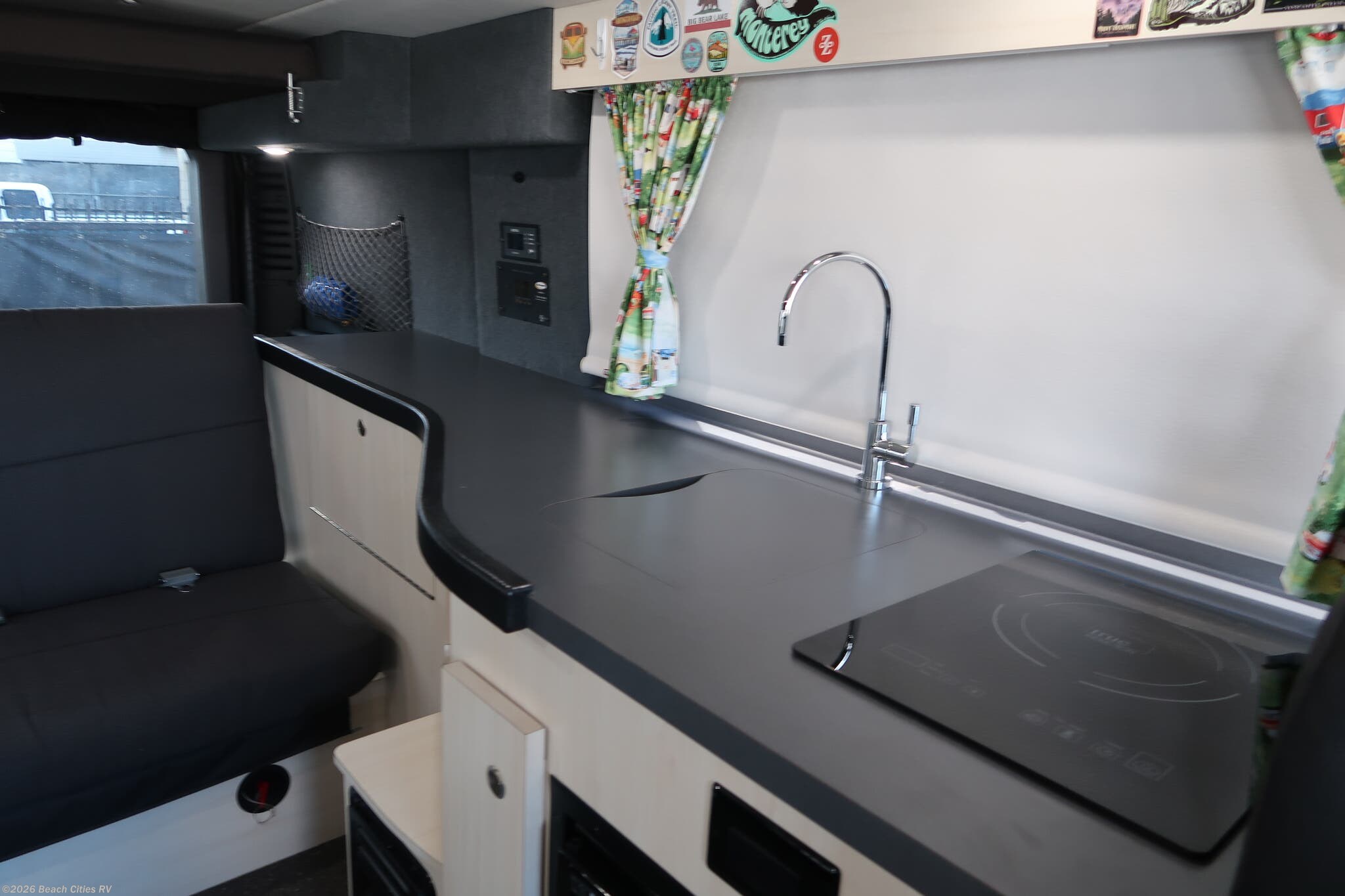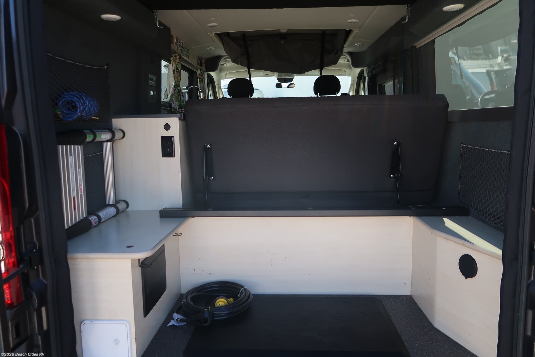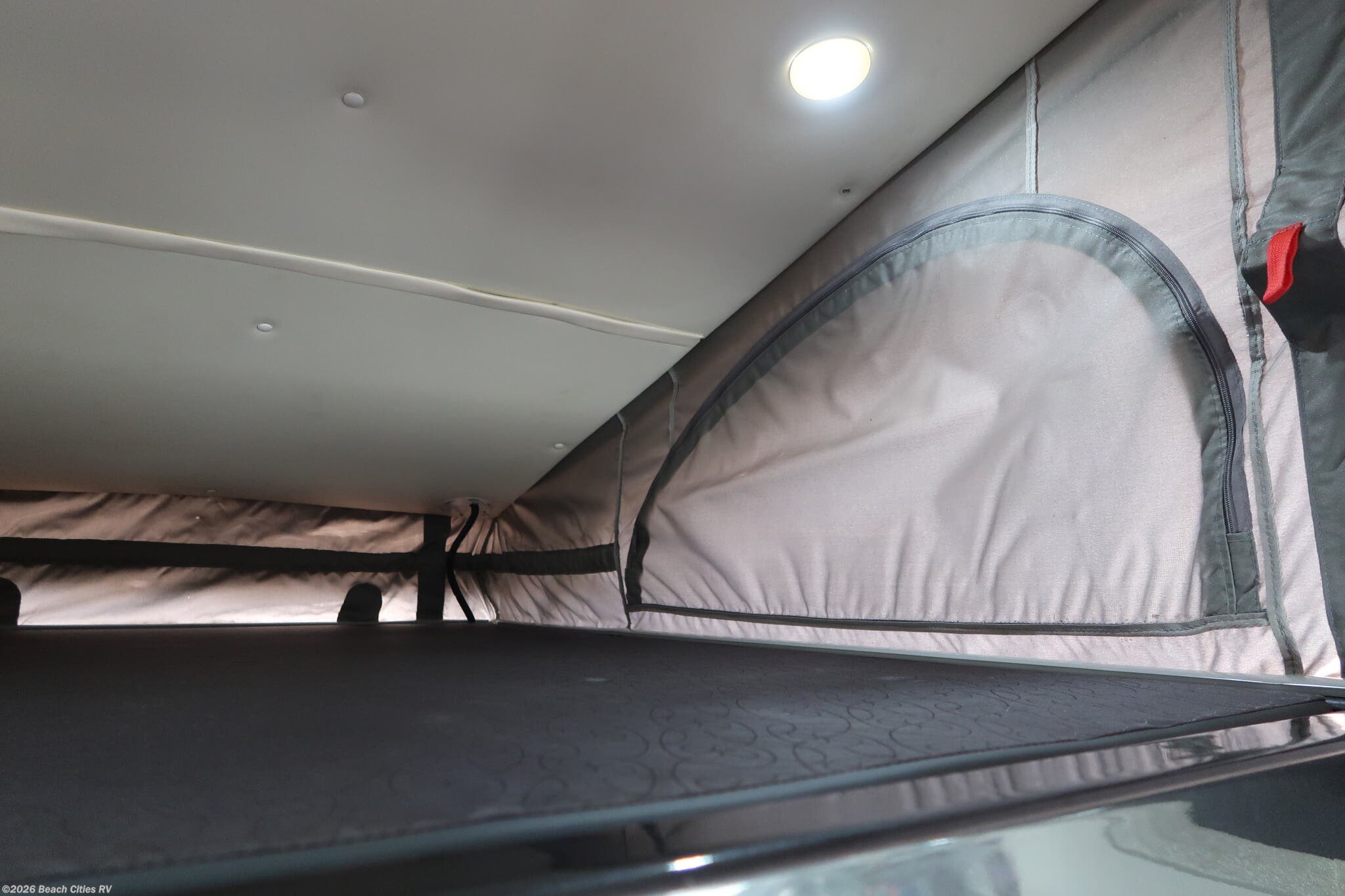 It sleeps 4, with a sofa that converts into a large queen bed, and a pop-top loft that sleeps 2! It is equipped with an induction stovetop, furnace, sink, LED lighting, 200w lithium battery system with solar panel and charging system. It comes with a rear water port and hose for a quick shower and a front, side and rear screen package and a roof rack.