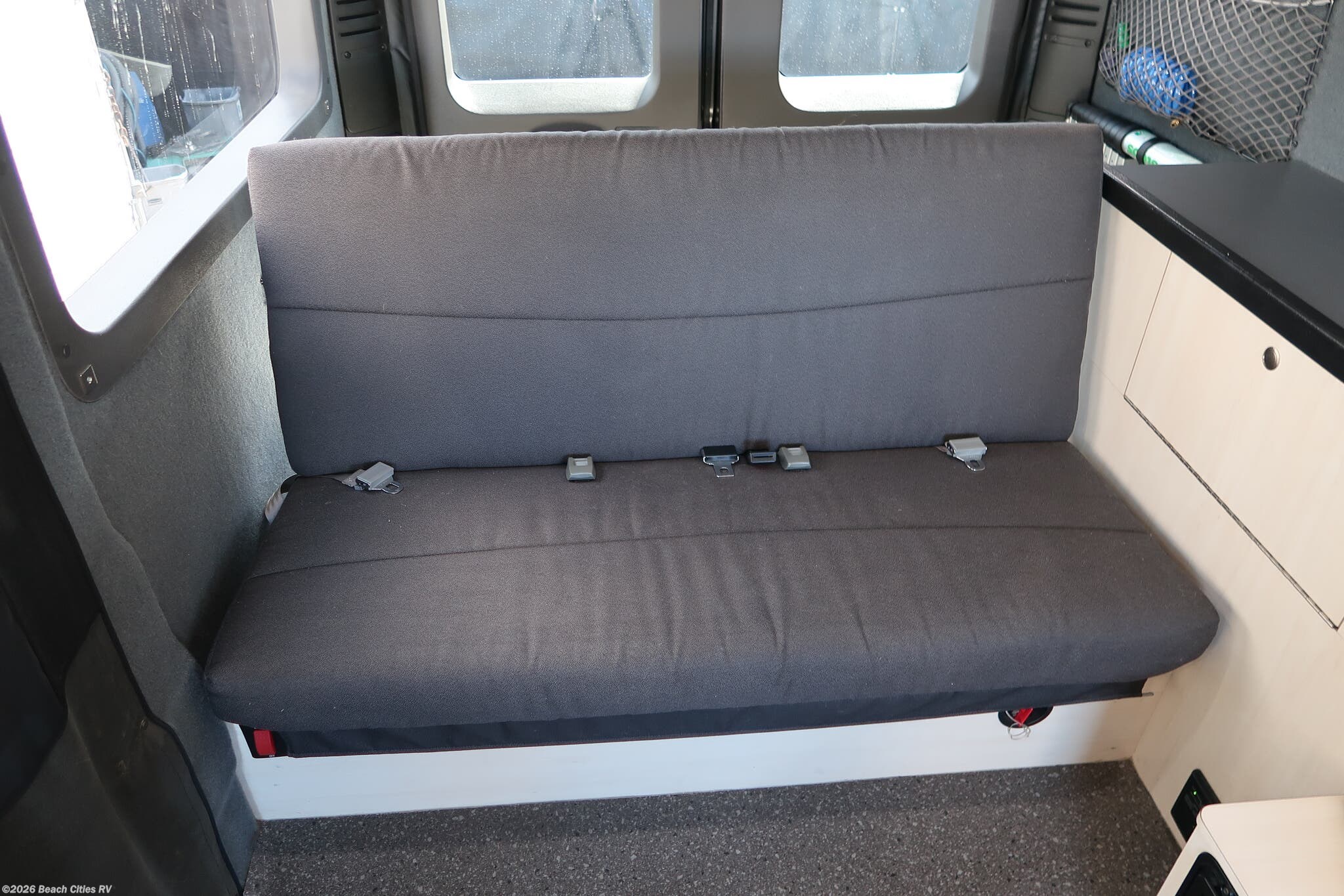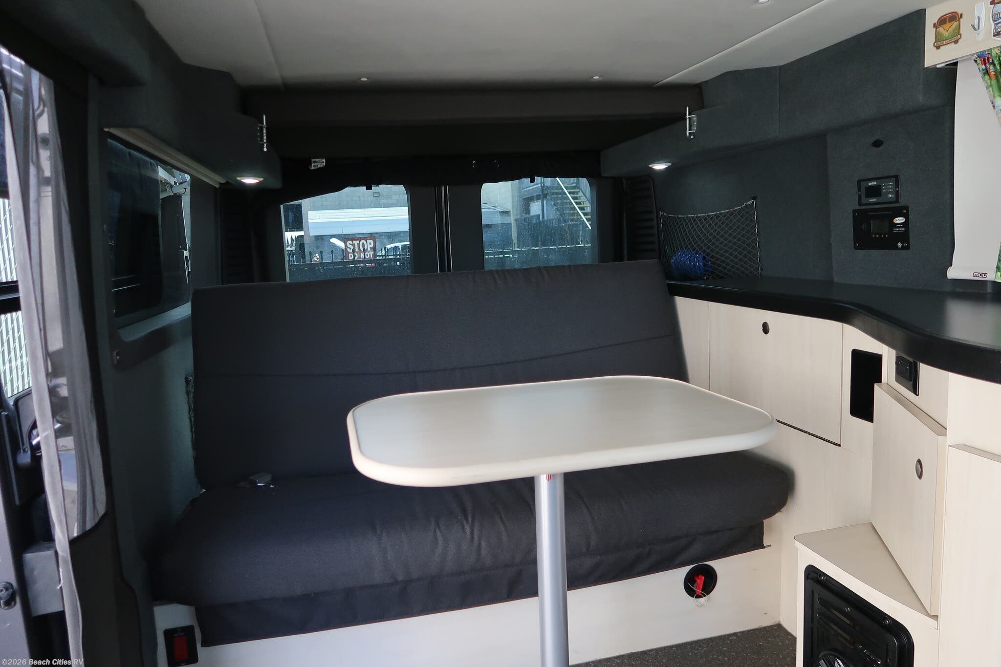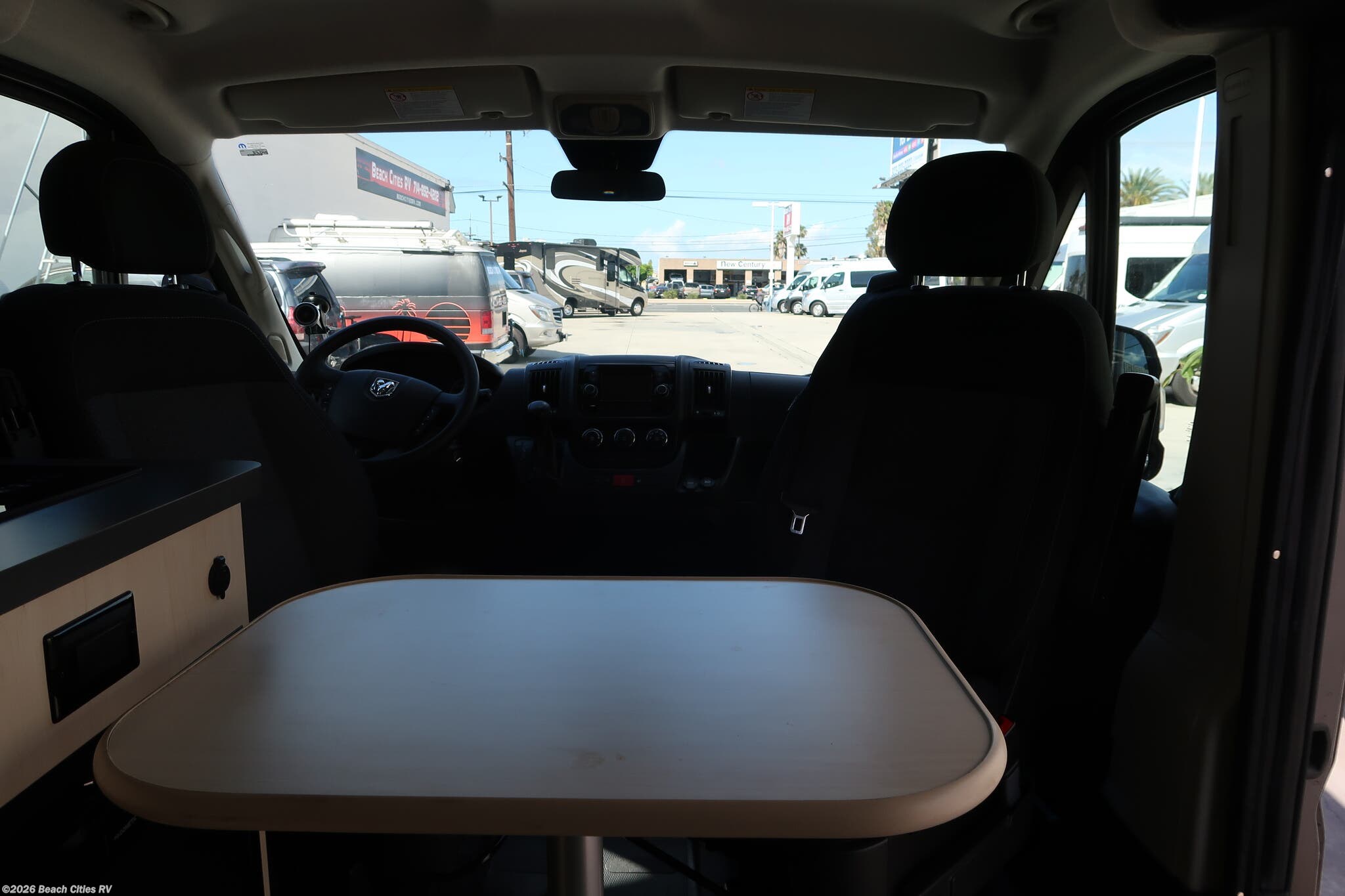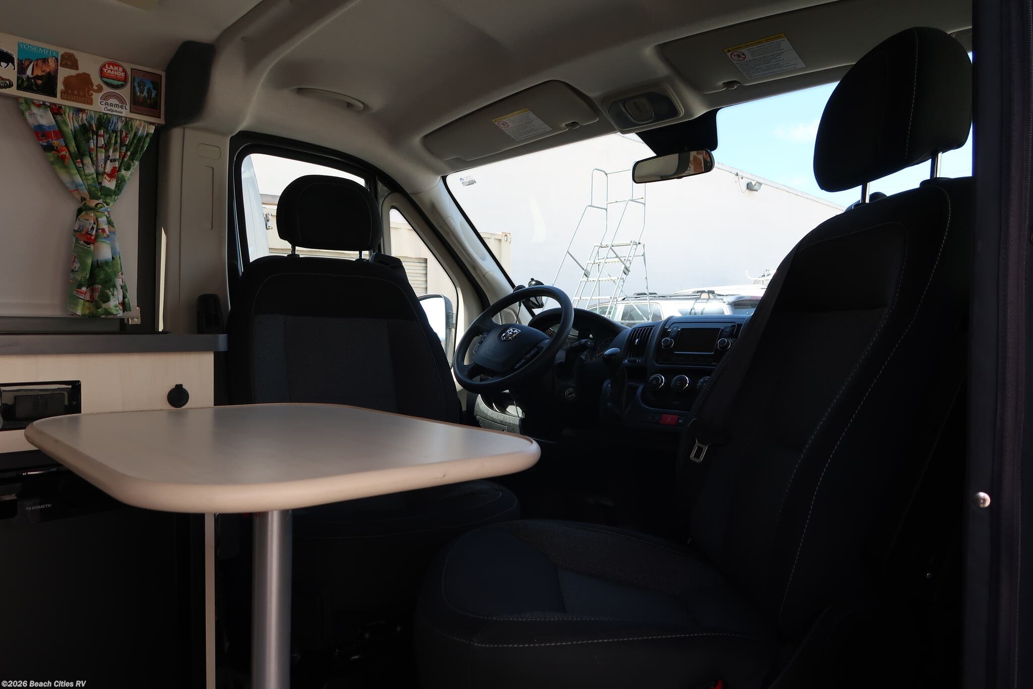 The front captain's chairs swivel and the portable table can be stowed away or set up as a dining area by the couch or as a front eating area.