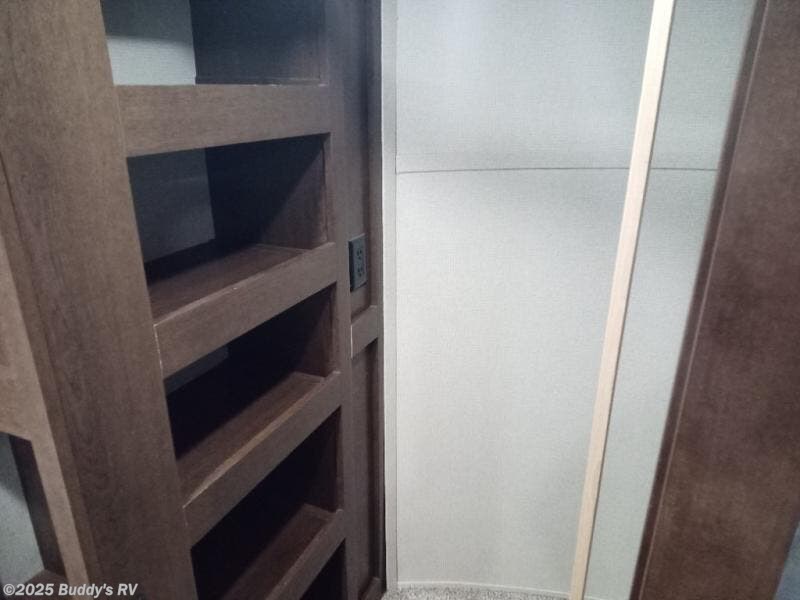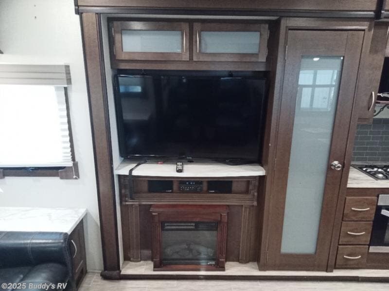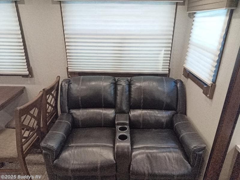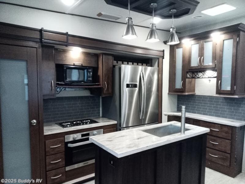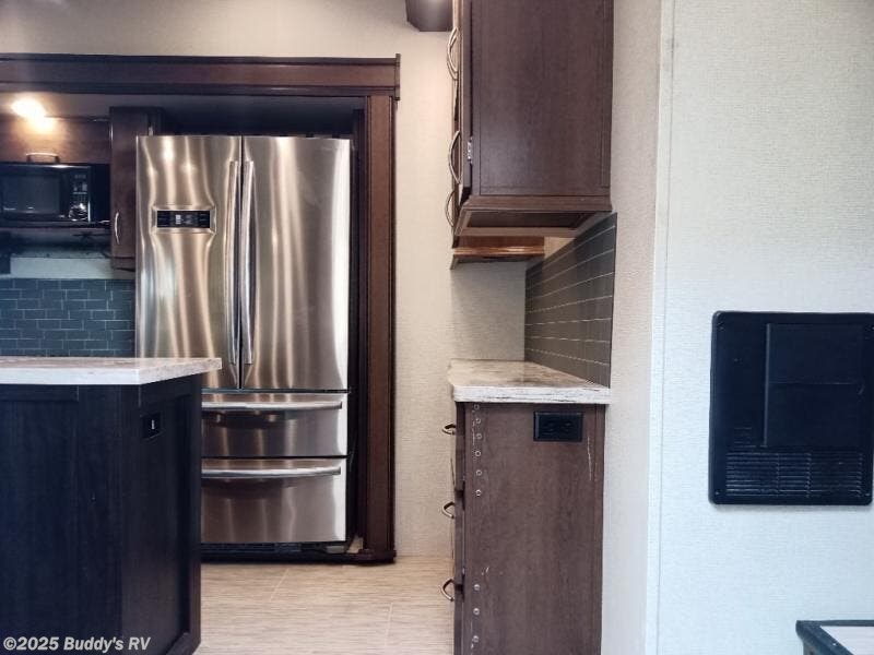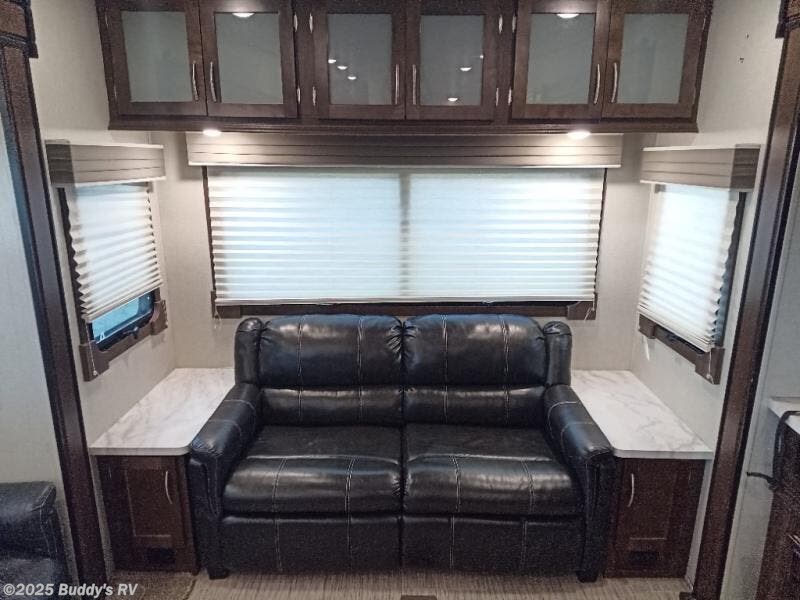 This fifth wheel is a great fit for your family of four looking for a fun and relaxing camping trip. The three slides in this unit make the living area open and spacious like you're used to at home. Mom and dad will appreciate their front private bedroom with a large wardrobe, and a place for an optional washer and dryer. The kids will love to crash on the hide-a-bed sofa at night. This fifth wheel features a kitchen island with a deep single bowl stainless steel sink, a residential refrigerator, and a large pantry for dry goods. After you've spent your day outdoors, clean up in the 48" shower, grab some popcorn and a drink, and sit back on the theater seats for a show with the family for a relaxing evening. Come check out this fifth wheel today and you'll be glad you did!