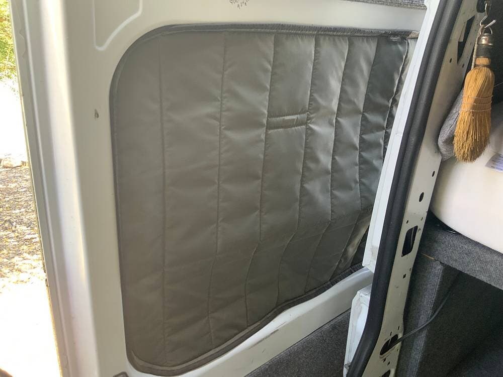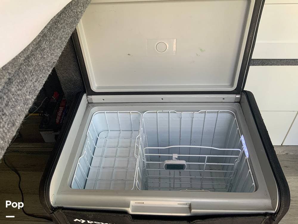 Inside, the van features a full-width bed platform with mattress, overhead lighting, and custom-built cabinetry for storage. A 12V portable fridge/freezer is integrated into the electrical system for food storage during travel. The layout is simple and functional, with durable flooring and open interior space.