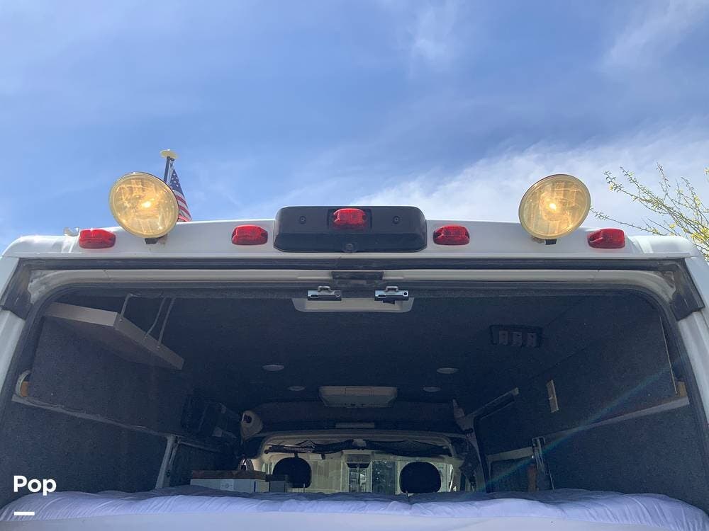 The exterior includes rear-mounted auxiliary work lights, a Draw-Tite hitch receiver, and a 7-pin trailer wiring connection for towing or carrying additional gear. The van is fitted with Goodyear Wrangler Workhorse AT tires with recent date codes. The undercarriage shows typical wear consistent with age and use, with no obvious damage visible in photos. As with any custom conversion, buyers are encouraged to perform their own inspection to verify condition and operation of all systems.