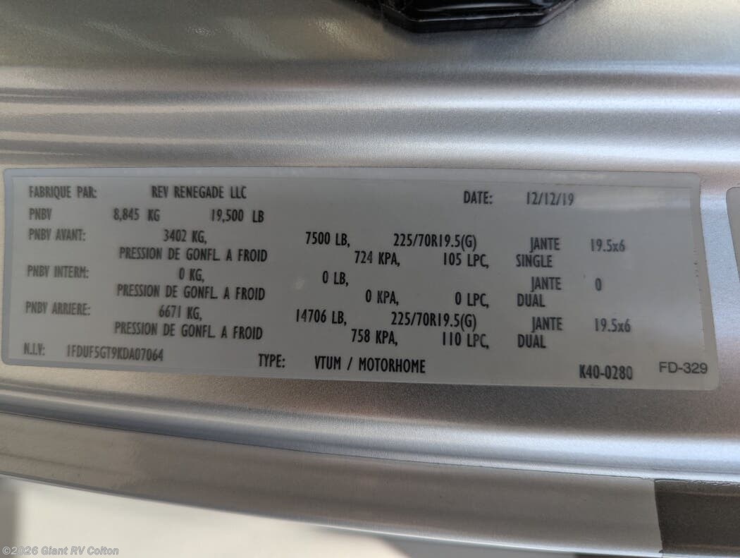 Hit the road with confidence in the 2019 Renegade Veracruz 35FWS, a robust Super C diesel motorhome available at Giant RV! Built for adventurers seeking power and comfort, this model features a full-wall slide-out, rear private bedroom, and a cabover bunk, offering spacious living for families or groups. With its rugged Ford F-550 chassis and high-end amenities, the Veracruz 35FWS is perfect for off-grid exploration or cross-country journeys. Visit Giant RV in California or browse our online inventory to secure this 2019 Renegade Veracruz 35FWS today!